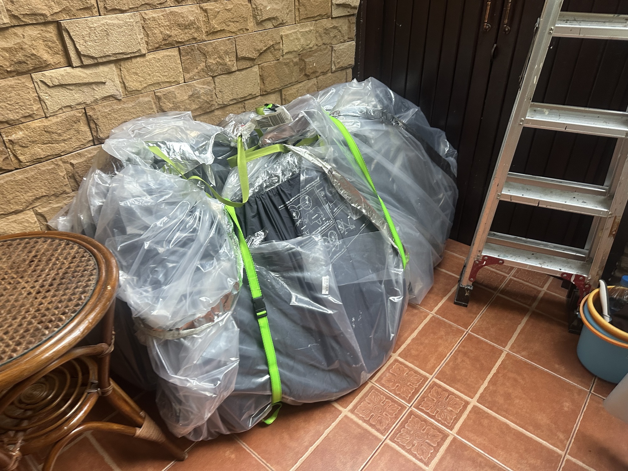 And this is where the rinko bags came in, and finally proved their worth. We sheathed the bikes in bubble wrap, inserted them into the rinko bags (which fit much better with the bikes more completely disassembled, fenders removed, etc), and then gift-wrapped the whole shebang in giant sheets of thick plastic decorated with duct tape.