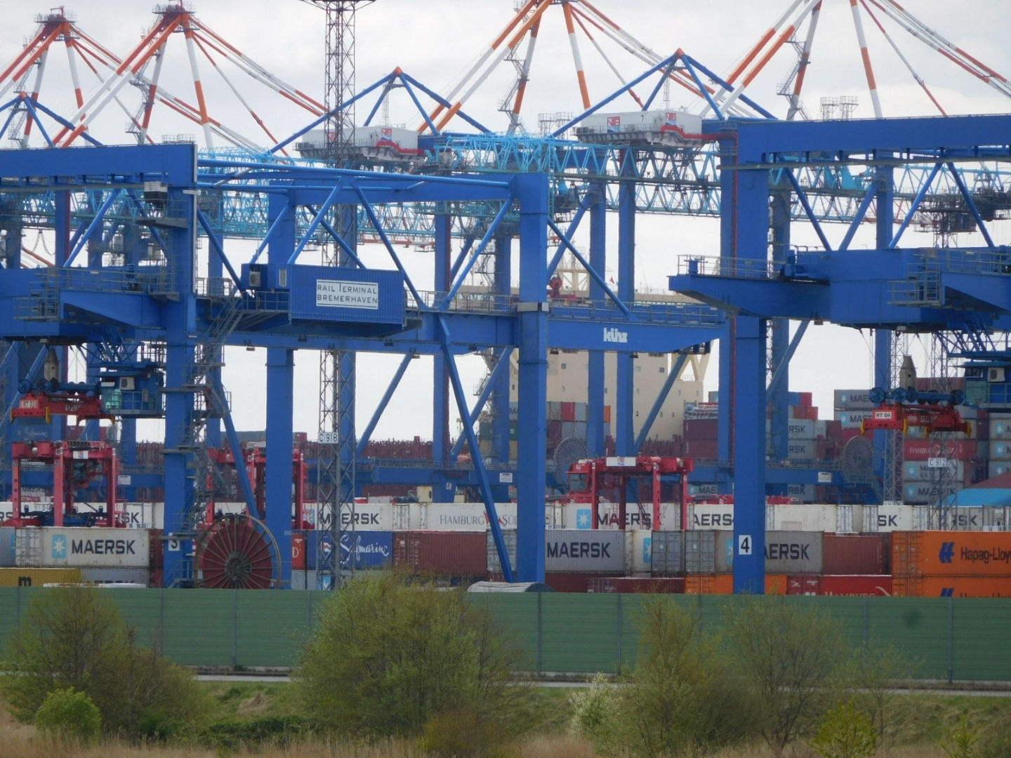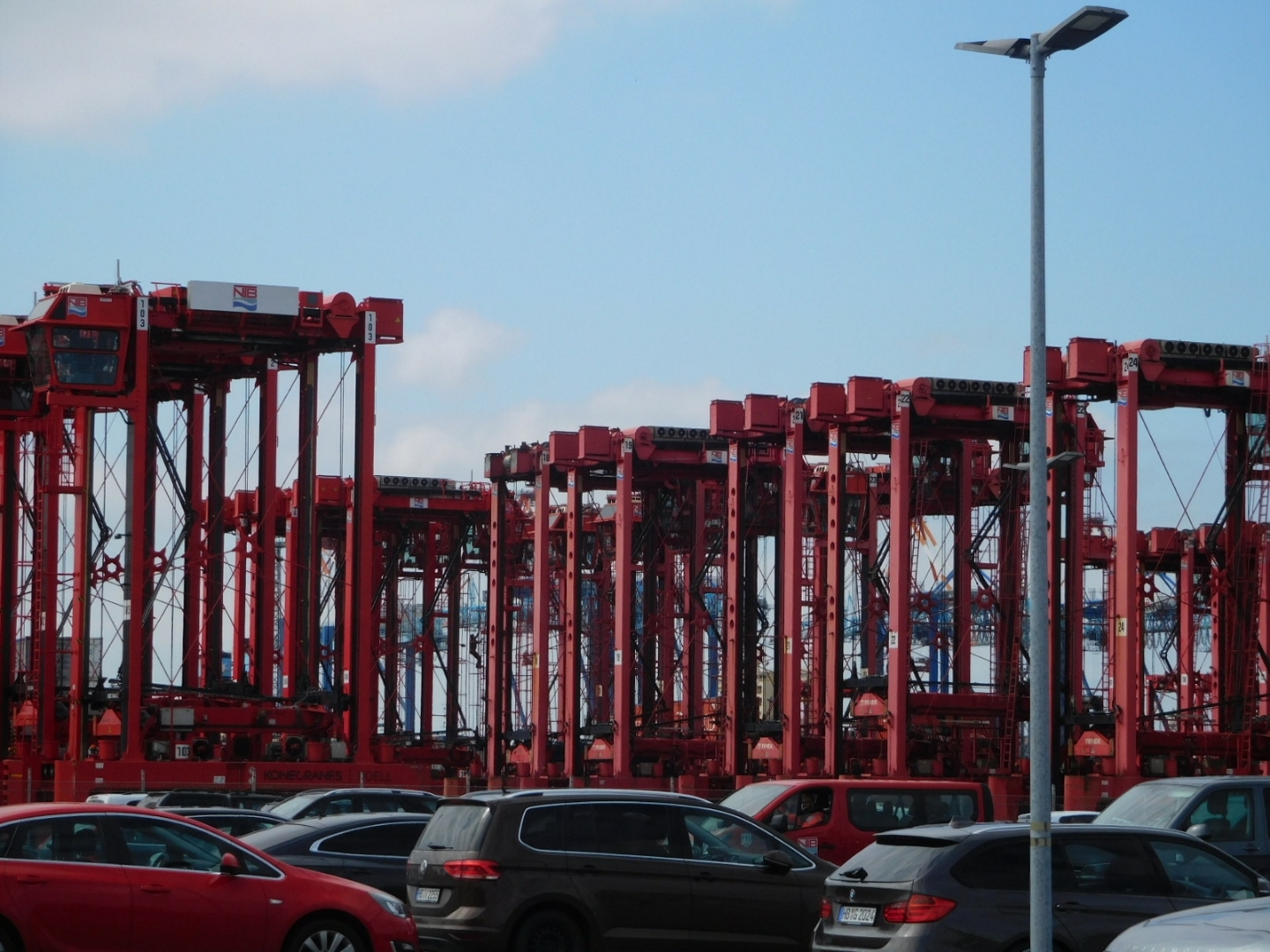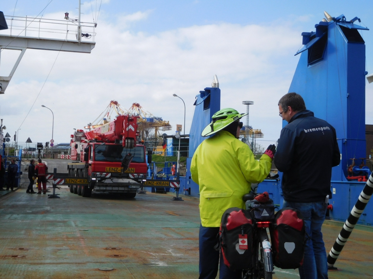 Our first indication of reaching the Bremerhaven area was the appearance of a lot of crane or lift type structures by the water. These seemed like they could be automated, though there could well have been human operators. Whichever, dozens of devices on elevated tracks were buzzing around, seemingly grabbing shipping containers and dropping them onto waiting ships. We were riding at a bit of a distance from them and could not see exactly what their game was, but it still looked impressive.