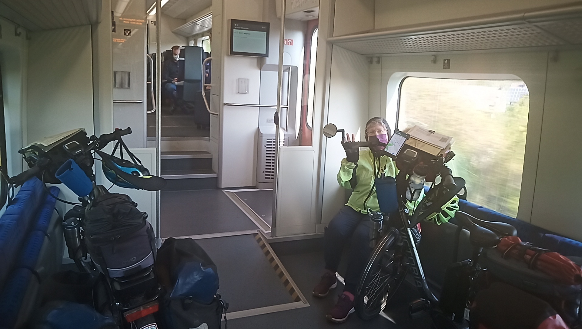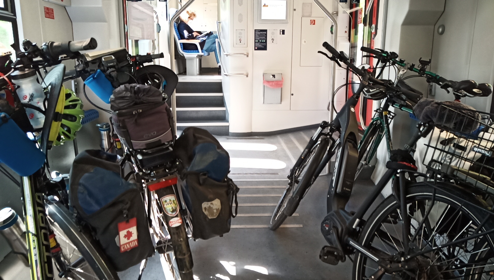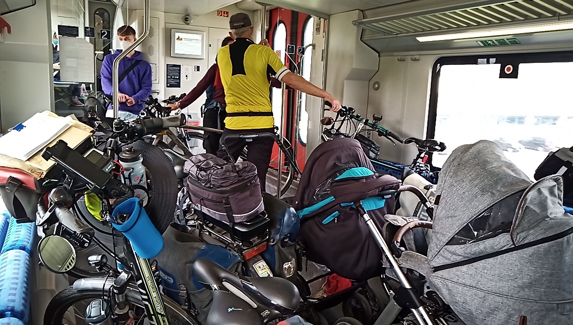 More stops and a change of train, and bicycles were joined by baby buggies. Still everyone was amicable and it was no problem. This changed a bit when a middle aged man came barging along the corridor from where his bike should not have been, and began trying to jam it between Dodie's bike and the side of the train.