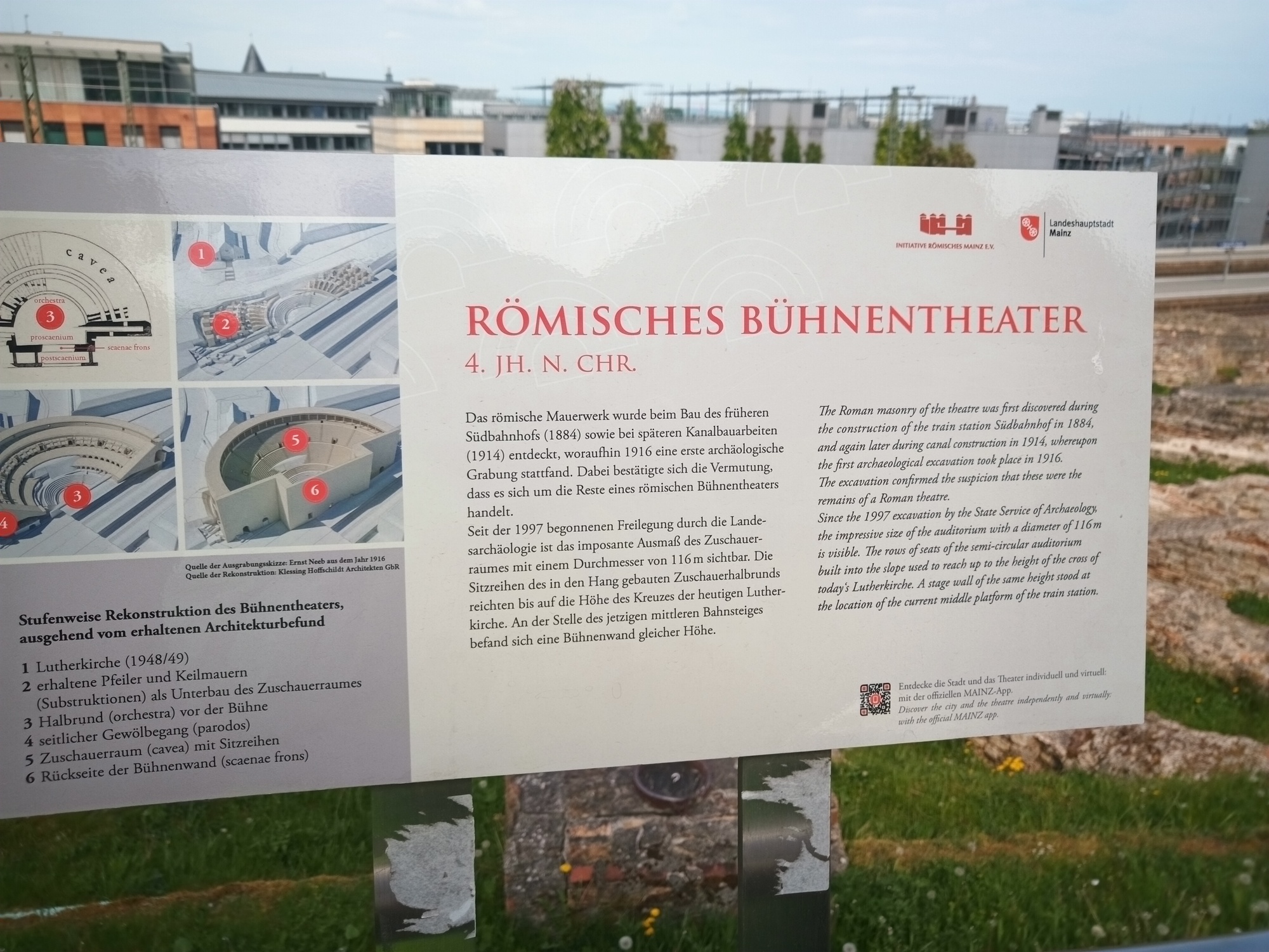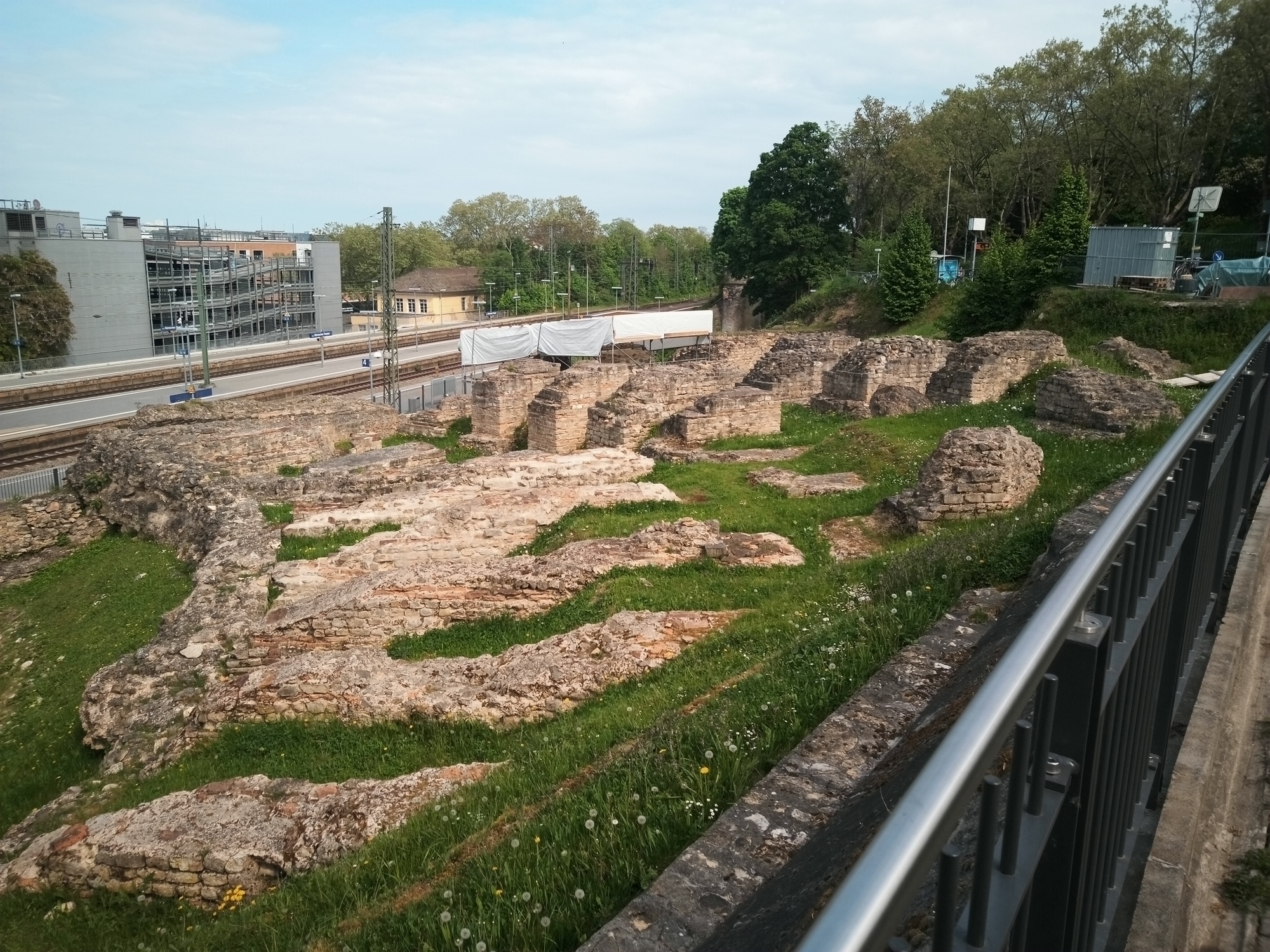 For some reason the GPS was not updating very quickly and not showing the direction of travel well, so it took us a while to reach the Dom square. This was our third time there. The first time it was filled with a giant farmers' market, and there was a lot of excitement, as we sat at the Dom Cafe. The second time it was empty, like now, but I think we also sat in a cafe, with another cyclist we had met. This time we seemed to be quite tired from the train rides, and just ticked off "Dom" and headed for the hotel. Heading for the budget hotel we had chosen meant cycling up a hill. (Hey, didn't we jump 300 km to avoid that?) The hill is called Jakobsberg hill, and includes a citadel with a long history in the defence of the city. It turned out the hill also includes an uncovered Roman ampitheatre. You should be able to zoom and read some of the story. It was first discovered in 1884 during excavation for a train station. There is now a Roman/German museum in this area as well.