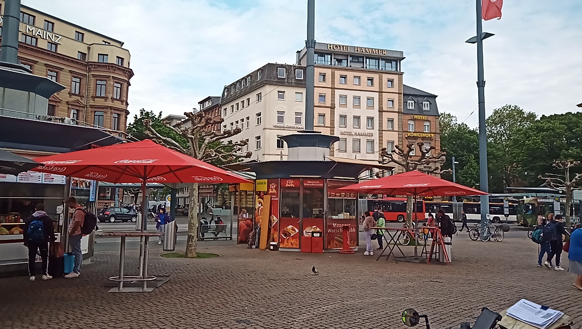 We climbed the (of course) hill to the bahnhof (how do the trains get up there?) and arrived about 8:30. We already knew our train would go at 9:21, but the station house did not open until 9. We used the time to check out the ticket selling machine. It was quite undestandable, because it had an English option, but it did not offer details about changes of train, times, and suchlike. The machine quoted 118 euros to take us both to Mainz, and did not mention bicycles one way or the other.