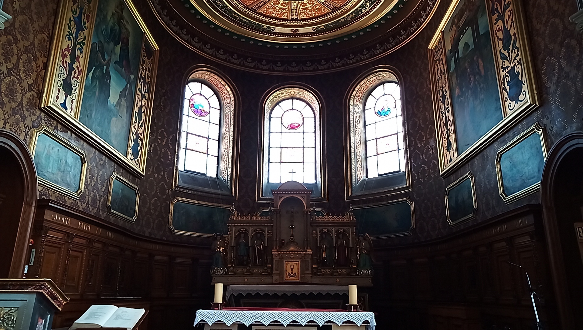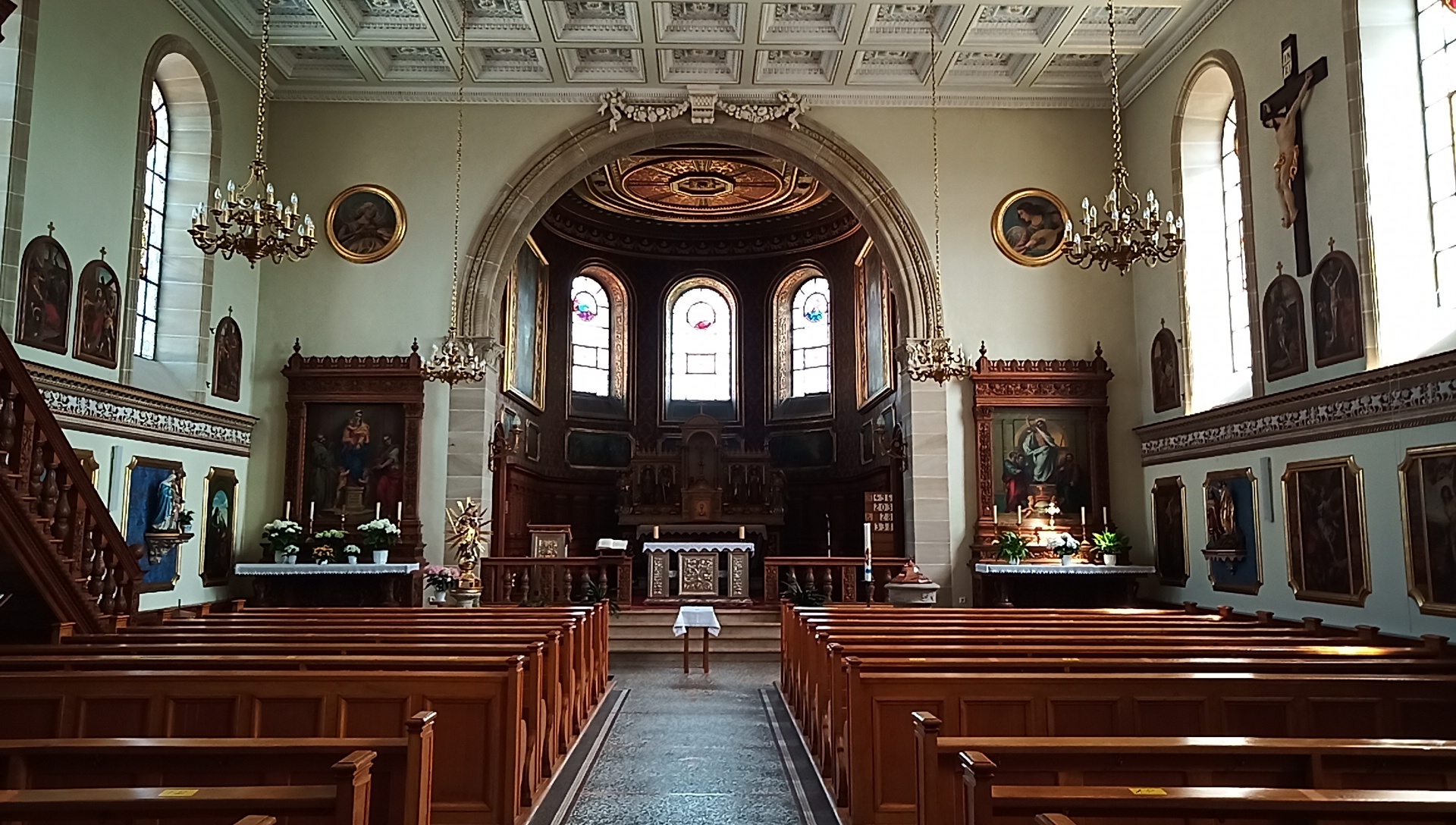 Beyond pastries, another fancy thing we can look forward to hereafter is churches. In Beinheim, we stopped in at one, that had a very plain exterior, but was quite nice inside. As usual, though this was Sunday, there were no actual parishoners or priests in evidence.