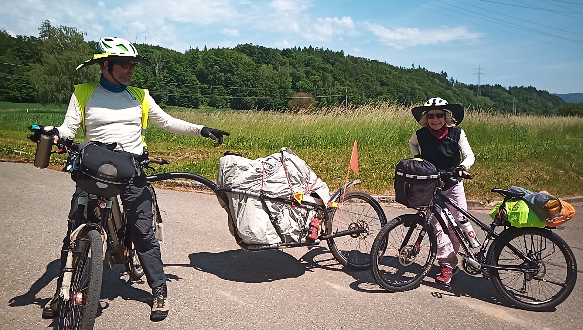 Before Bad Sackingen we met a Swiss couple that were sporting Da Brim visors, like ours except the larger size. They said hey got them online, but that they can be found in Germany although at high cost. These were some of the few touring cyclists that bothered to stop and talk to us. Georges, as I think the man is called, said he favours talking to people. Maybe, he thought, you could say something that makes their day, maybe gives Meaning to Their Life for that brief moment. He has a web site that yet to figure out. It's www.bycycle.ch