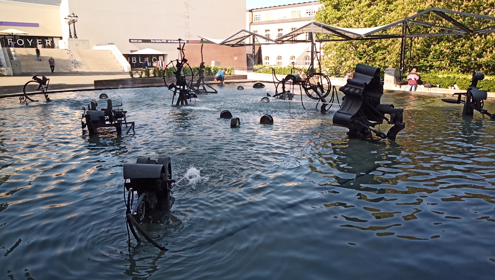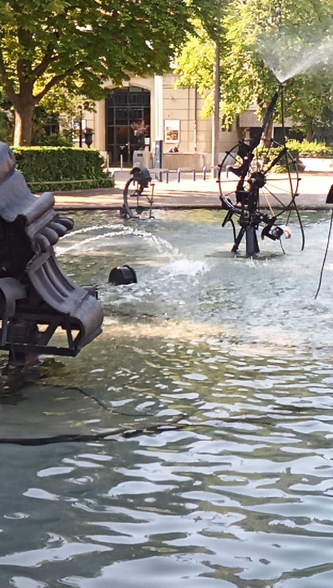 We left the market square with no goodies purchased. Deciding we had had enough fun, we headed for the exits. Of course there were still things to see, like in the four photos below. The fountain of goofy moving iron spray parts was fun, and relief from the rest of the city, which seems to lack any parks, or almost any trees.