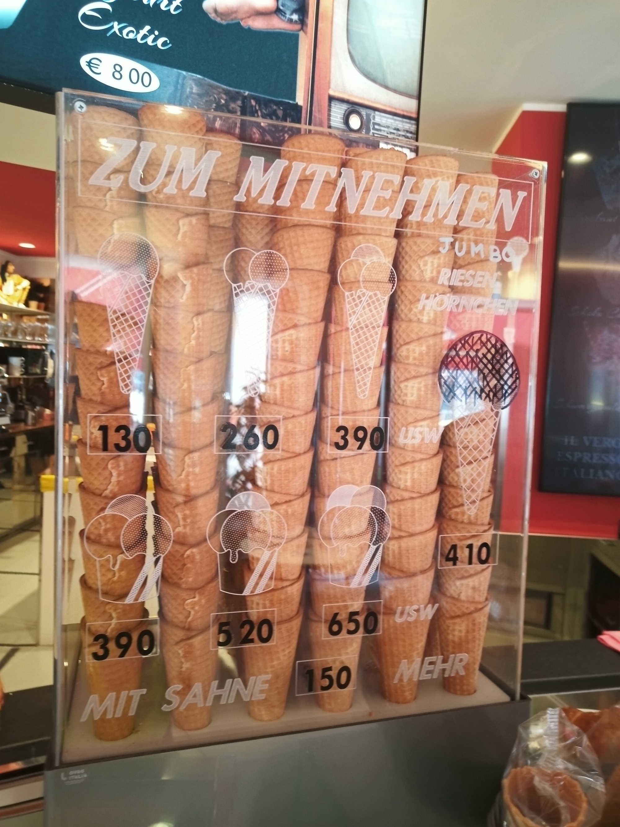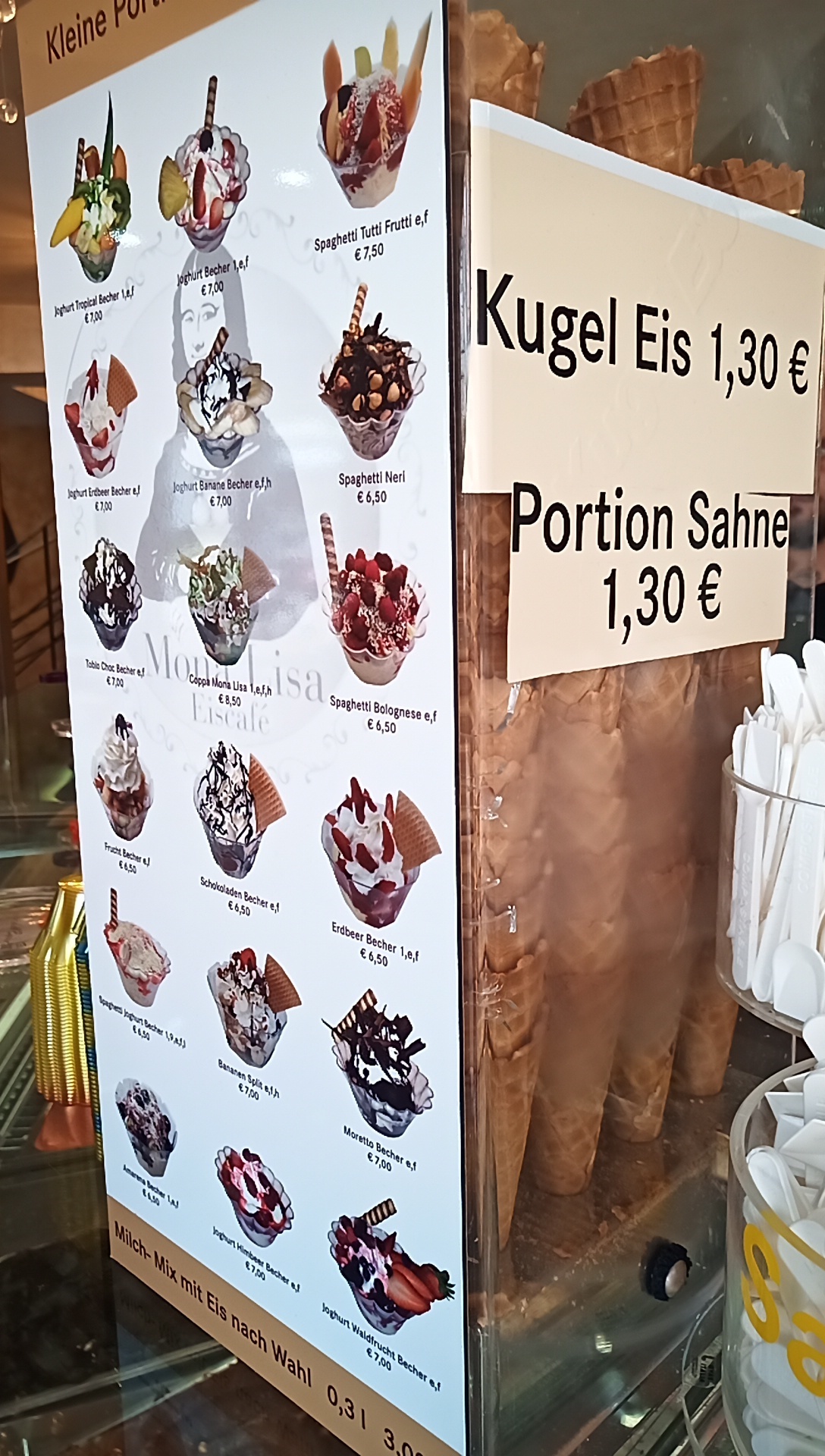 Since we were back in Germany at this point, I made it a point to check out the eis price. My brother in Quebec on reading this blog went out to get some ice cream near where he and Francine live, in Montreal. They paid $5.86 (including tax), but he did say the scoop was generous. Here is my evidence from today: