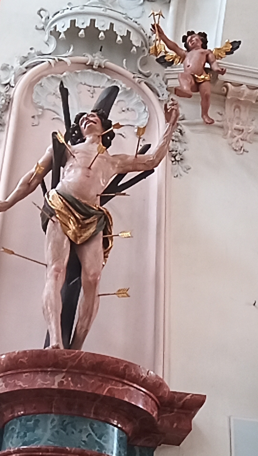 I was really just looking for cherubs to photograph, since they are one of my metrics on how well a church is decorated. But here I alsoo got St. Sebastian. According to Wikipedia: