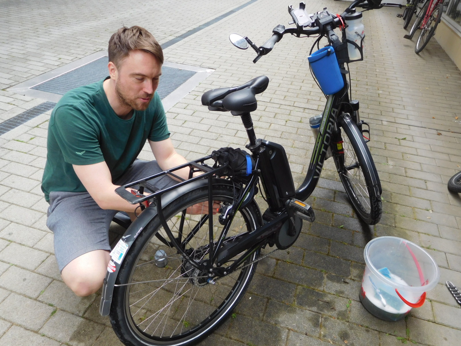 While Manni and I were working on the bikes outside, he got a call from Kristin, who was downtown. I asked for the phone and said, or thought I said "Kannst du zum Bäckerei gehen und Erdbeerschnitten kaufen?". Kristin asked for Manni back on the phone and apparently said the equivalent of "Why is this guy blithering about 'batteries'". I guess I flunked my first interaction with my teacher. However, with Manni's help, this did show up: