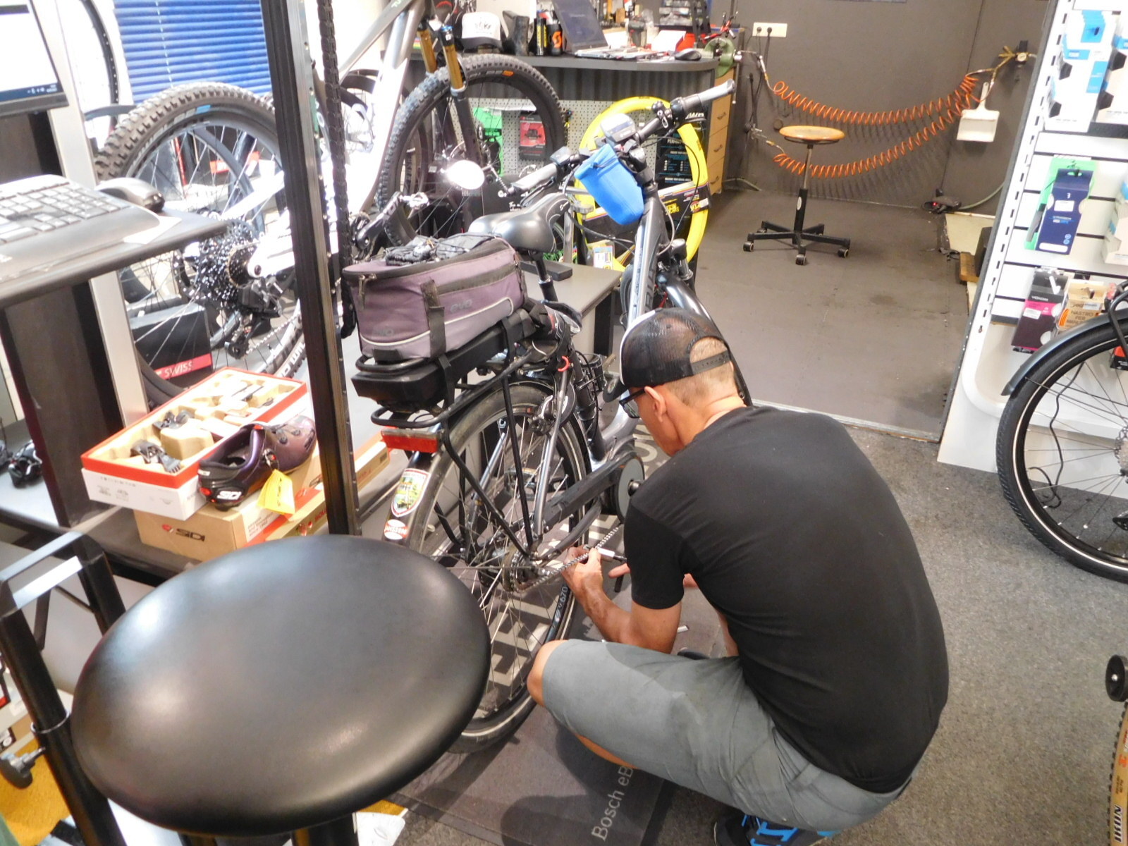 One of the major chores for today was to clean and refurbish the bikes, including changing brake pads and cleaning and lubing the chains. Manni detected a spot on my chain where the links were frozen. This is a common problem when installing chain - the pin that get driven in to link the free ends of chain can produce a glitch. Usually this can be fixed by twisting the chain or by driving the pin back and forth a bit with a chain tool. But Manni and I failed to get results.