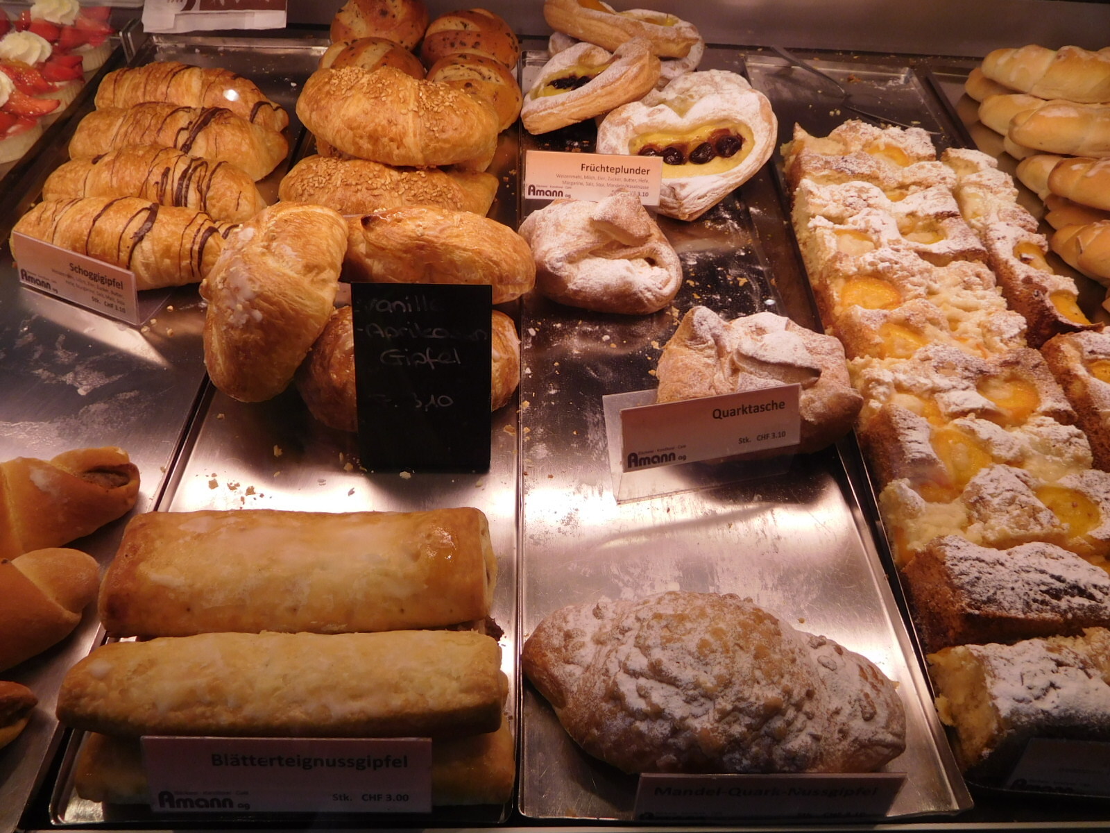The currency in Liechstenstein is the Swiss Franc. After our restaurant extravaganza the night before, we had only a handful of coins left. We tallied them up and came to about 8 francs. "Great", said I "We can go to a bakery". But Dodie declared the intention of taking our precious francs to buy postcards. She did that, but came back still with over 5. she had also found the washrooms (WC) and told me the secret of where they were. So I was sent off on a dual mission - visit the WC and go into a konditerei with our remaining 5 francs.