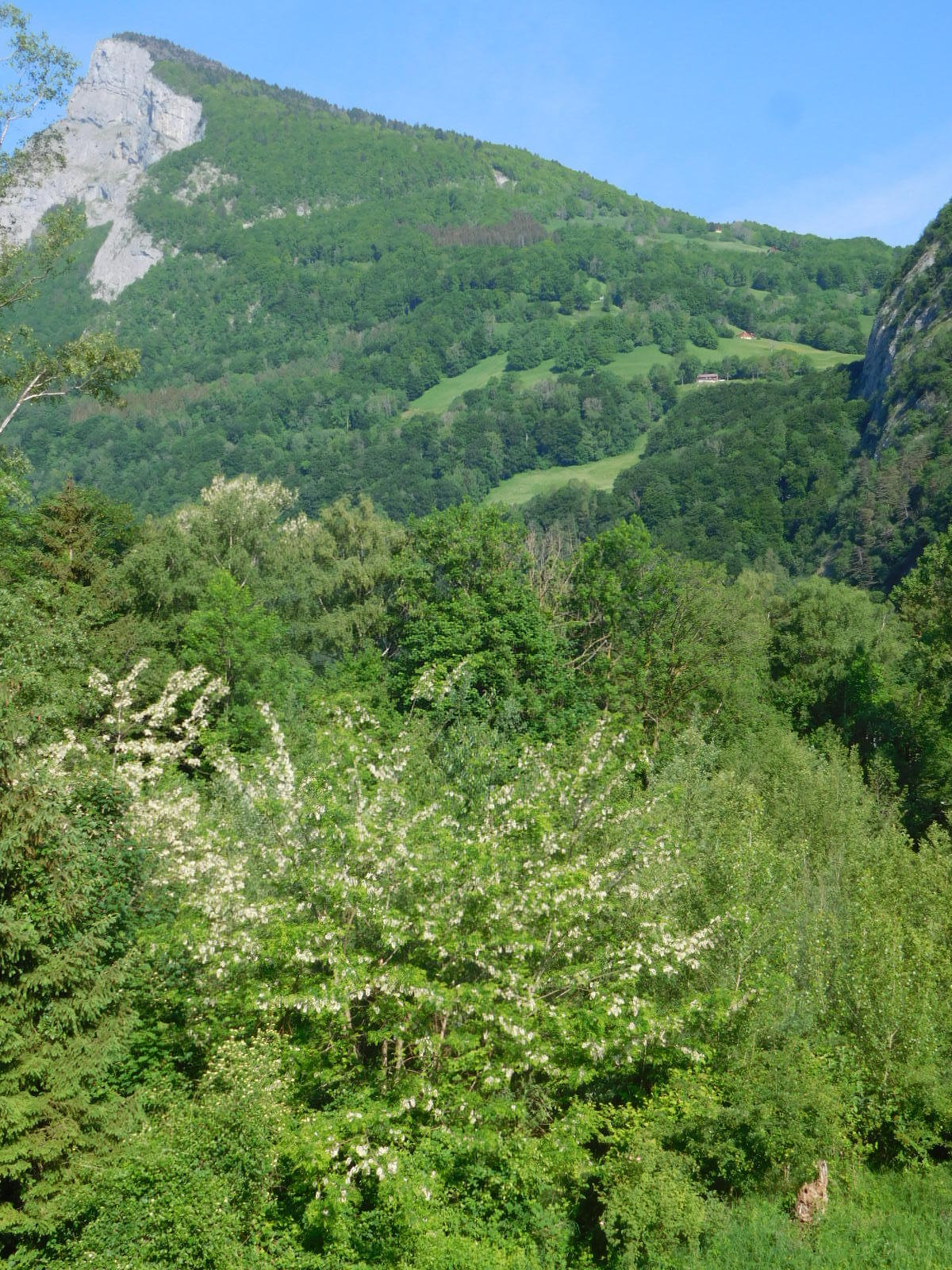 Back on the river, we had a long time to watch these two peaks approach. We were most interested in the alm between them, and in looking up to the highest huts.