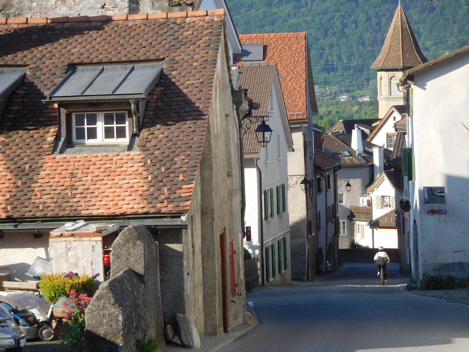 We began with Maienfeld, and there so did our small problems with the day's plan. Maienfeld can be interesting to look at, as you see from the photo below. It also has narrow streets, so one should be able to peacefully hang out and look for the good photo angles, without having to cope with traffic. And yes, this was generally true, except that about once per 15 seconds a car would come trundling along, usually too quickly, and scatter anything in its way.