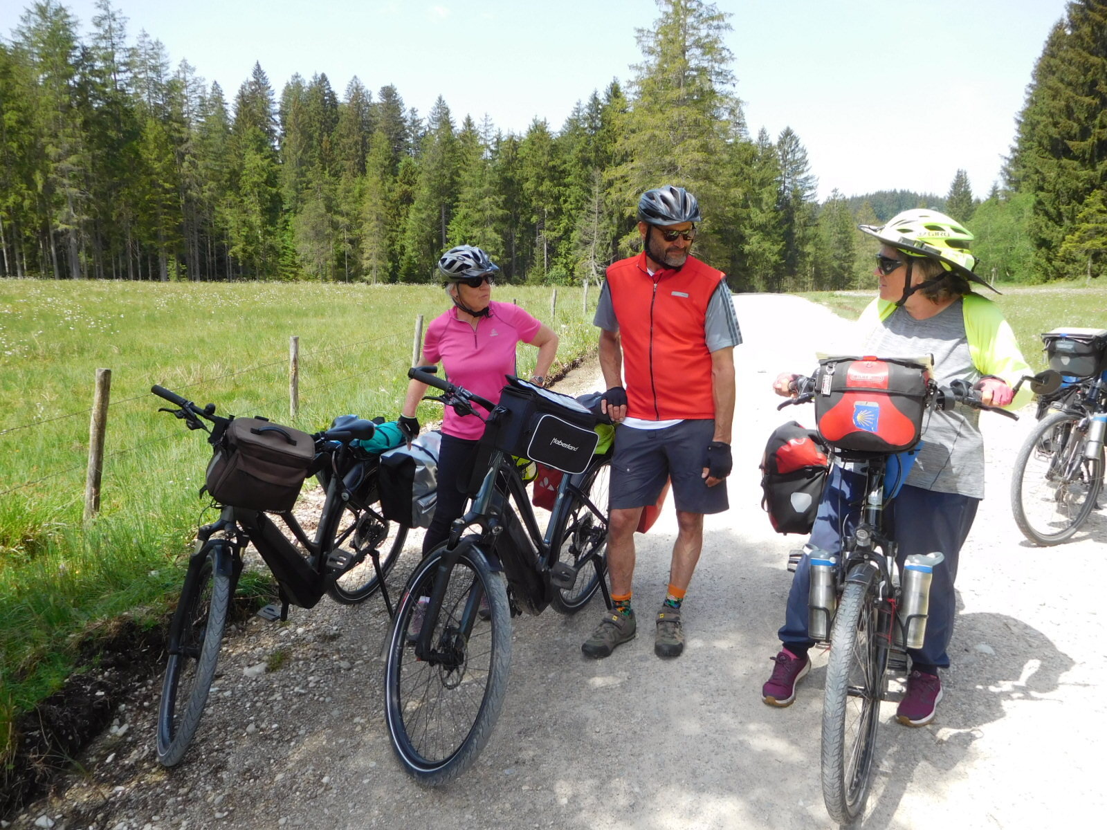 The first part of our ride today replayed exactly what we did yesterday. It was still beautiful, and the cows were glad to see us, but with it now being Monday morning, the sites of yesterday's excitement were sadly deserted. One thing that was a little different was that several sets of cyclists paused to chat. The ones we talked to were all doing the Bodensee-Konigsee in one direction or the other, and all were German, having used car or train to come from their homes for the adventure. Of course topics ranged from where everyone was from to what gear we were all using to how far we were going in a day. A big one is always our DaBrim visors. Everyone wants one, and many take a photo of the name so they can later find it on the Internet.