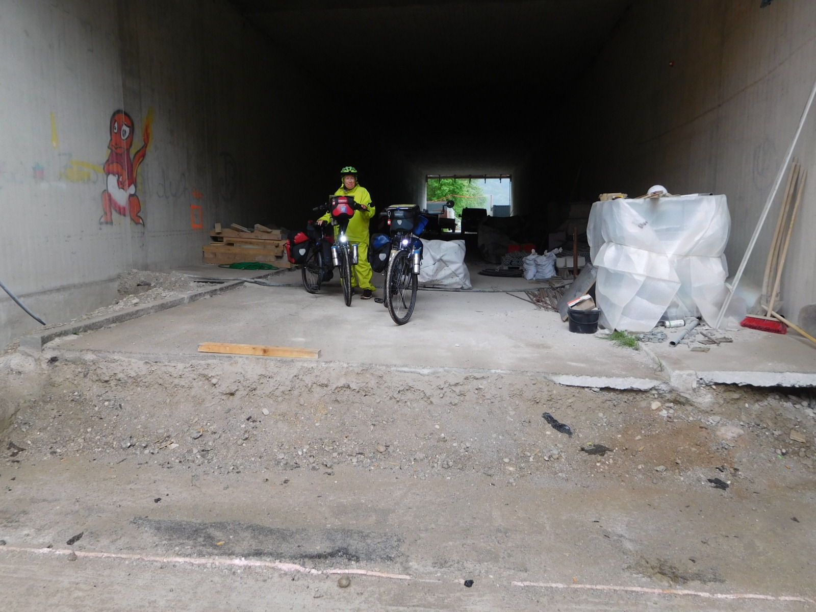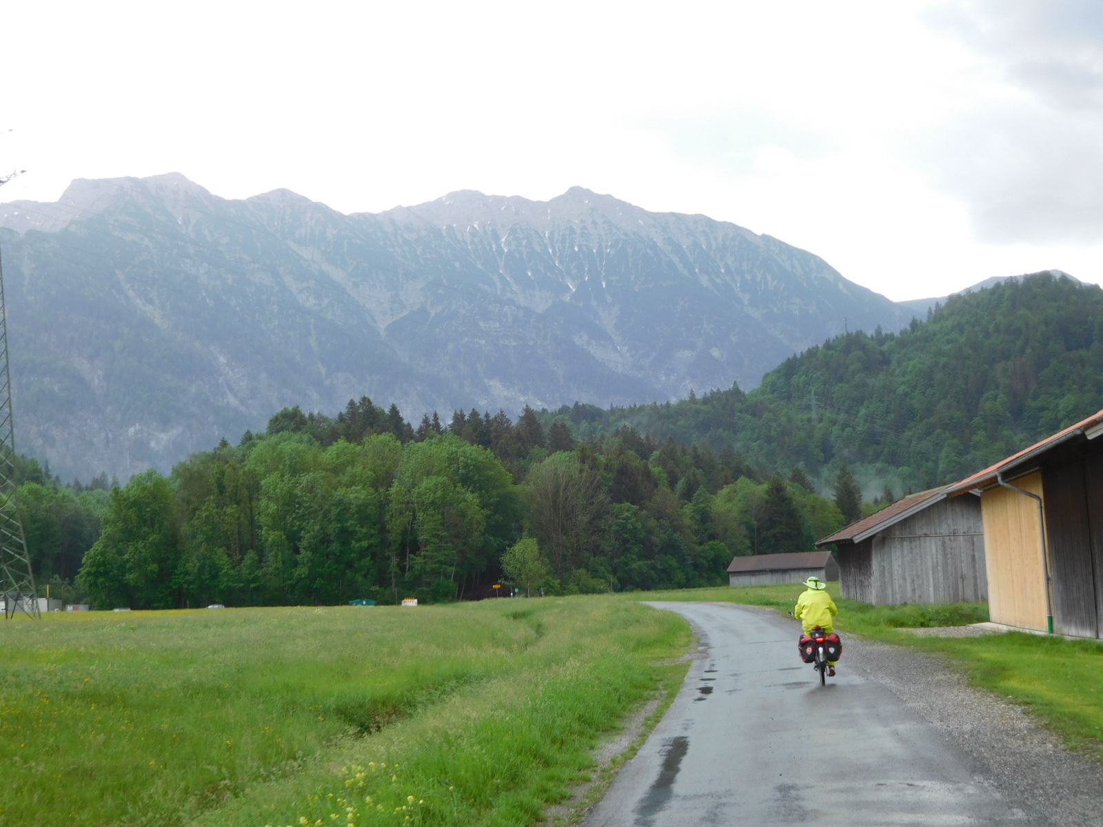 When we saw the threatening clouds over the nearby Alps, we stopped and put on our waterproof pants. Then shortly, the rain jackets, just as it began to rain heavily, with matching scary thunder.
