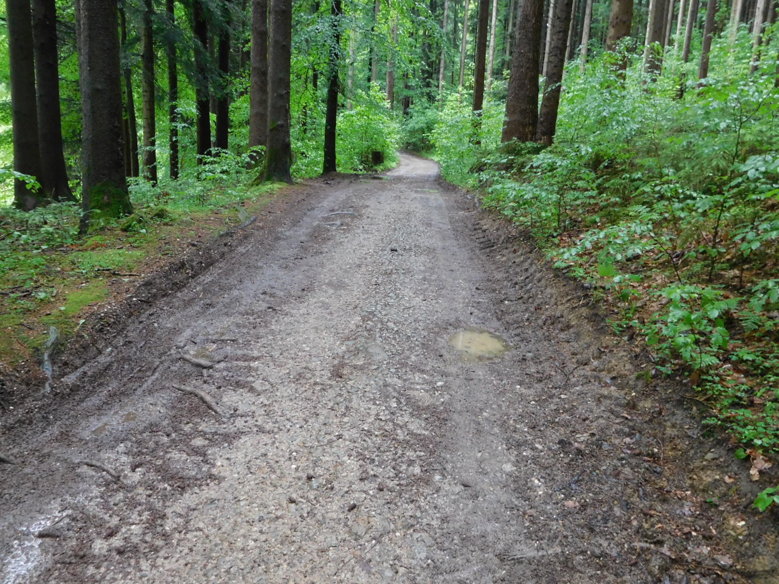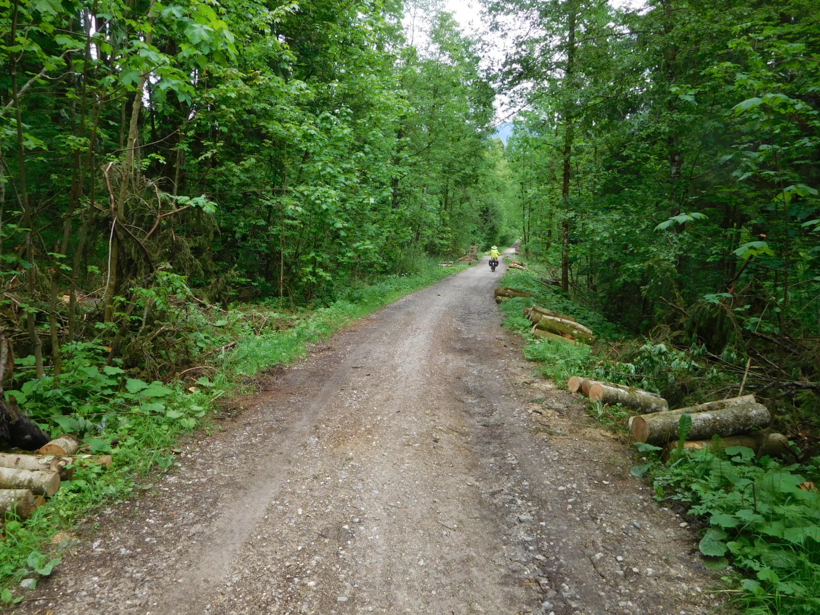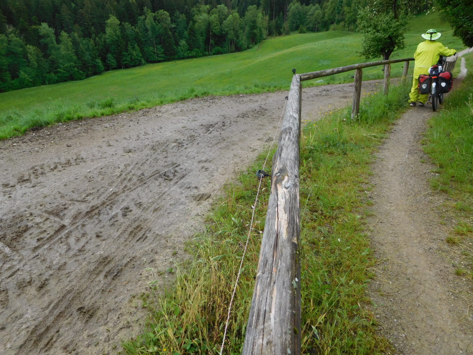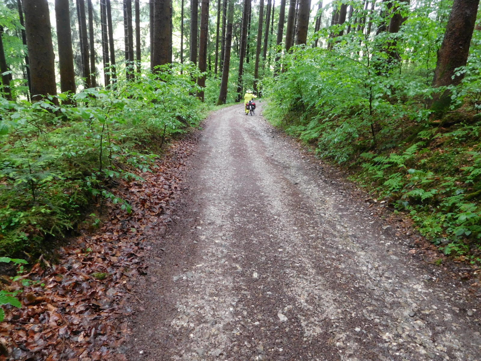 Around now began what would be the dominant theme for our day: steep climbs and descents on wet gravel. We had set a relatively short day, which was fortunate because progress in such conditions is slow. Ebikes notwithstanding, we had to push up quite a few sections. And not wanting to wipe out, we walked down some too.