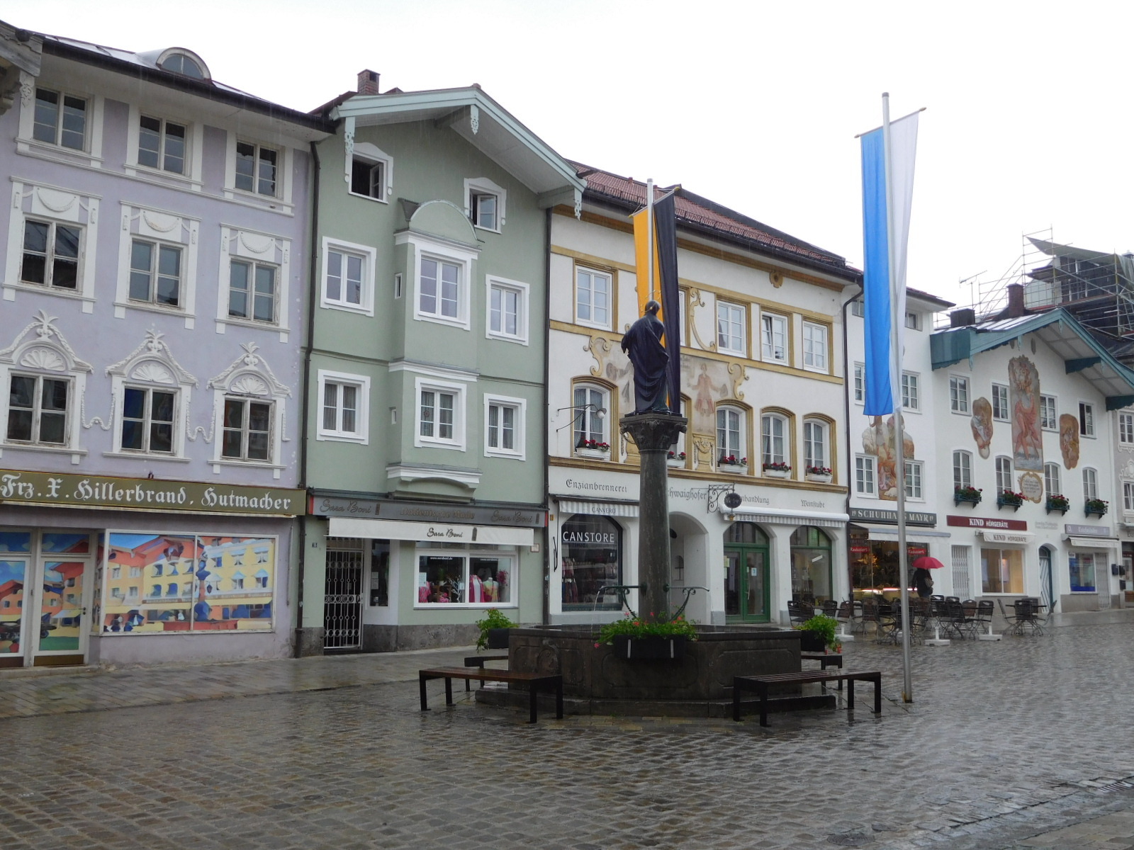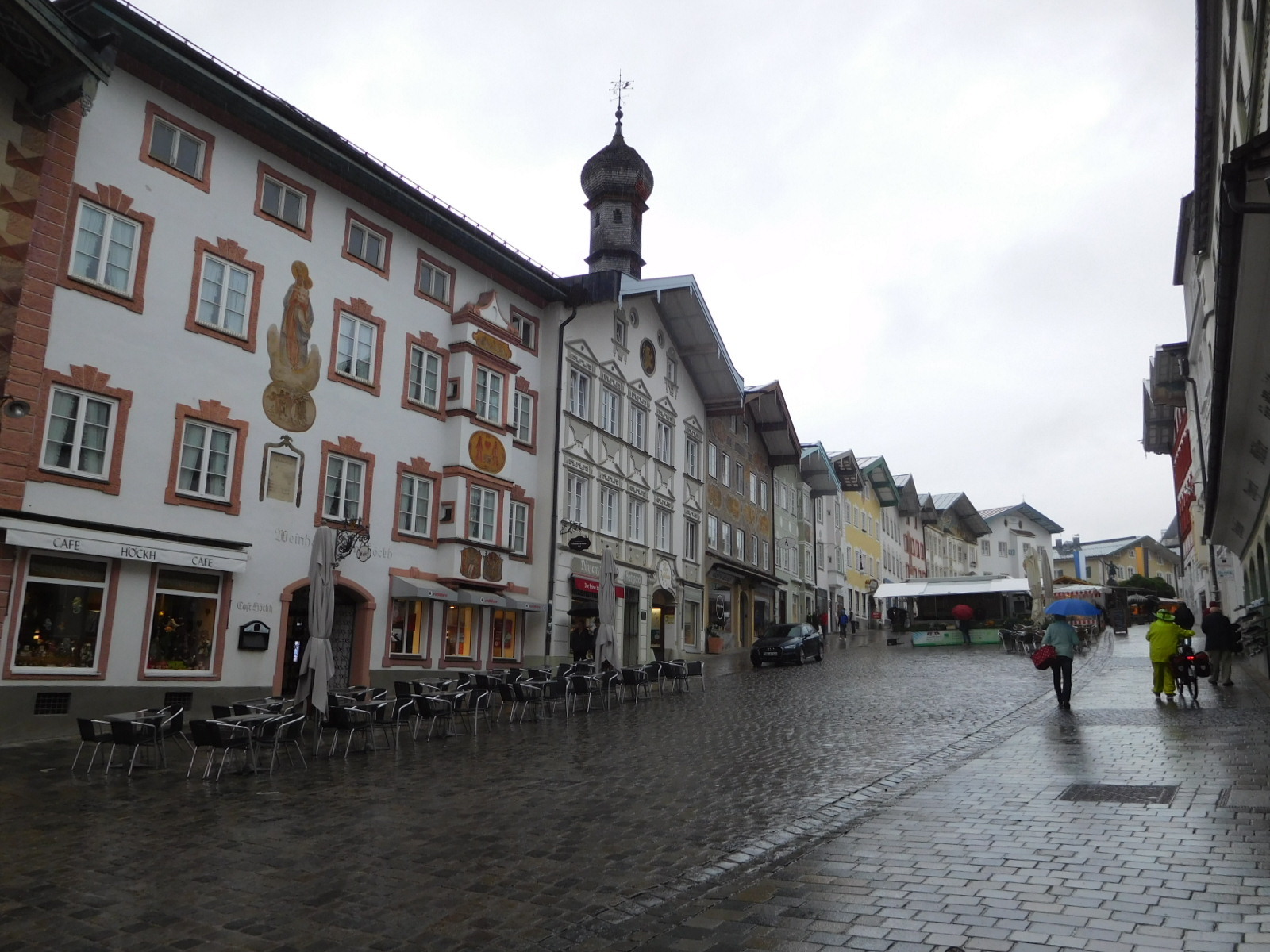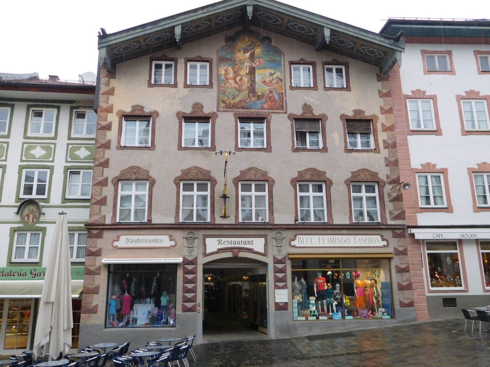 Our hotel was a little out of Bad Tolz, on the other side of the Isar from the Altstadt. But we quickly hopped over and made a whirlwind tour in the rain. I could only take the camera out while sheltering in a doorway, and so did not take many pictures. So here you only have to look at five. What they clearly show is that Bad Tolz style is for 3-4 story buildings that are chalet type while not free standing, and their smooth stucco walls are frequently decorated with frescoes, which are also used to adorn windows.