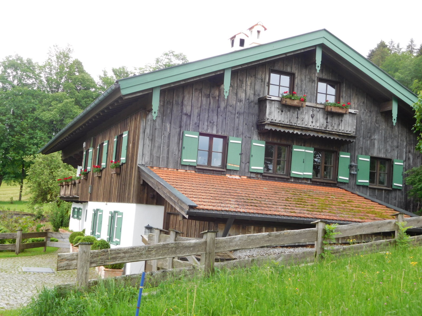 Dodie said to take any desired photos, because of that last chance factor. But frankly, the outskirts of Bad Tolz were fairly boring. During the day, attractive chalet style houses did continually run by. These are the ones with the overhanging balconies and red geraniums in boxes, like this: