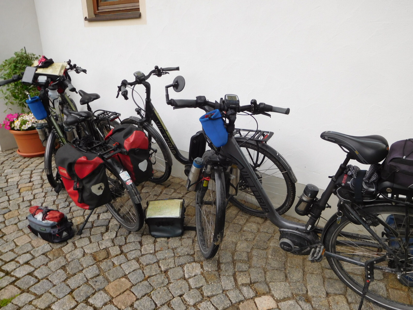 Out in front of the building we loaded our bikes in the company of two others, also made by German company Victoria. So while the photo below may just look like a gaggle of bikes to some, to others it will be all Victoria's. Those would be normal reactions, but I saw some things differently. For example, three bikes had stock seat posts, while Dodie's post (and seat) I threw under a train at Leipzig three years ago. The two that were not ours had more powerful motors than us, and lower, derailleur gears. That is something that would come into play a lot today. The other two had disc brakes, while we have hydraulic rim models. And we had the superior North American Myrrcycle rear view mirrors. All four had mid range Bosch Intuvia displays. etc, etc.