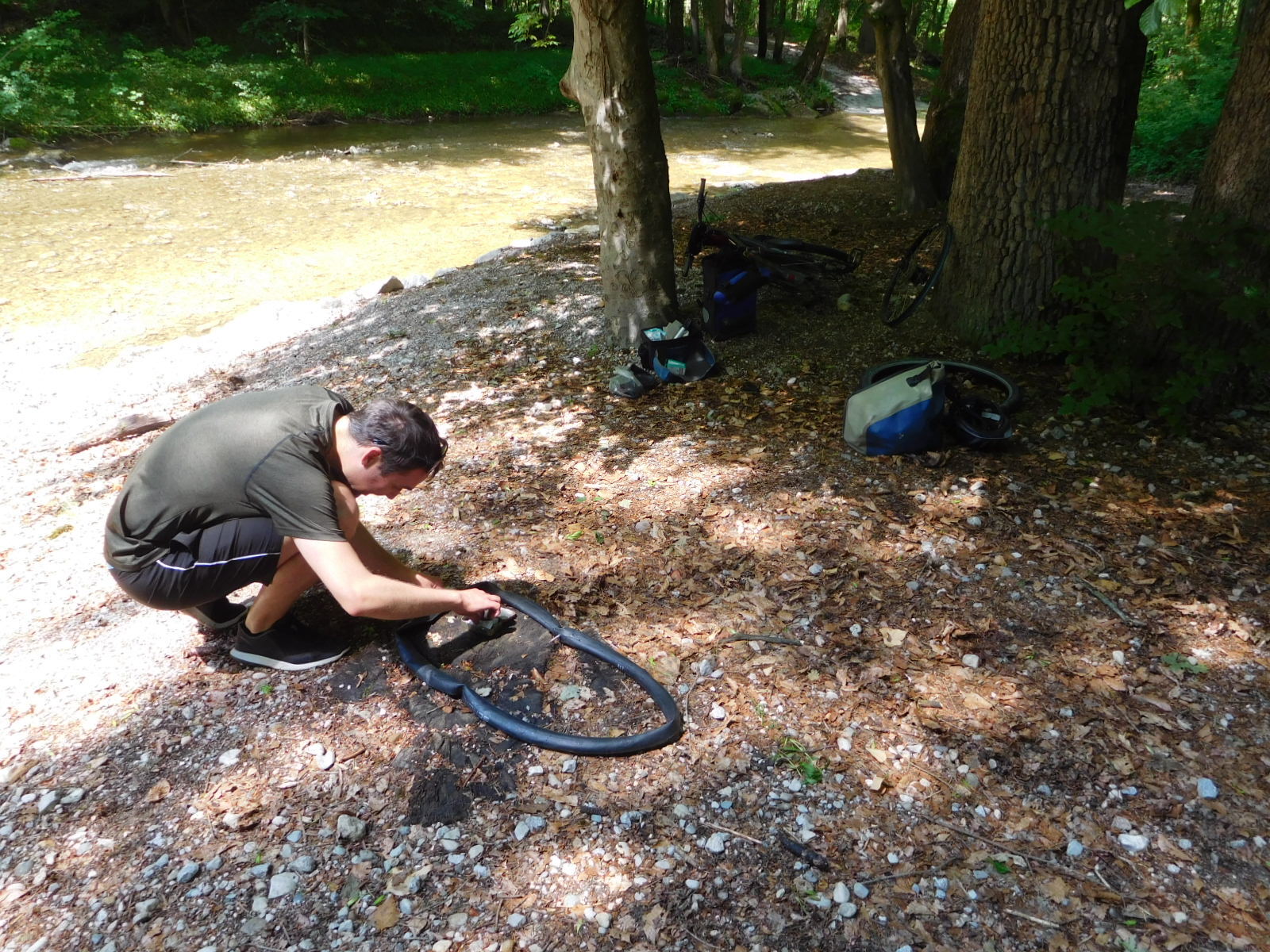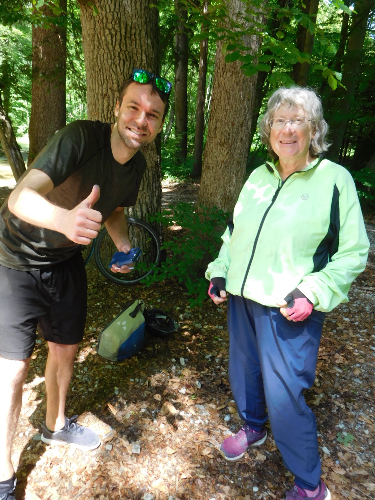 We had one last piece of serendipity for the day. As we cruised along beyond Neubeuren, a young man popped out of the woods and it seemed he needed a bike pump. He had a flat but did have a pump. What he was missing was glue for a patch. He had been carrying two patch kits, but both were dried up! We were glad we could help. We had come on this trip with two new tubes of glue!
