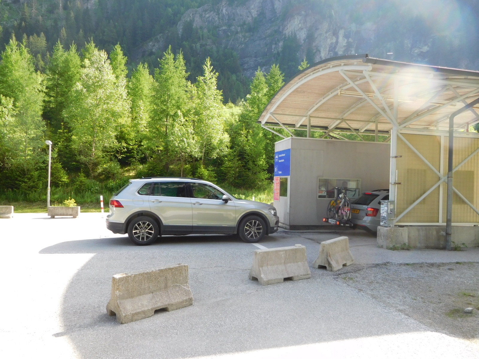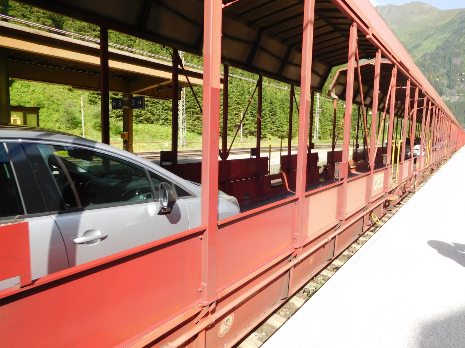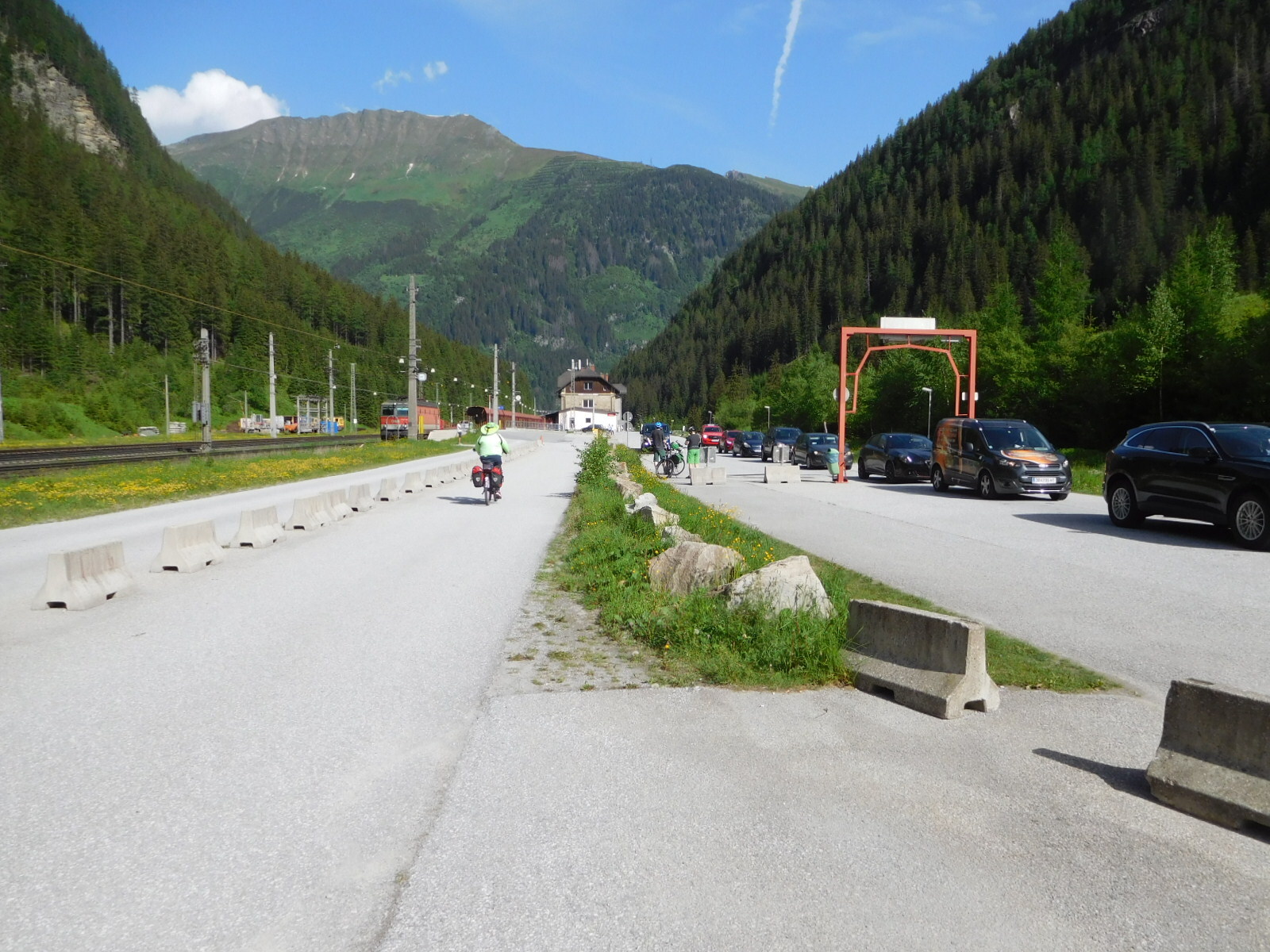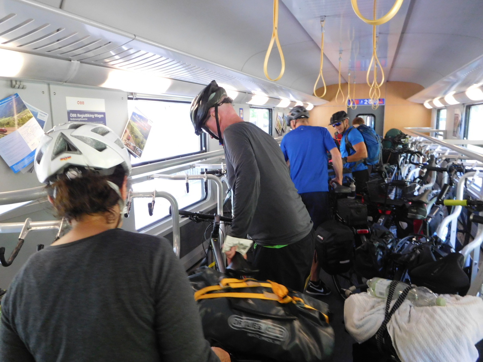 Now we come to something that has been described in many another blog, and we must say these descriptions helped us a lot in understanding the procedure. The only way south after Bockstein is through a tunnel, and only the train goes in the tunnel. Therefore both cars and bikes need to get on the train. The first step is to buy a ticket, which for bike and rider is 6 euros, up from the 5 euros that others reported. The ticket office is at the far left of the train station, and the cars line up there. Once they pass the ticket wicket they will drive right, onto the train. But as cyclists, we butted in to the car line and bought our tickets, then we butted out and rode freeform down to the front of the train, where the bicycle and passenger cars are. Even though it has been said that you need to take off all your bags, no one did, and besides there was no place for any removed bags. Rather, the cyclists helped each other lift the fully loaded bikes, and there were scads of them, onto the train, and to stash them in the bike car. The passenger car was full, so we just hung on ceiling straps and rode with the bikes.