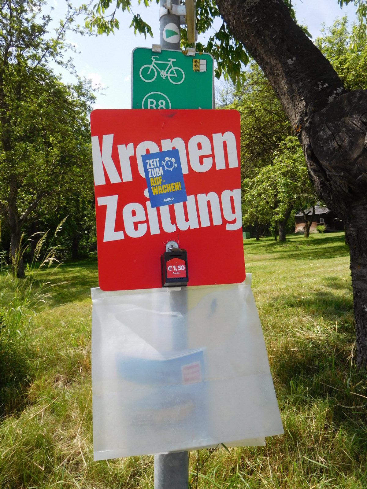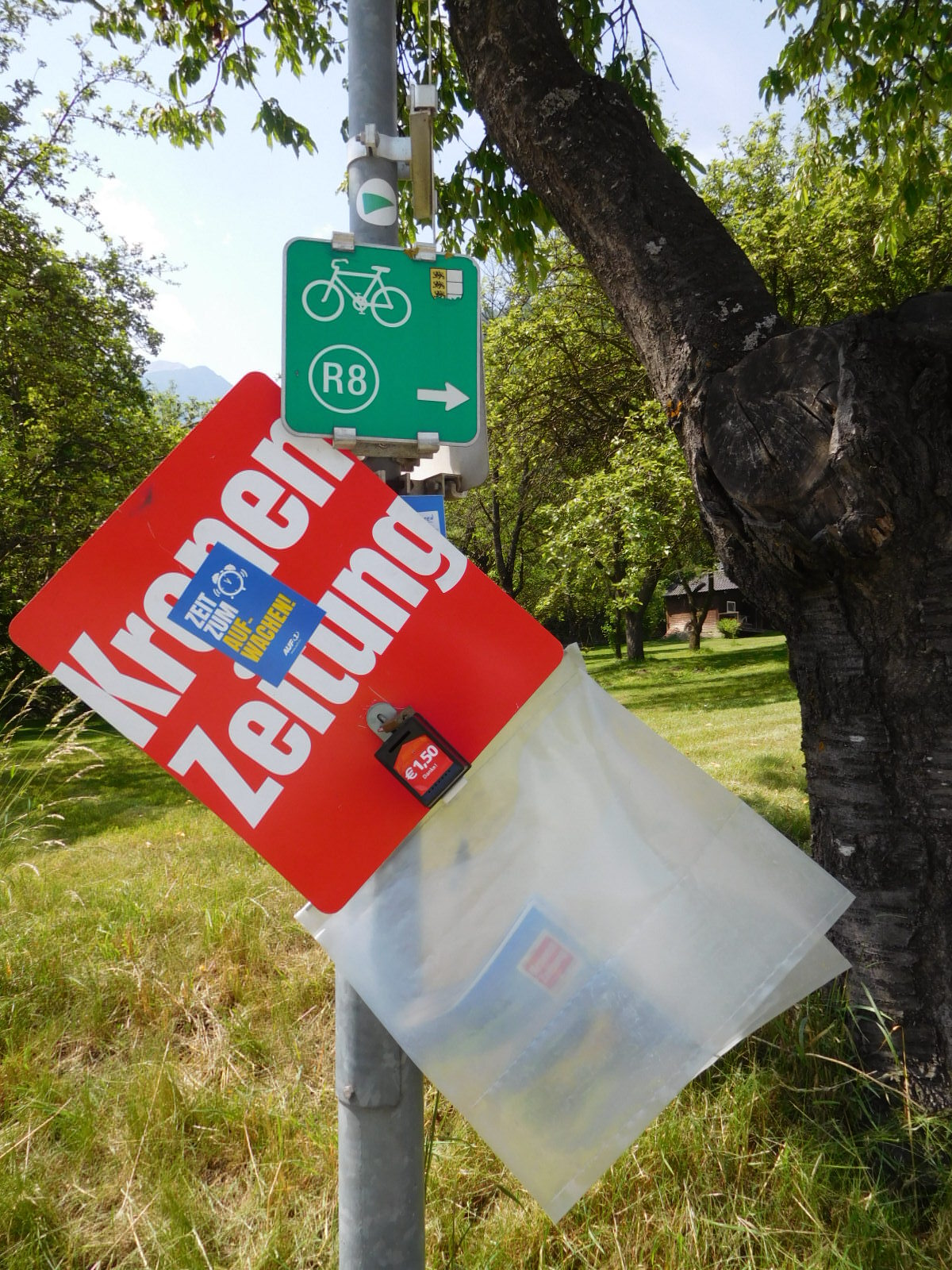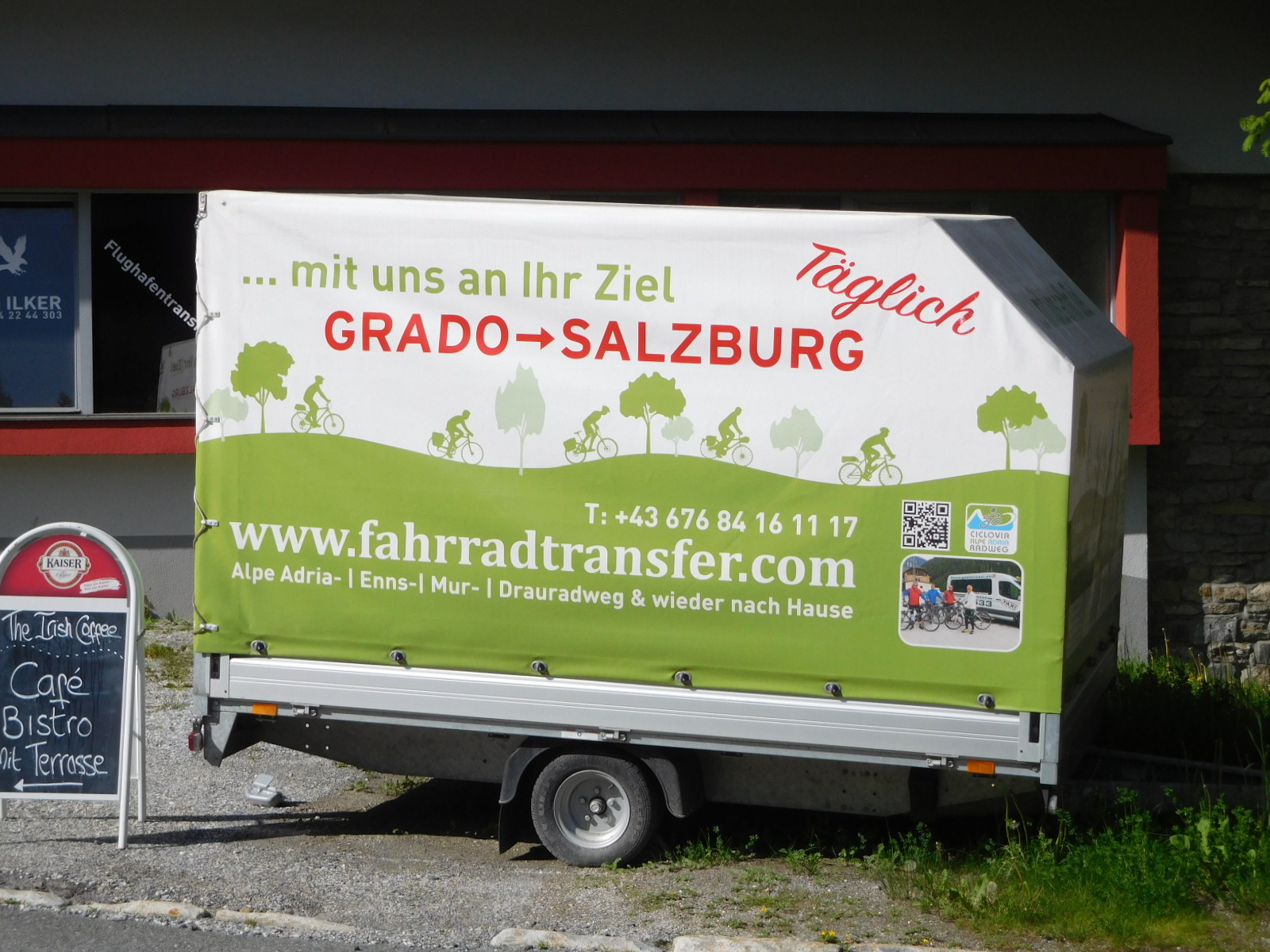 Just beyond Bockstein we spotted a trailer belonging to a company that brings cyclists back from the Adriatic, as far as Salzburg. As it happens, Suzanne Gibson had already tipped us off to the existence of this company in yesterday's comments, and we had already taken her sage advice. Our plan now is to use the shuttle service to bring us up from Grado to Möllbrücke. In our original plan, Möllbrücke was the spot on the Drau from which we had planned to set off west along the river, ultimately to go over the Brenner Pass and back to Bad Tolz and then Munich. So now after detouring down to the Adriatic, we will use the shuttle to put ourselves right back on route. Thanks Suzanne!