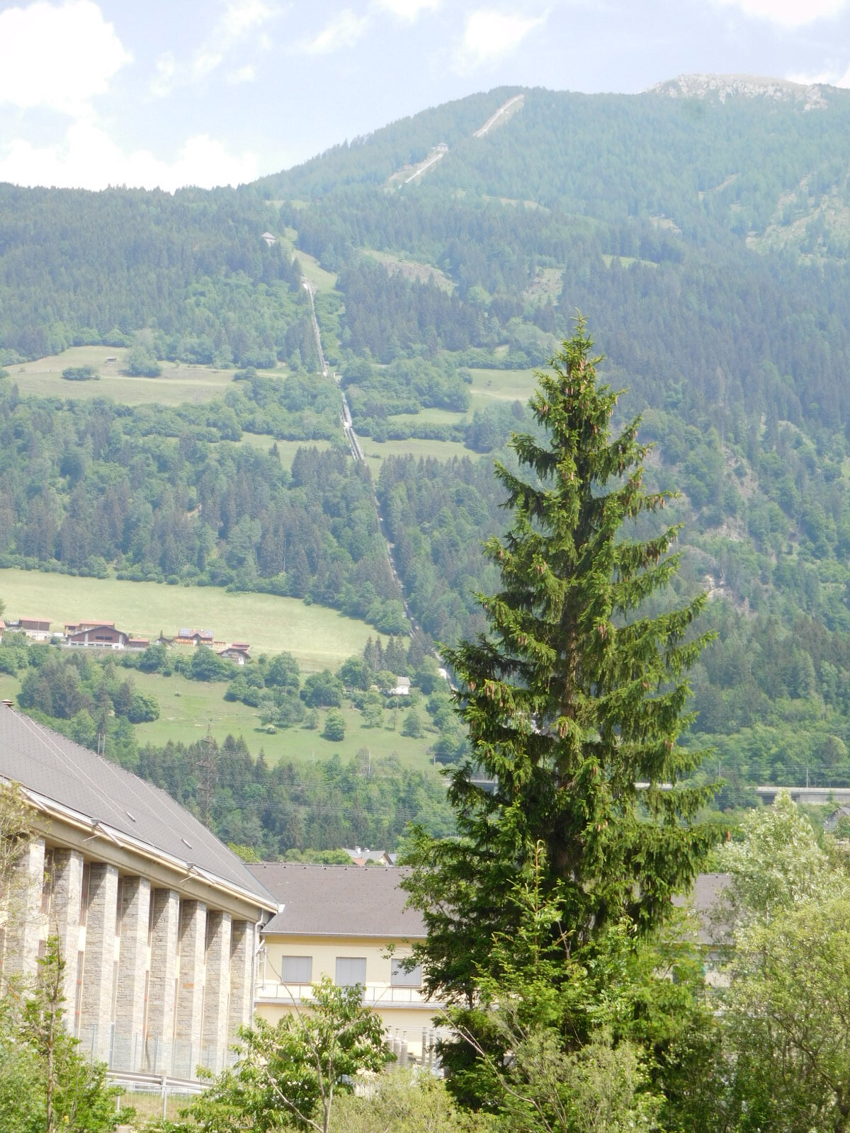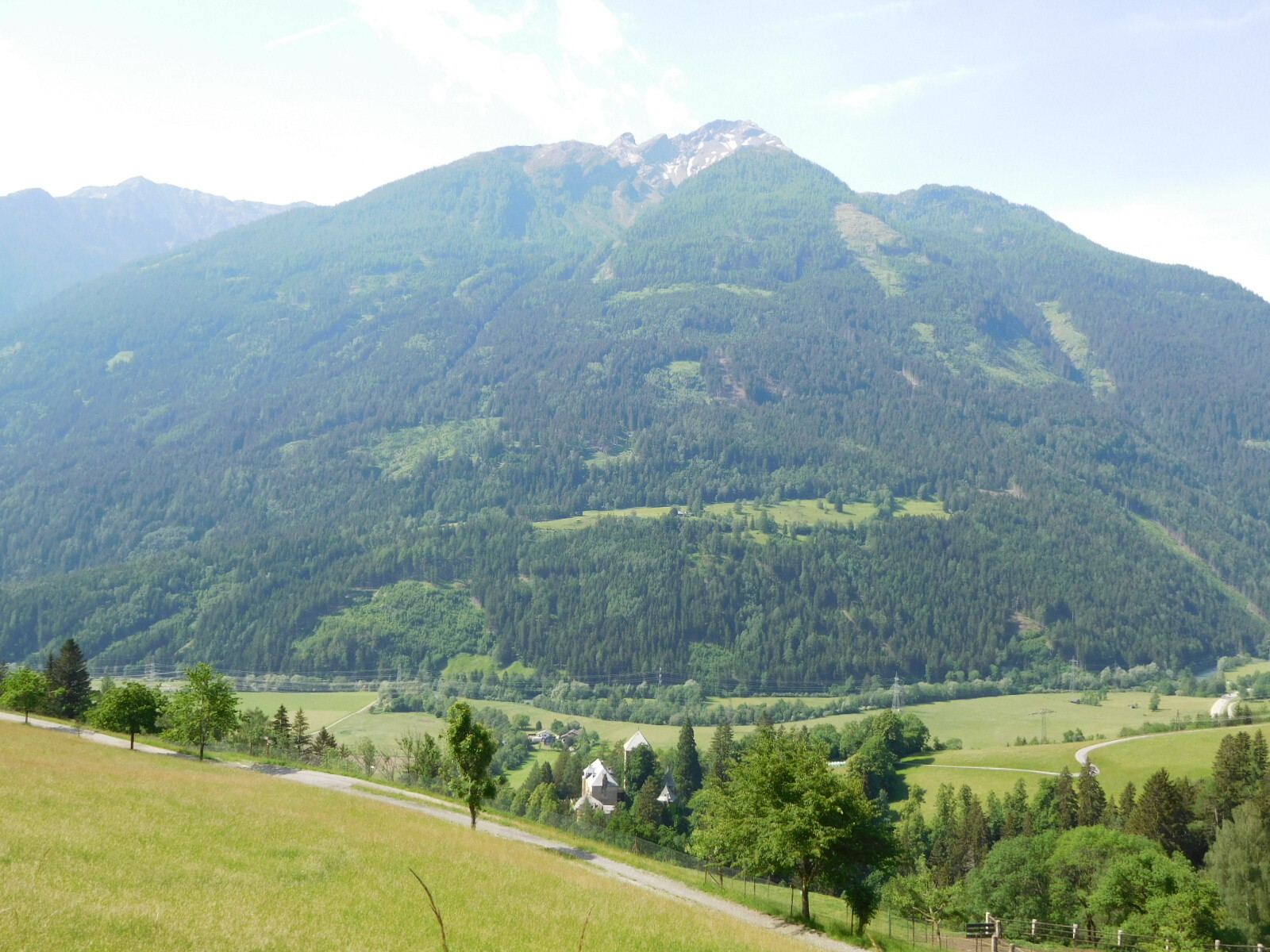 The mountains bounding the valley remained very high, and we noticed numerous panorama lifts up to their summits. Our camera is not quite capable of showing them with good contrast, but here is the general idea: