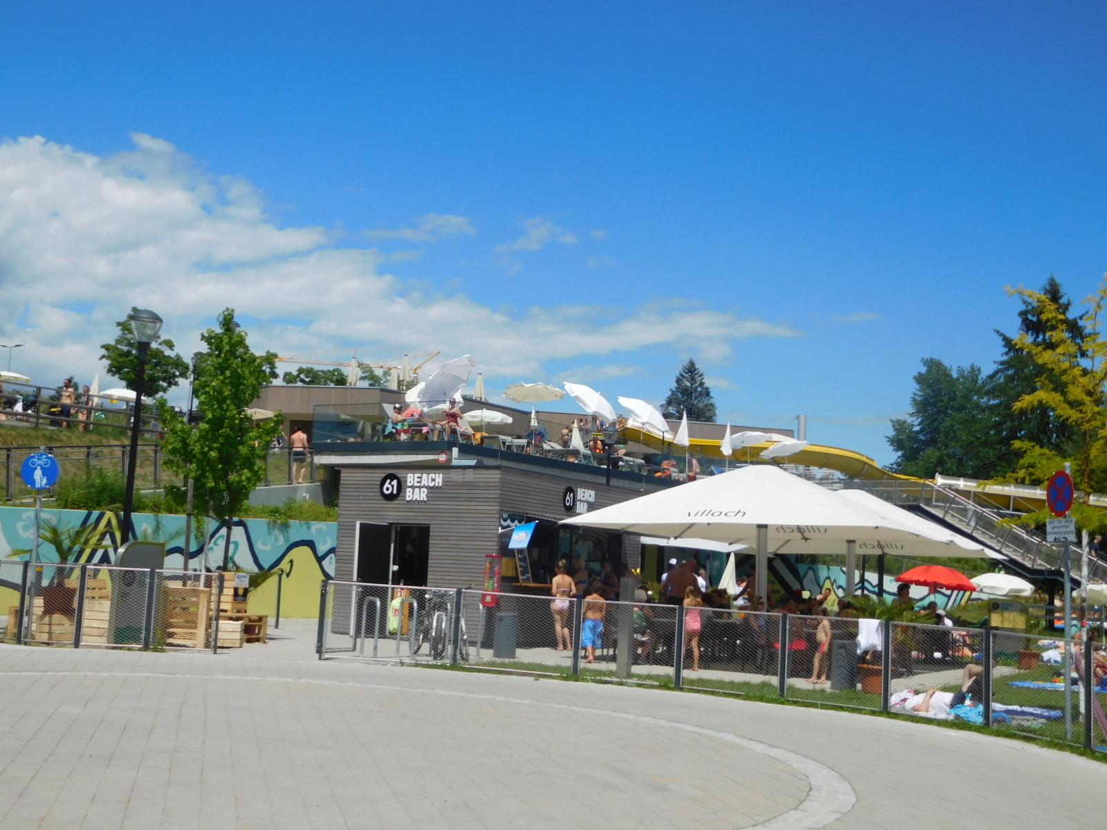 Last night's dramatic storm had passed, leaving only a soaked towel, which we had been using to slightly prop open our balcony door. But we would see more signs later, in branches littering the cycle path and hunks of wood floating in the Drau.