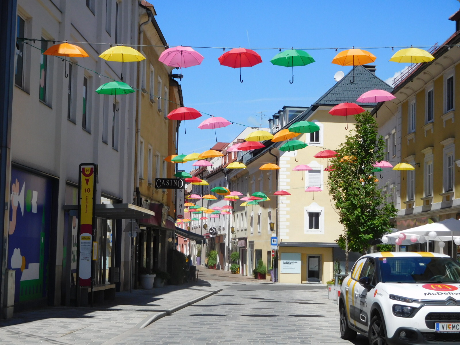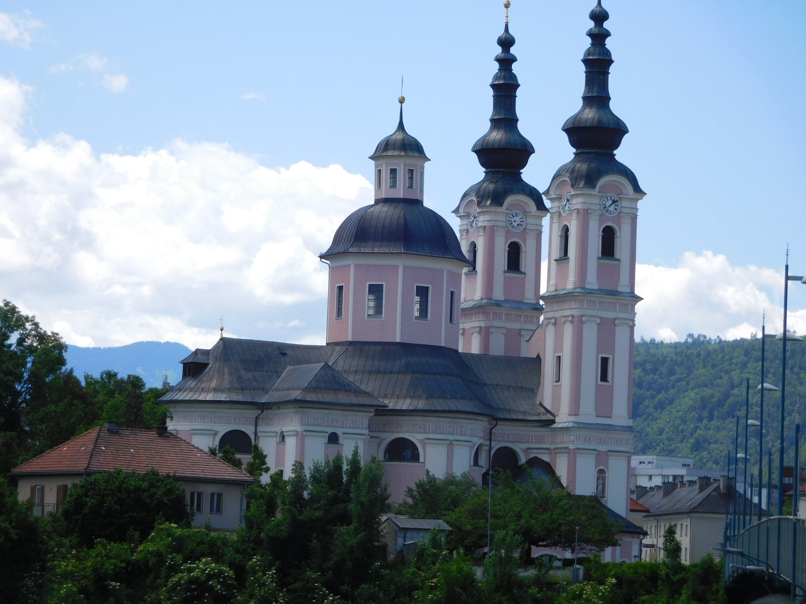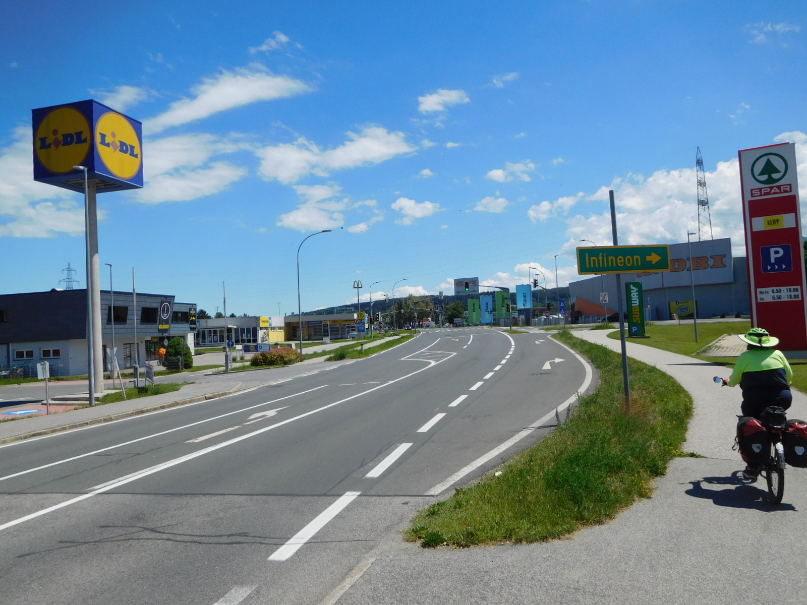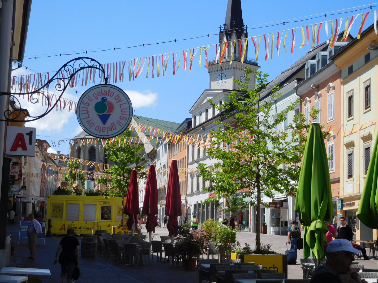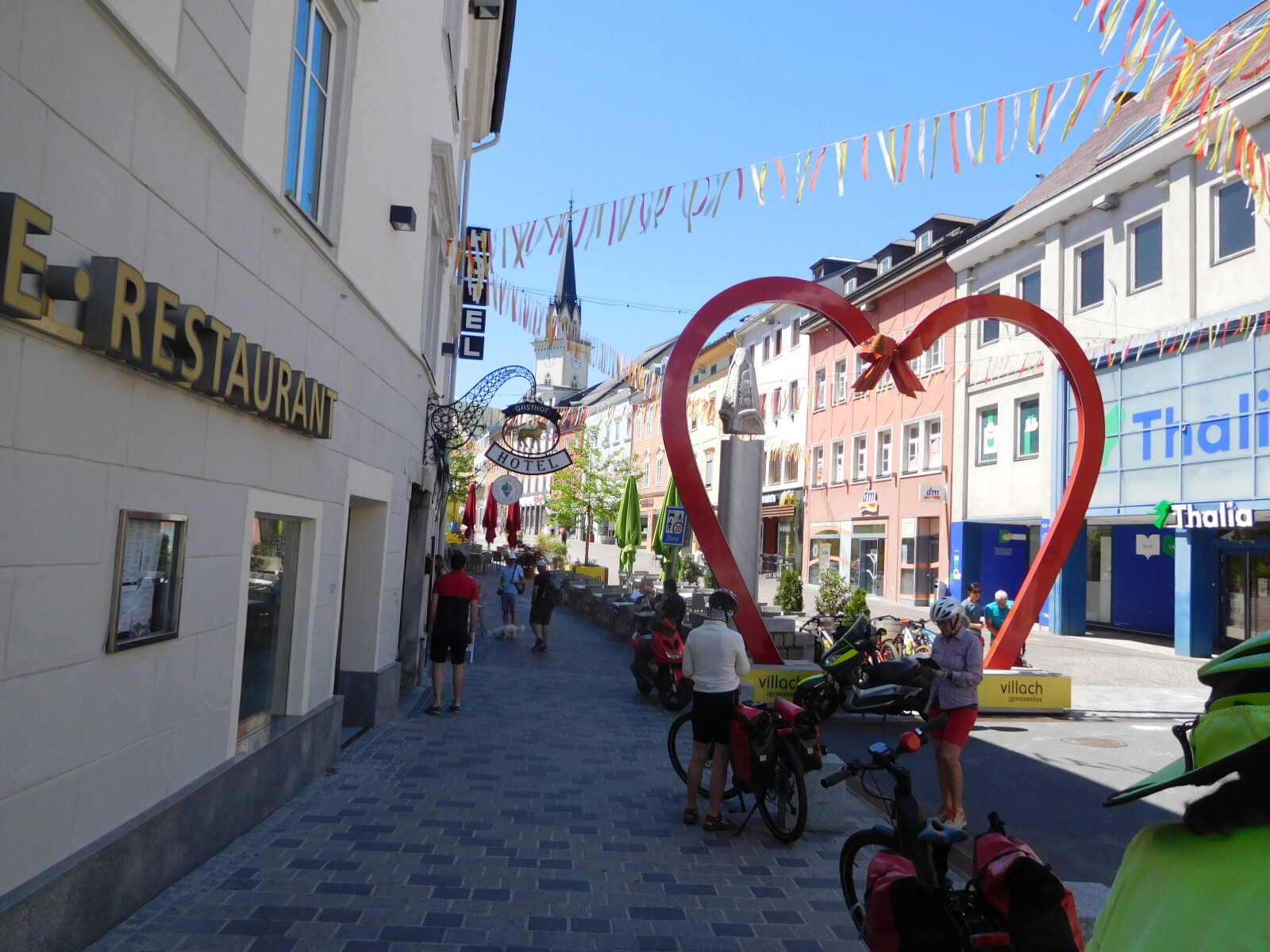 We figured in setting distances as short as 37 km, they must know something about the route that we do not. But no, we just sailed over to Villach from Spittal on the flat, and arrived before noon. We stopped by our hotel, the Goldenes Lamm, and they predictably told us to come back later.
