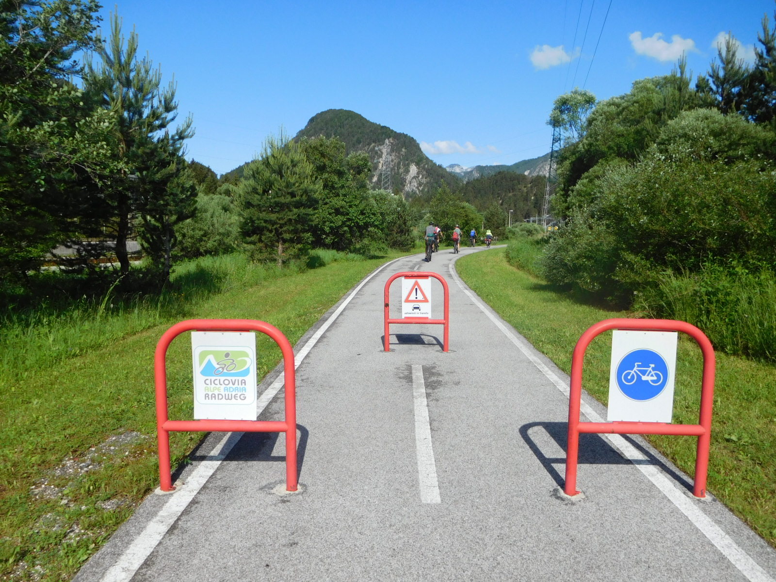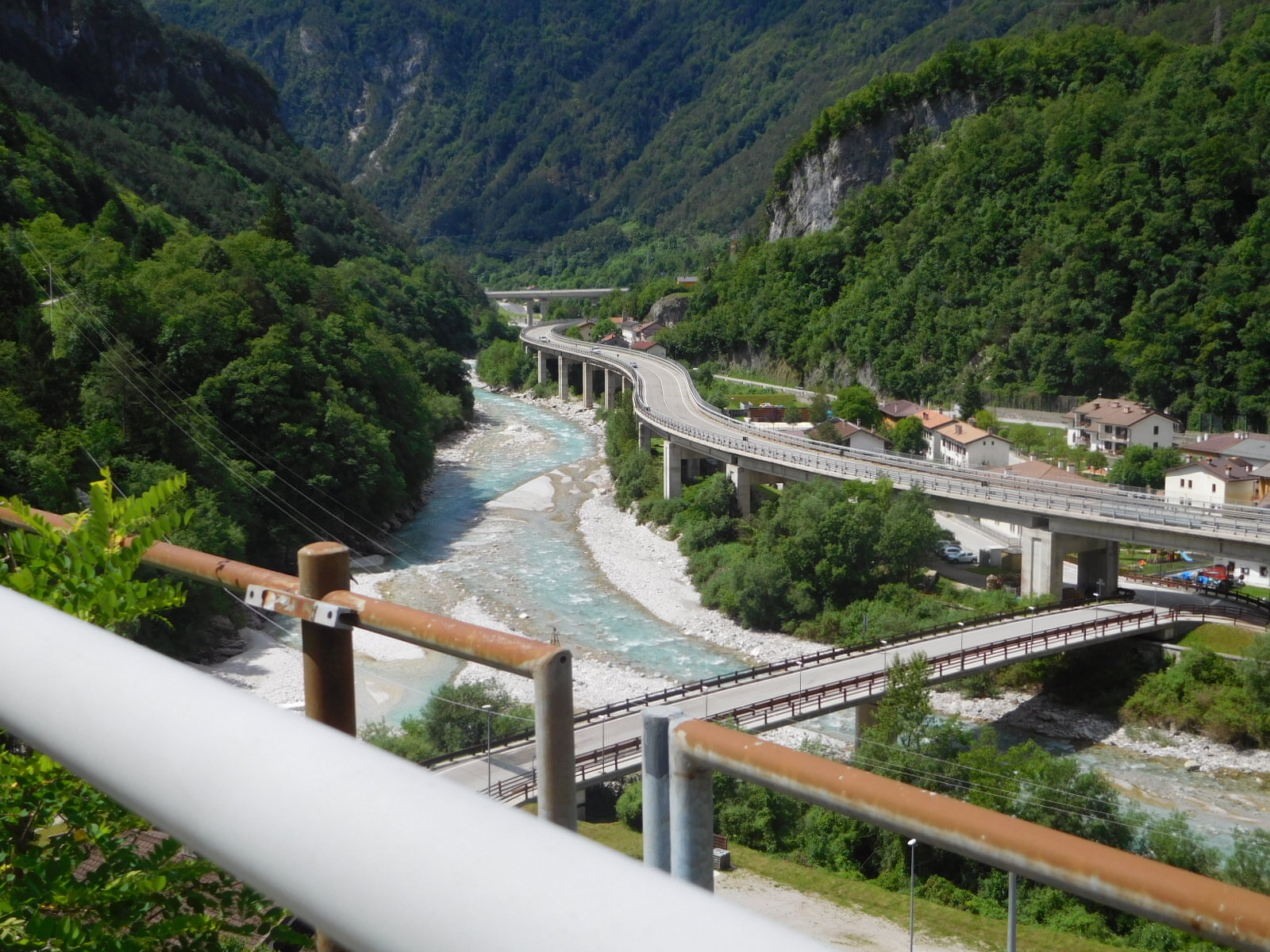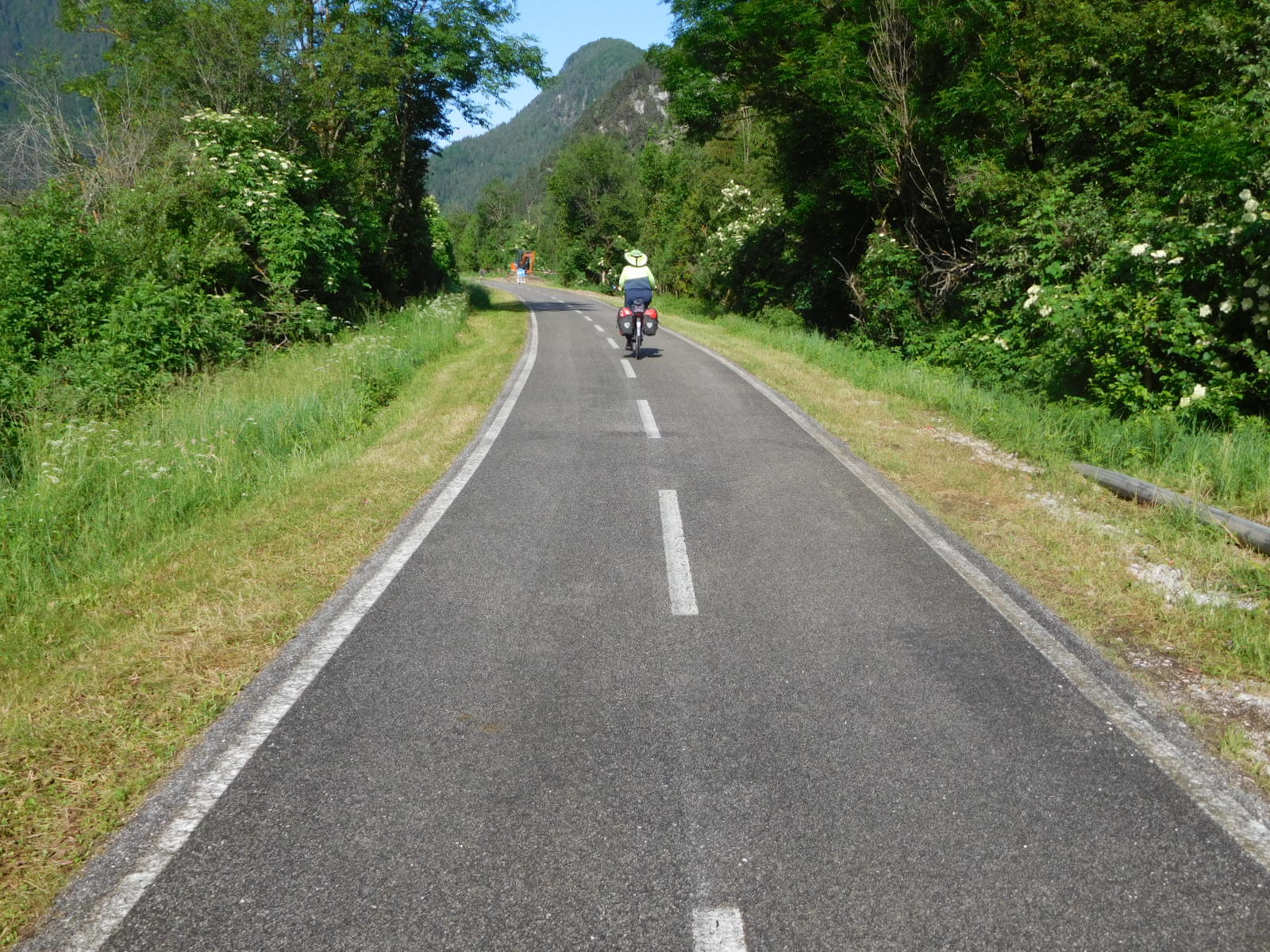 What came next was something we really did not expect. Other bloggers had mentioned that this is a really good route, and they promised a fun ride down to the Adriatic once the Alps were behind. But today's stage, Tarvisio to Venzone really exceeded any descriptions we had read. For 48 continuous km we had a rail trail, with perfect surface, and a persistent downward slope. 48km! We began to joke that we would have to turn the pedals occasionally, just to keep our legs from locking up. But that's not all, not even close. We were passing during this time through an area with the mountains close on each side, following the valley of the Fella River. The Fella is the type of turquoise coloured gravel bedded fast moving stream so evocative of high mountain areas. It is gorgeous and exciting.