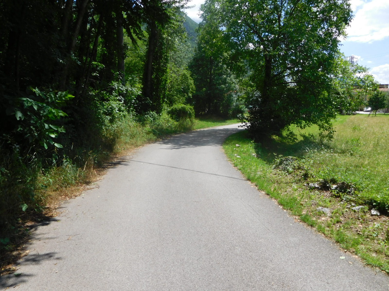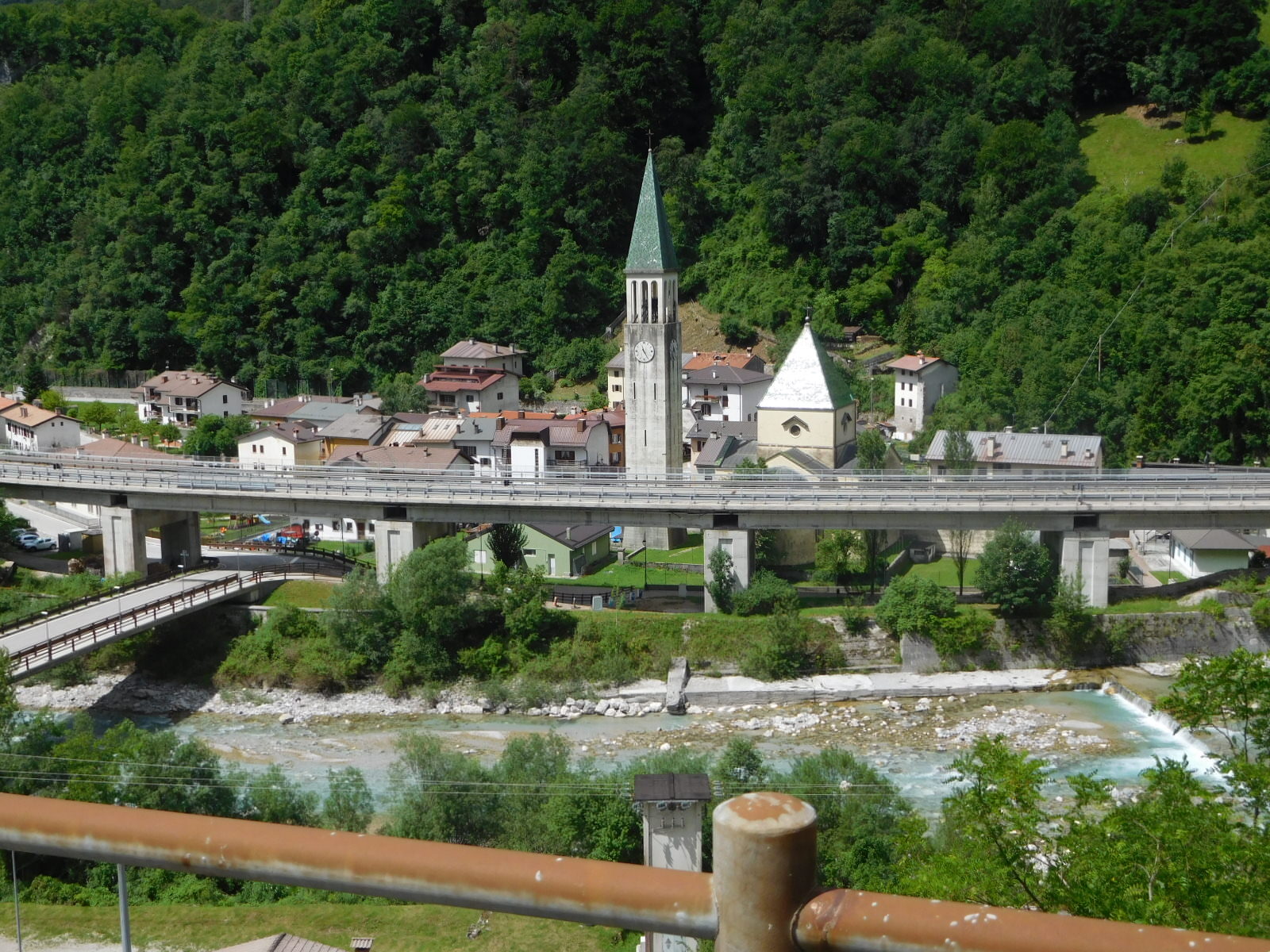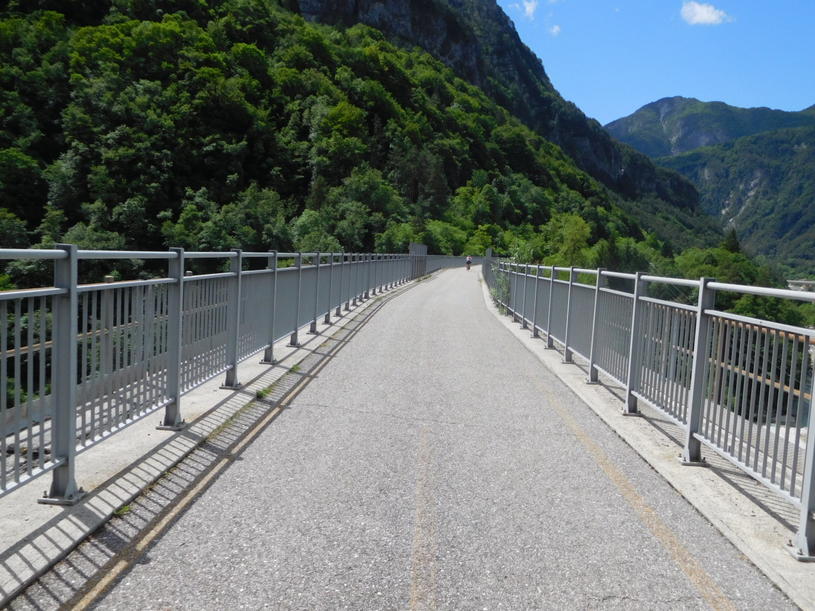 What came next was something we really did not expect. Other bloggers had mentioned that this is a really good route, and they promised a fun ride down to the Adriatic once the Alps were behind. But today's stage, Tarvisio to Venzone really exceeded any descriptions we had read. For 48 continuous km we had a rail trail, with perfect surface, and a persistent downward slope. 48km! We began to joke that we would have to turn the pedals occasionally, just to keep our legs from locking up. But that's not all, not even close. We were passing during this time through an area with the mountains close on each side, following the valley of the Fella River. The Fella is the type of turquoise coloured gravel bedded fast moving stream so evocative of high mountain areas. It is gorgeous and exciting.