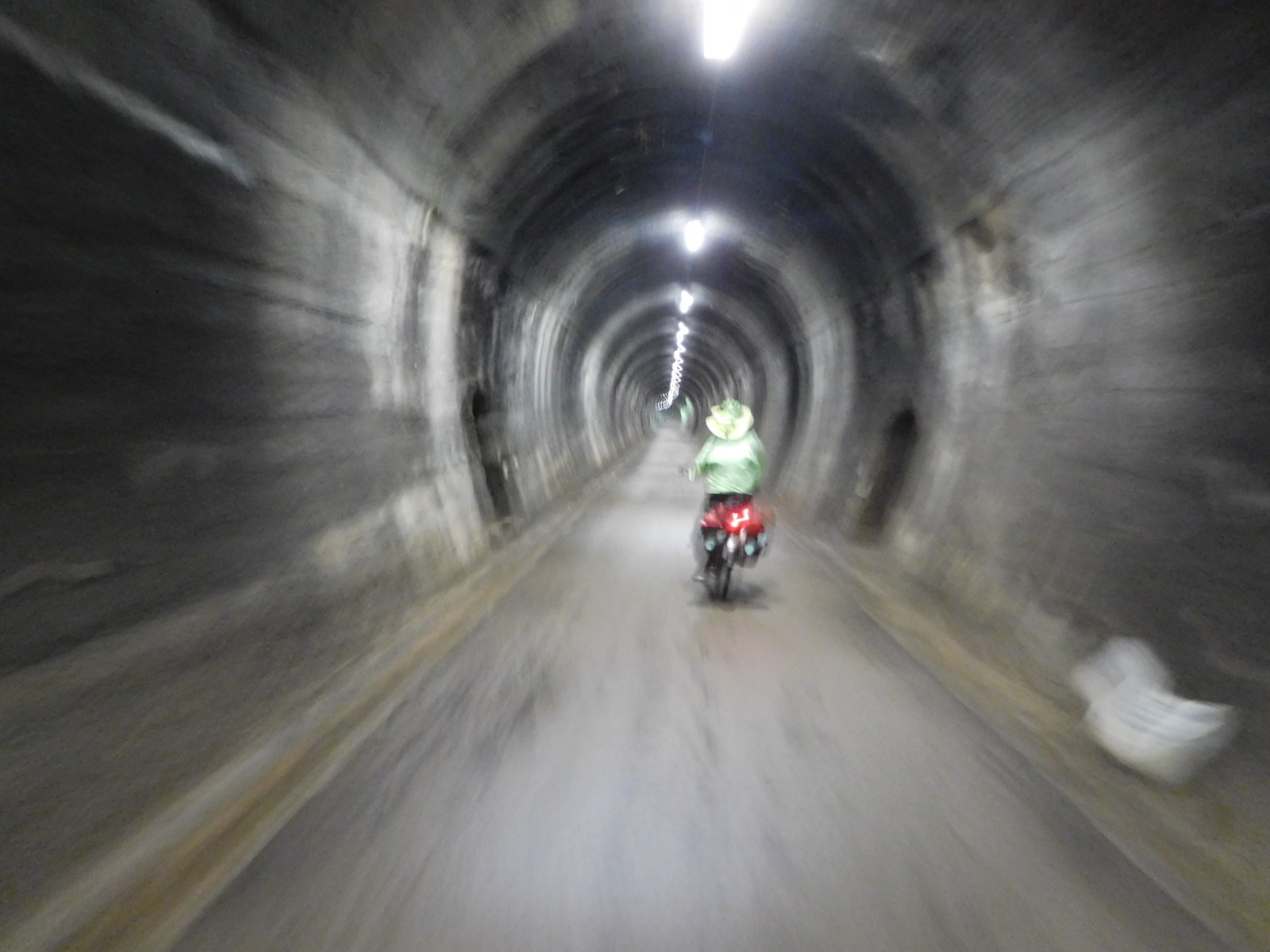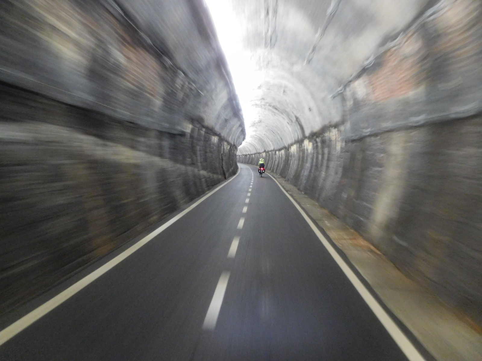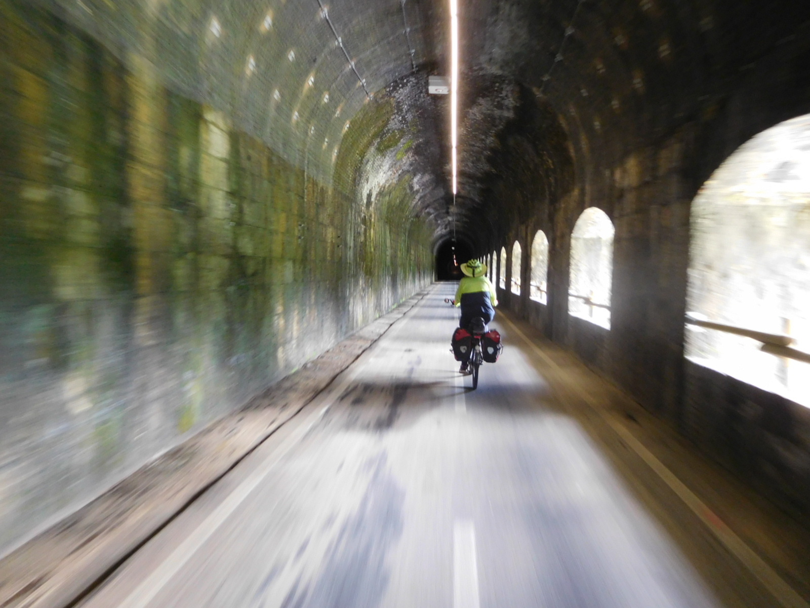 Another big thing about this stage was tunnels. We lost count, but one account mentions 22. I thought there were more! Many are long, very cool, and dark. There are motion sensor lights, but in at least one place these were not working for a goodly stretch. Without bike headlights in that bit, one would be bouncing off the walls!