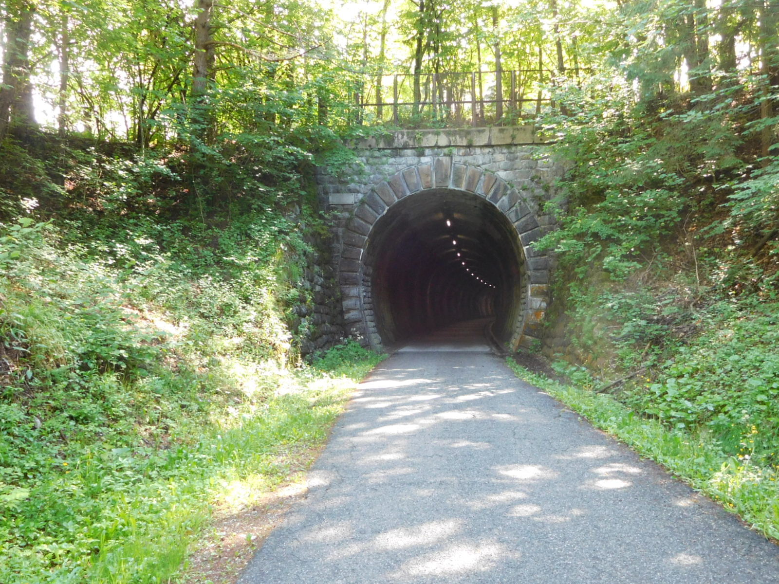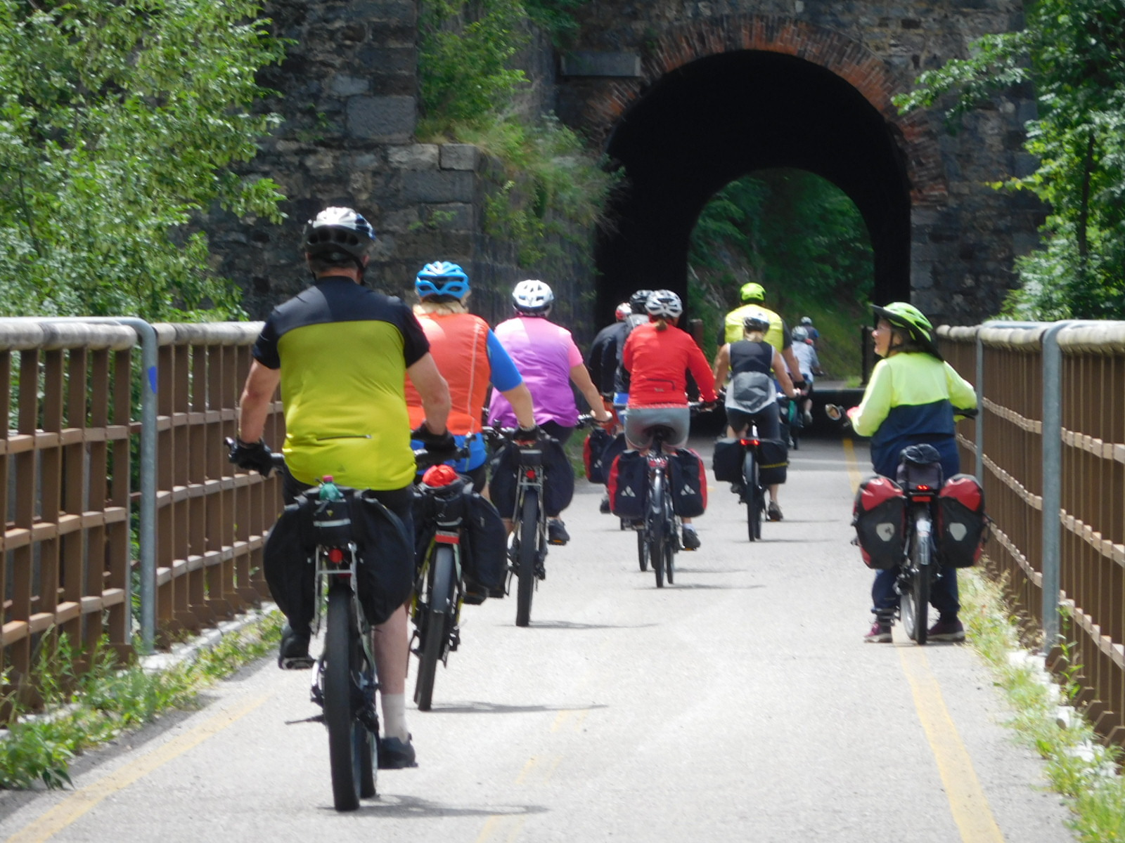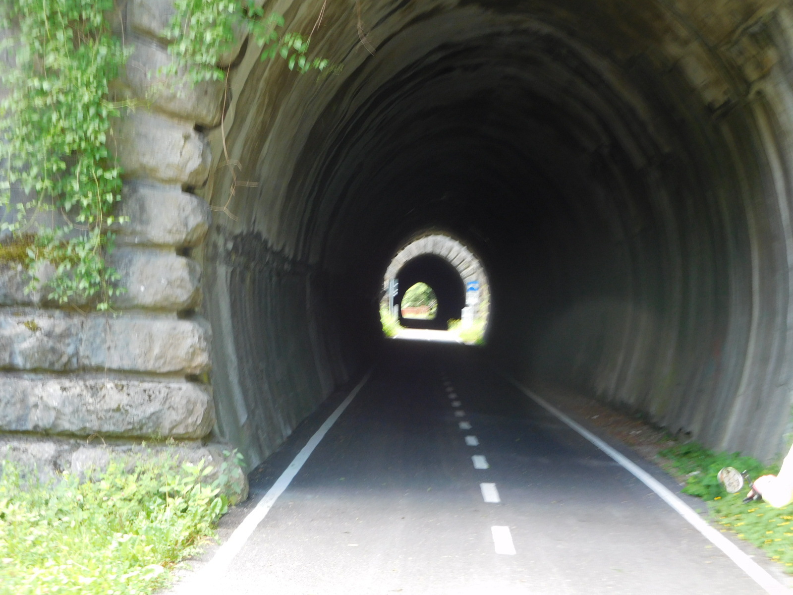 Another big thing about this stage was tunnels. We lost count, but one account mentions 22. I thought there were more! Many are long, very cool, and dark. There are motion sensor lights, but in at least one place these were not working for a goodly stretch. Without bike headlights in that bit, one would be bouncing off the walls!