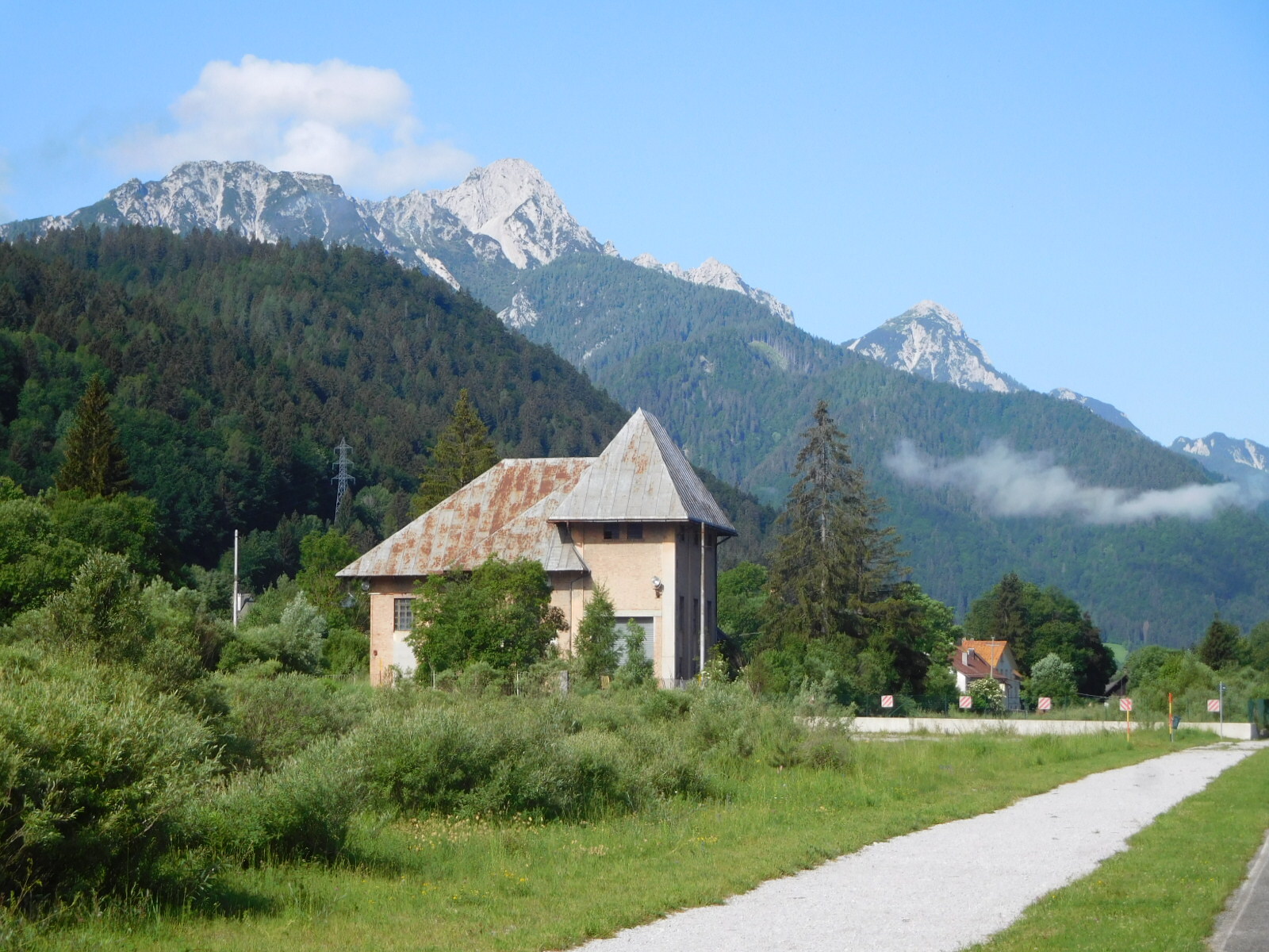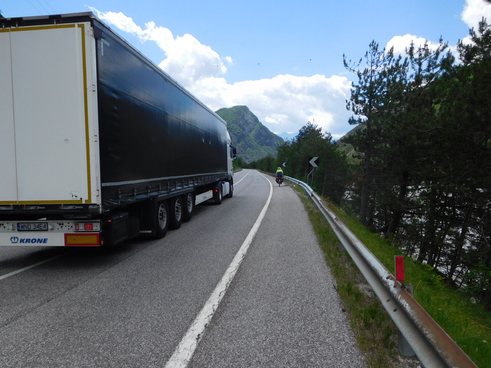 Keen readers will notice that we mention 48 km of blissful riding, but the trip today we give as 61 km. So that's 13 km of, yes, hell. The route is continually under development, and work was underway between the old station at Moggio and our destination today at Venzone. With very little notice or signage it is all over, and cyclists generally find themselves on the high speed road. While stuck out with the trucks I would find it a little comforting to see signs confirming that we really are on the right route. Such signs might even help the truckers to expect cyclists and to understand that they are supposed to be there. But no. We had to rely on the GPS, even for such unlikely moves like having to cross the big road in the middle of "nowhere".
