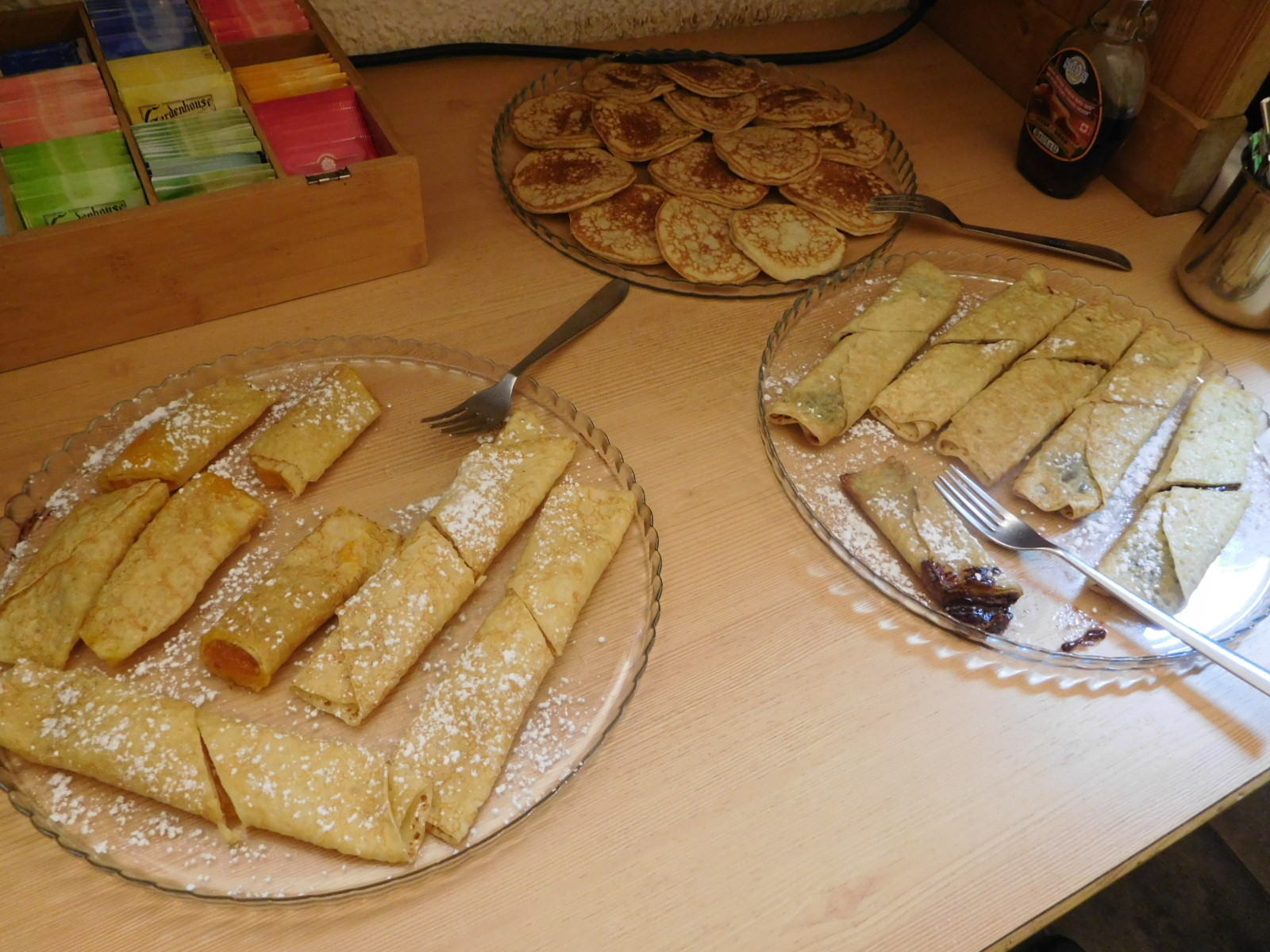 Alas, the hot cakes turned out to be cold, and the crepes, while ok, were filled with cool Nutella. We'll just have to struggle on with all that ham, and cheese, and fruit, and !!