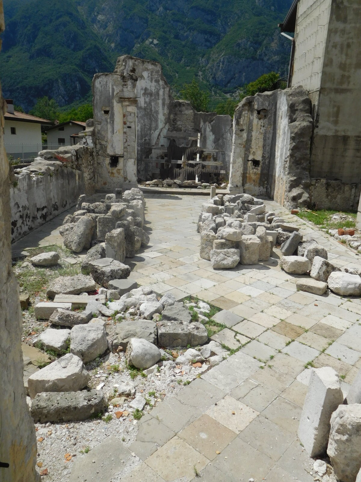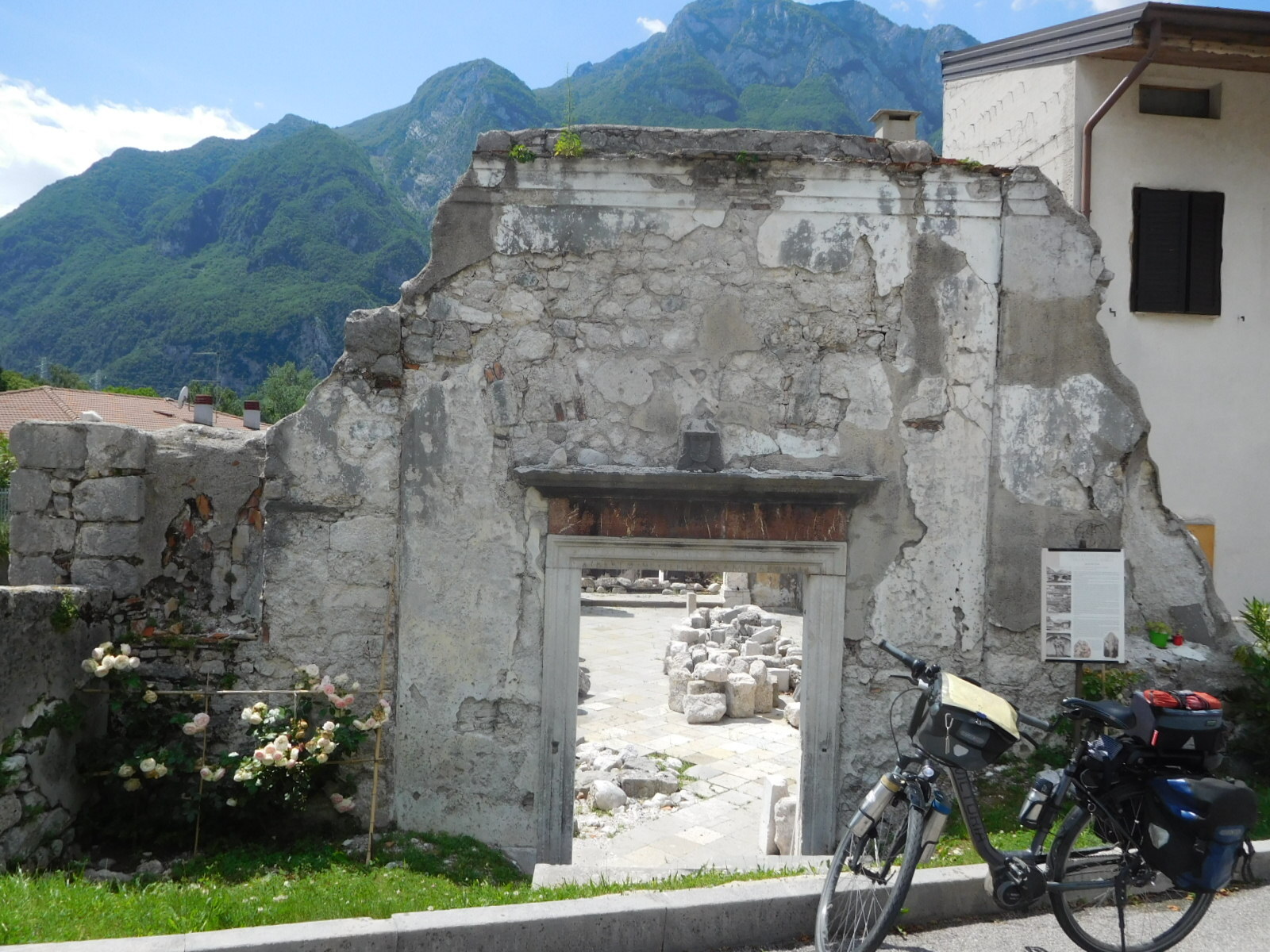 The next fact is that Venzone was almost entirely destroyed by the 1976 Friuli earthquake, killing 47 inhabitants. The historic town centre was rebuilt in its original style from numerous pieces of rubble in the next years, following, we understand, original plans or designs. We weren't in town long enough to appreciate which bits might have been rebuilds. We did spot one church on the way in, that clearly had been left as it was: