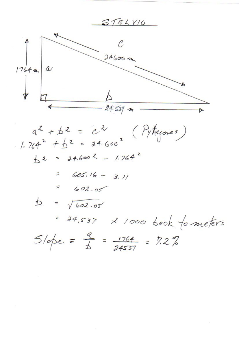 My brother was looking at the figures I gave for the descent from the pass at Bad Gastein, and he concluded that the average slope there was 8%. Taking the number of meters of total drop and the recorded road distance, he had the vertical and the hypotenuse of a triangle, and so could calculate the "run" using Pythagoras, and with that, the slope percentage. 8% seemed low, but maybe. I then asked him to check Stelvio, and he came up with 7%. Remarkably this is also the figure I have seen in other sources on the web. Readers, how do these figures strike you?