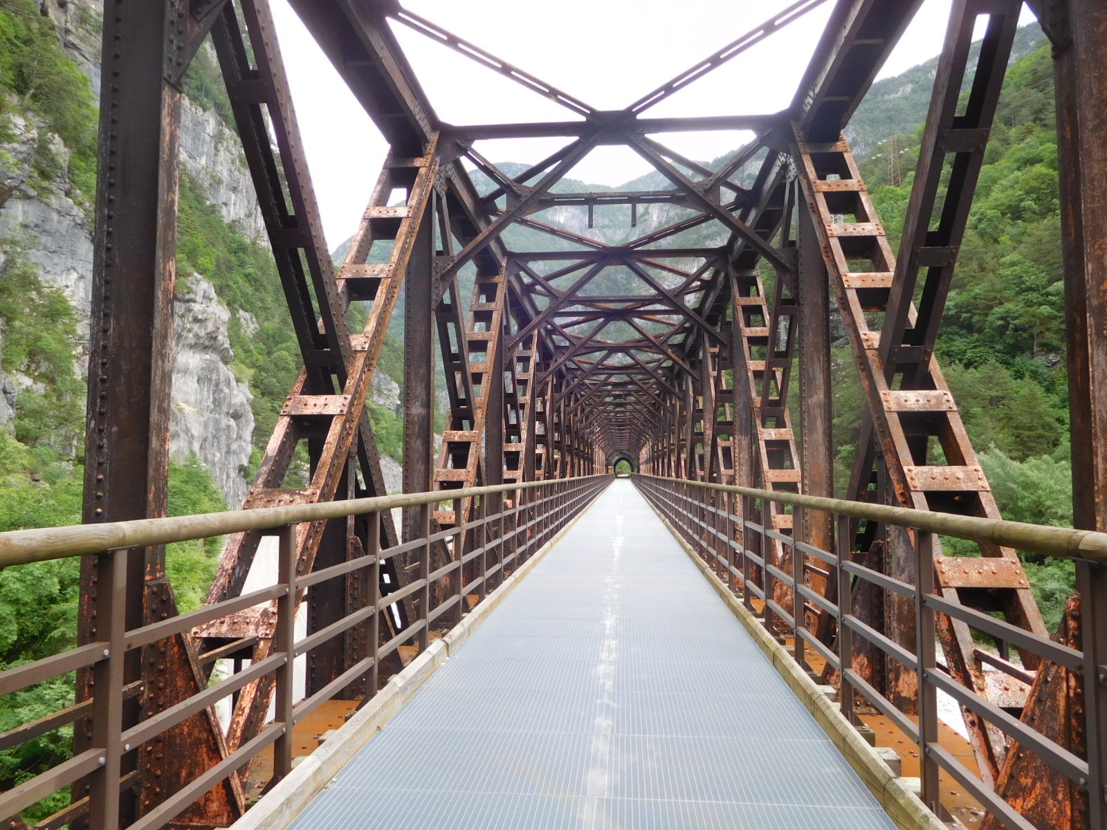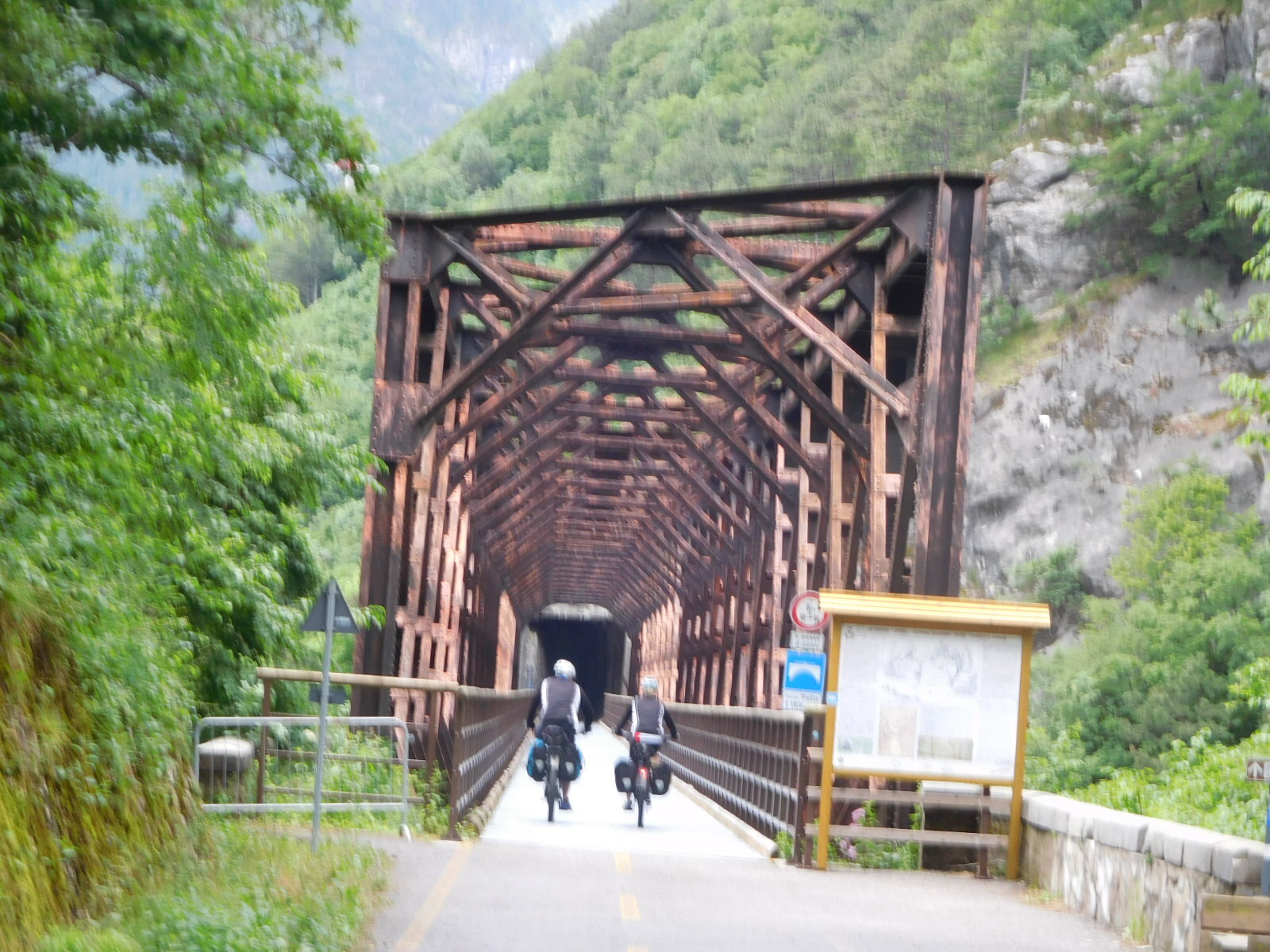 Not only were there tunnels, but also bridges. Lots of these had wire mesh surfaces, and we were careful not to lose traction on this. The bridges always afforded beautiful views, and some were beautiful in themselves.