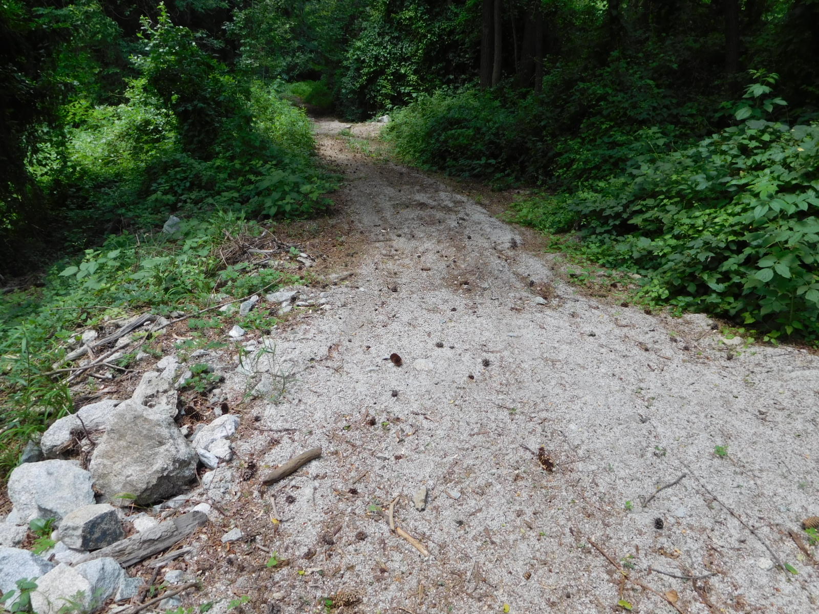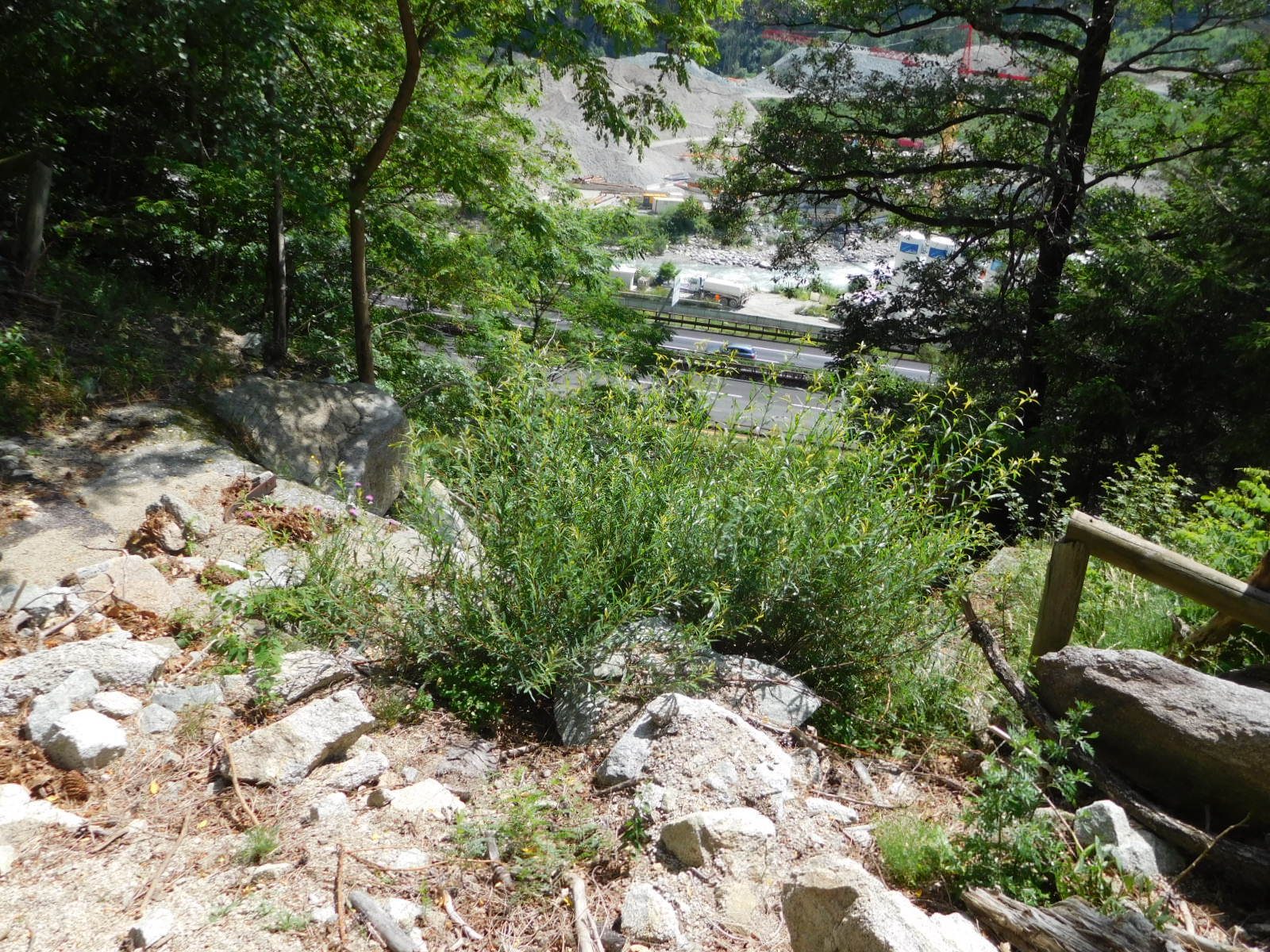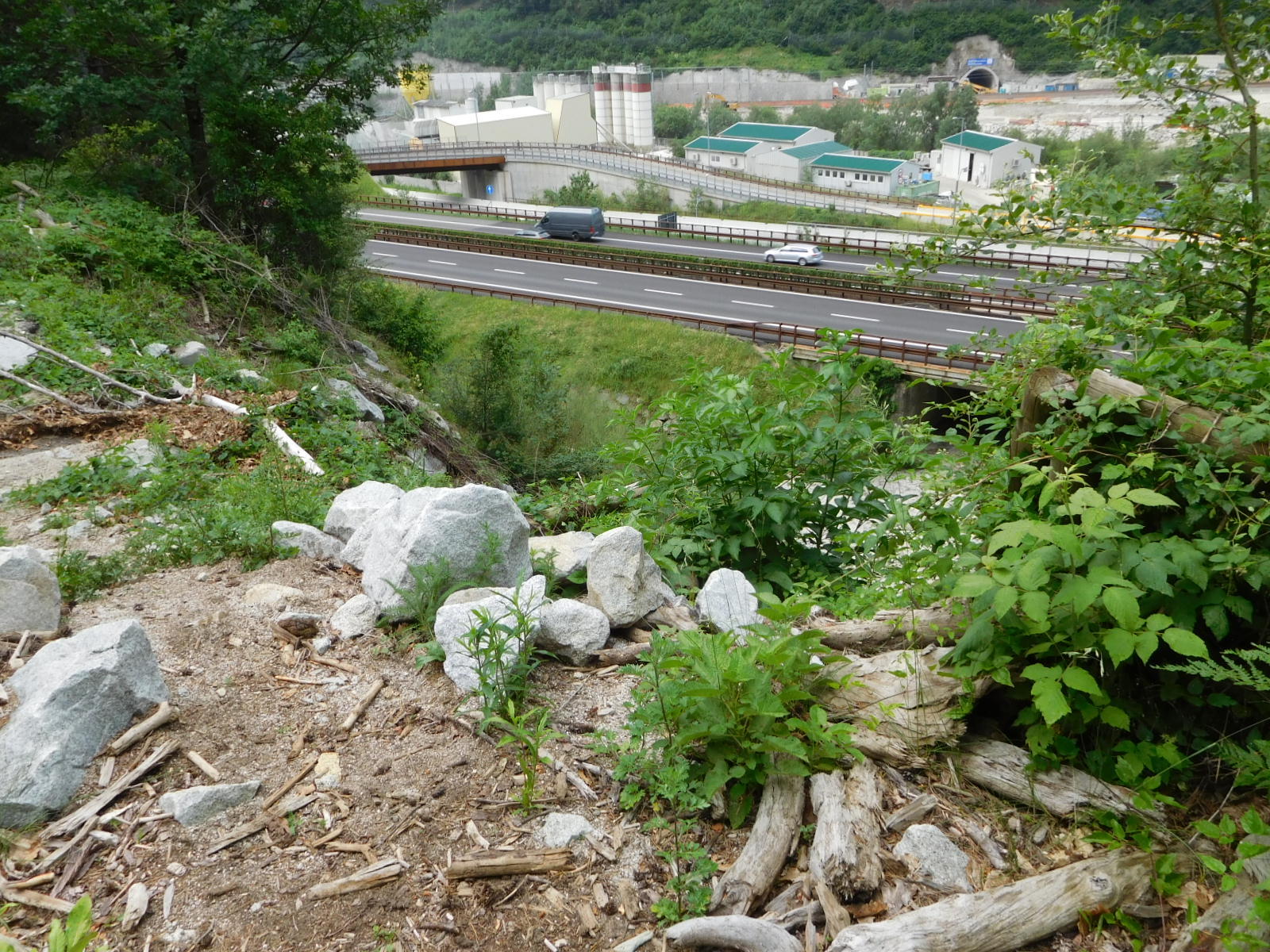 Dodie checked the GPS, and found that the track was actually up on a ridge beyond SS12 and another autoroute. There seemed no way to get up there, meaning that we were stymied, but Dodie found an underpass, and with that we were able to climb to the ridge.