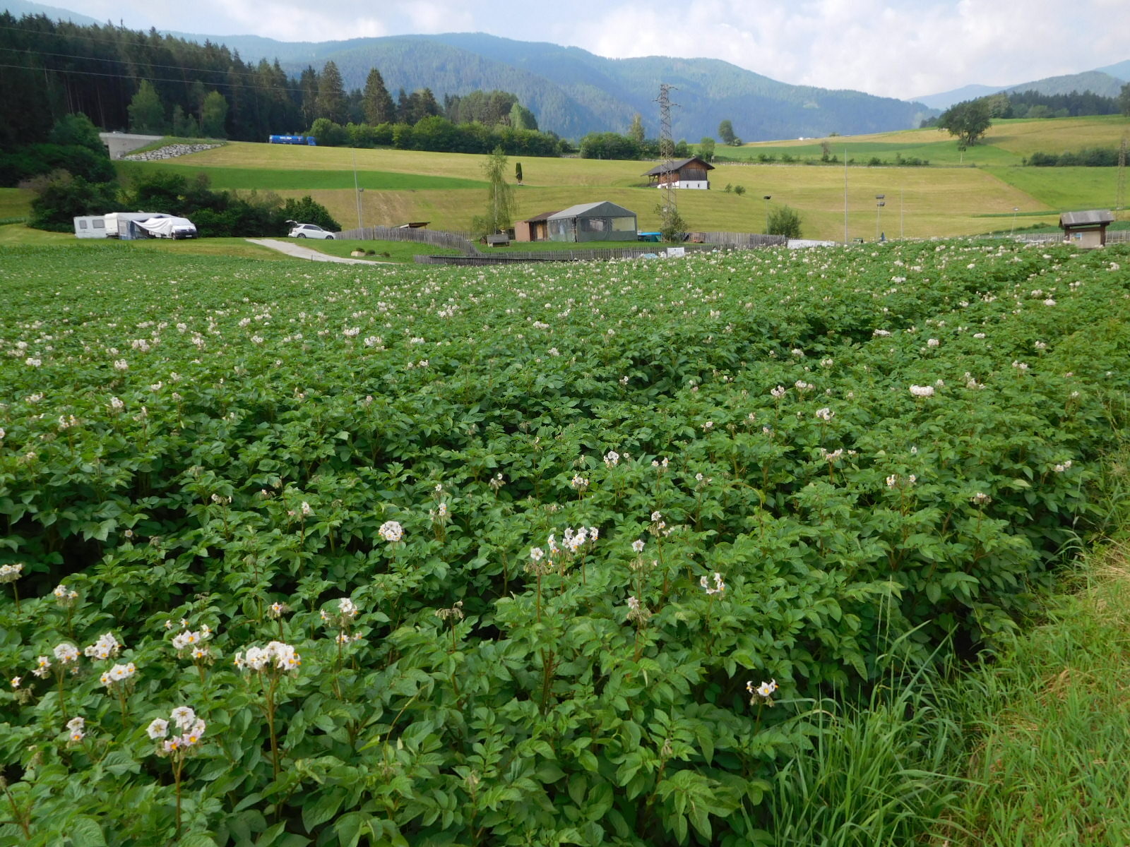 We passed through town, with me thinking that as claimed yesterday, it really did not have an ugly or overly busy outer city. And within 1 km we were out in the fields. In this case, potato fields. Now because this was to be a bit of a special day, you get to listen in on the inane conversation that sometimes occupies people cycling together: "Oh look, potatoes", "Yes and they are already in flower", "Well great, when we it Austria we will be able to count on pommes with our schnitzel."