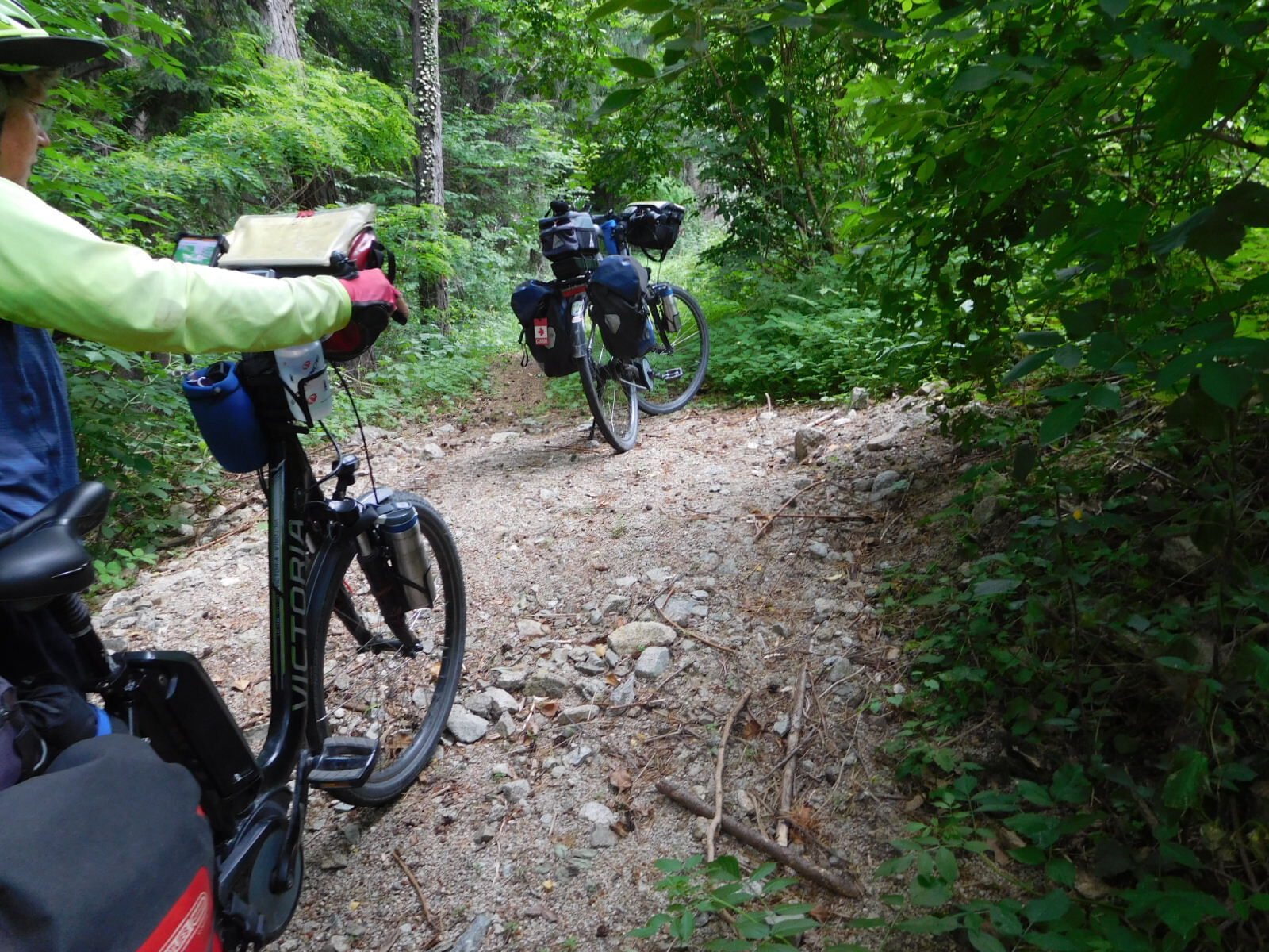 Since the screw was now in my hand, the fix was just to screw it back in, right? Not quite. There was no room to get the screw in and tighten it. The only way would be to remove the wheel. But removing the wheel with Dodie's bike is not so simple. It has a seven bolt system for securing the wheel and adjusting the chain tension. And it has the internal gearing, with the hard to reinstall cable ending and tricky "yellow dot" gear adjustment. It's not that I couldn't do it, but it would be a real pain, slight learning experience, and take time, out in the sun by the trailside.