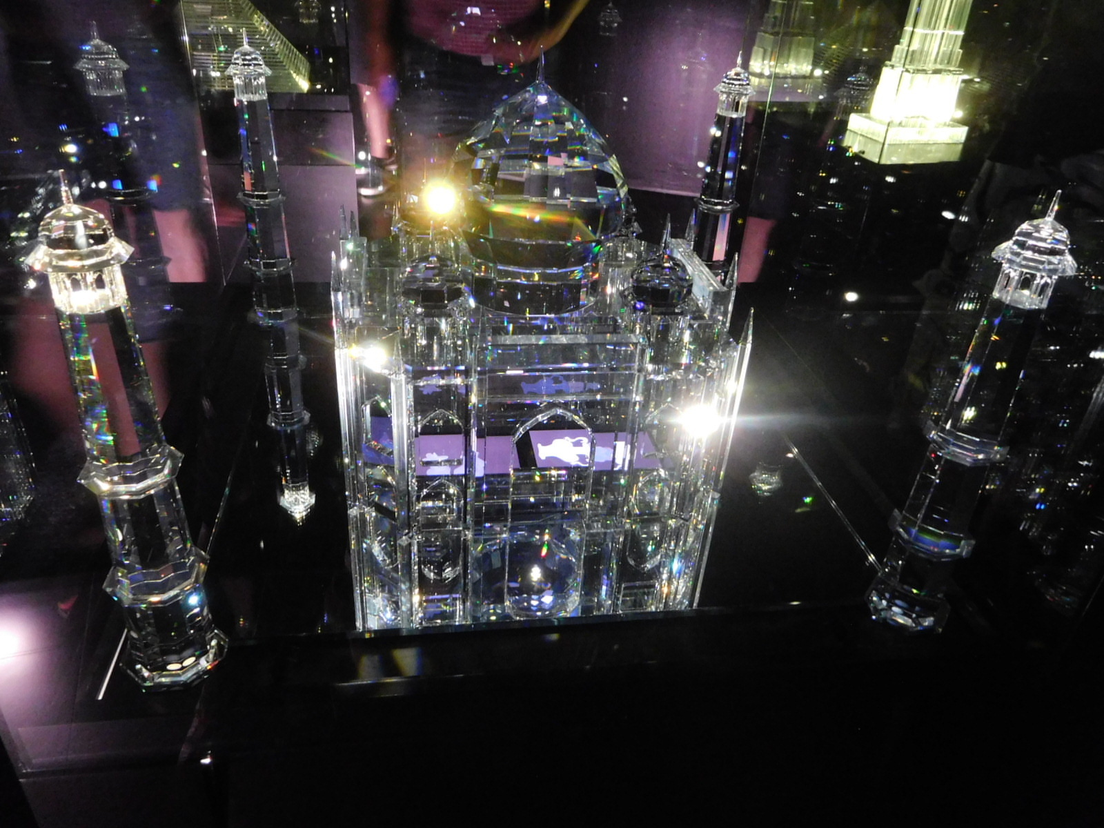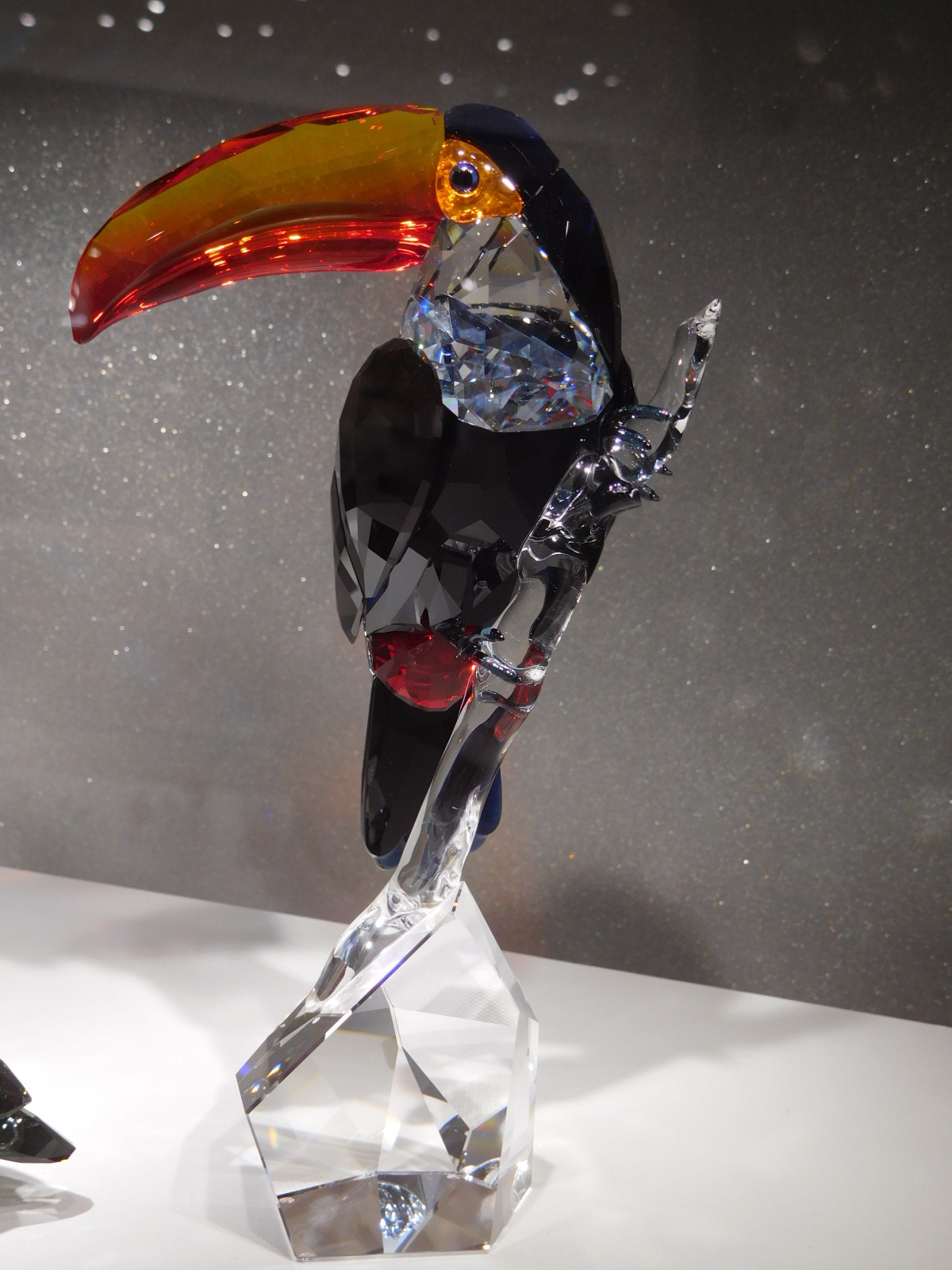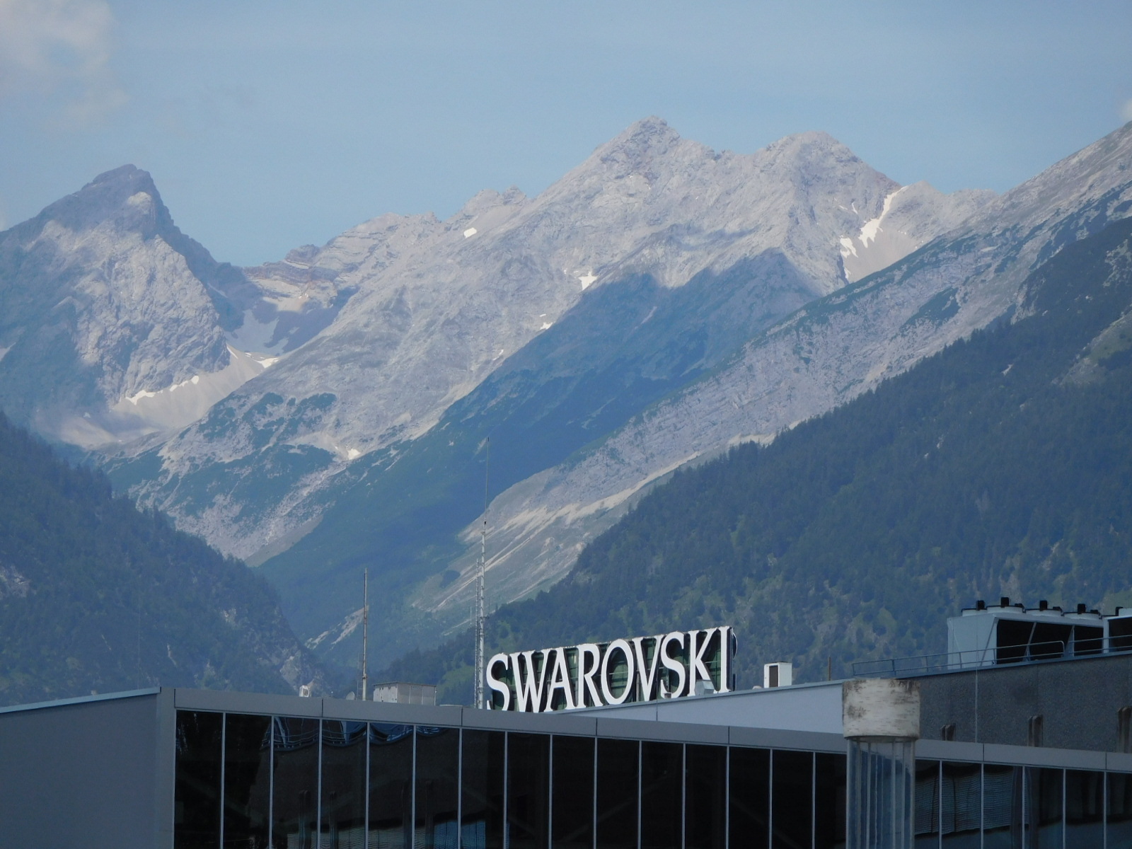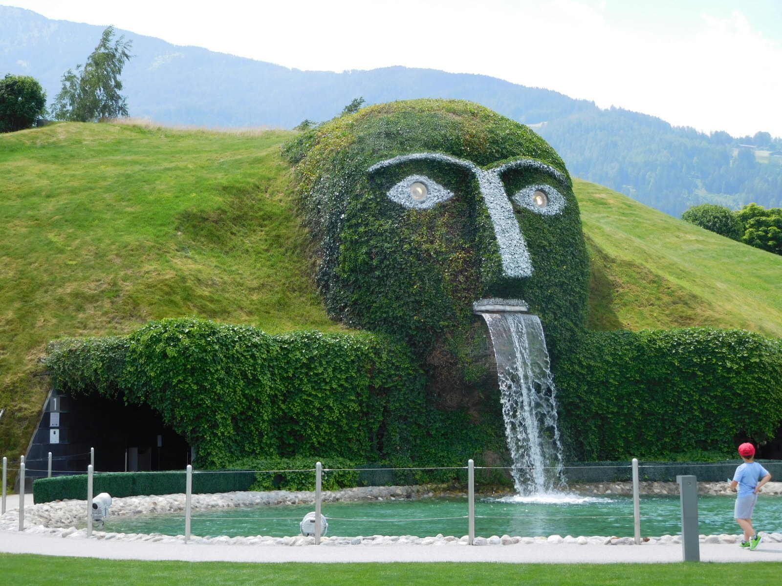 Within 20 kms of Innsbruck we came to Wattens. Wattens is the home of Swarovski, which is in Europe a very famous maker of jewel like crystal (plus other related stuff, like abrasives). In most towns there is a Swarovski store, featuring crystal jewellery. Because of being the home base of the company (and origin town of the founding family), Wattens has Swarovski Crystal World. We passed by here in 2014 and visited the centre. At the time I remarked on being surprised that rather than being the story of how crystal is made and marketed, Crystal World is actually an art exhibit, featuring installations that each in its unique way takes advantage of crystal and light. Dodie chided me for only being concerned with machines, or maybe machines and economics vs art, but anyway I was willing to give it another go. There was also the prospect that eis could be found inside, which would be my other main interest.