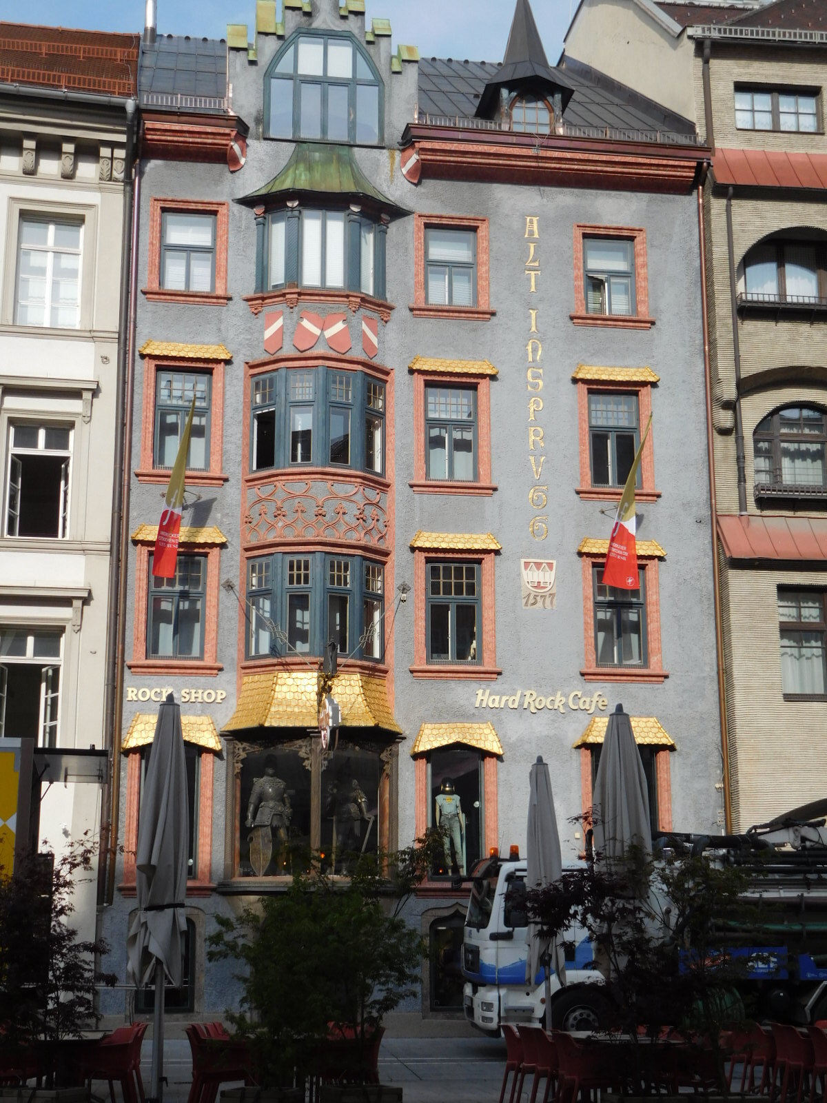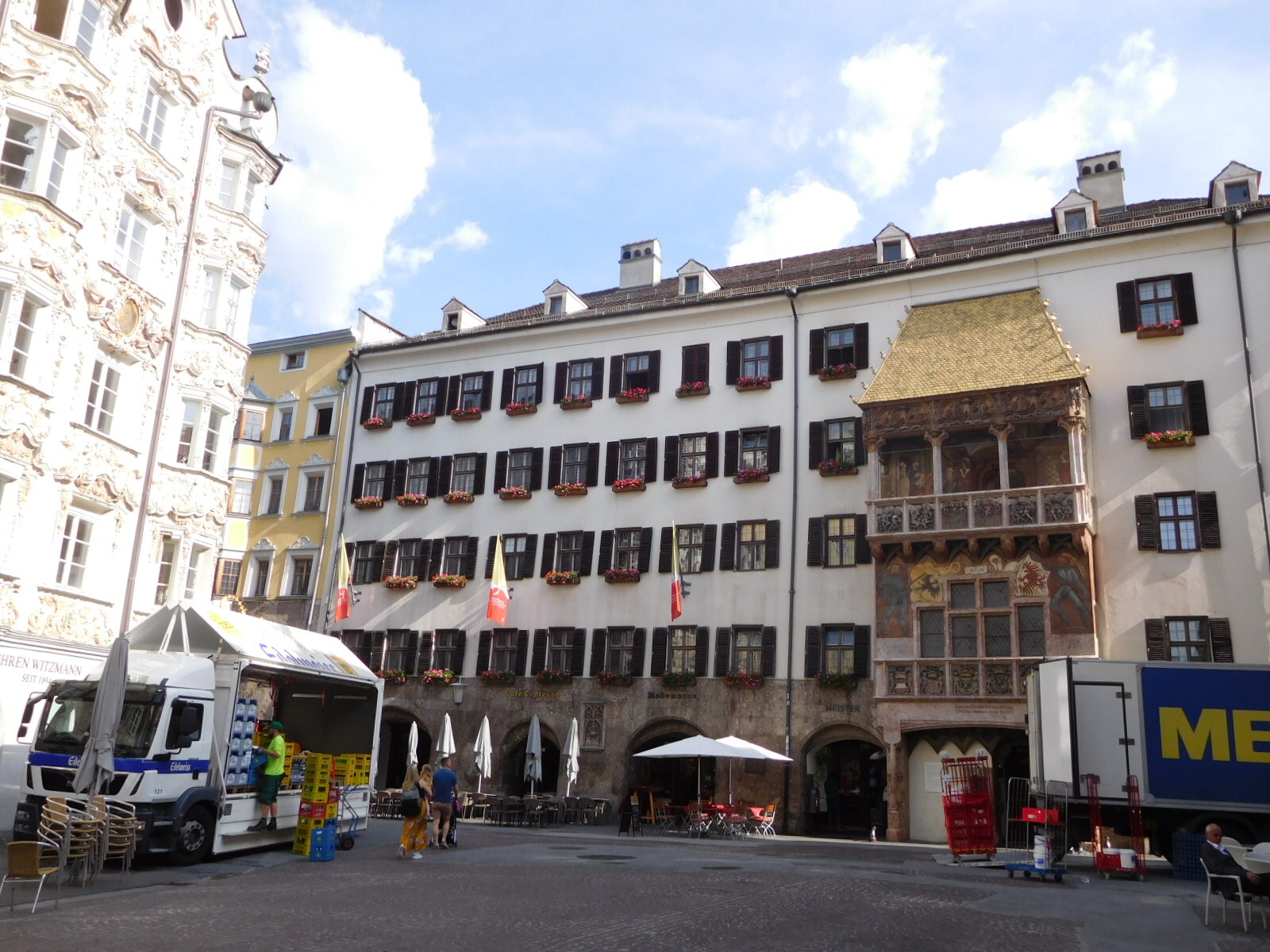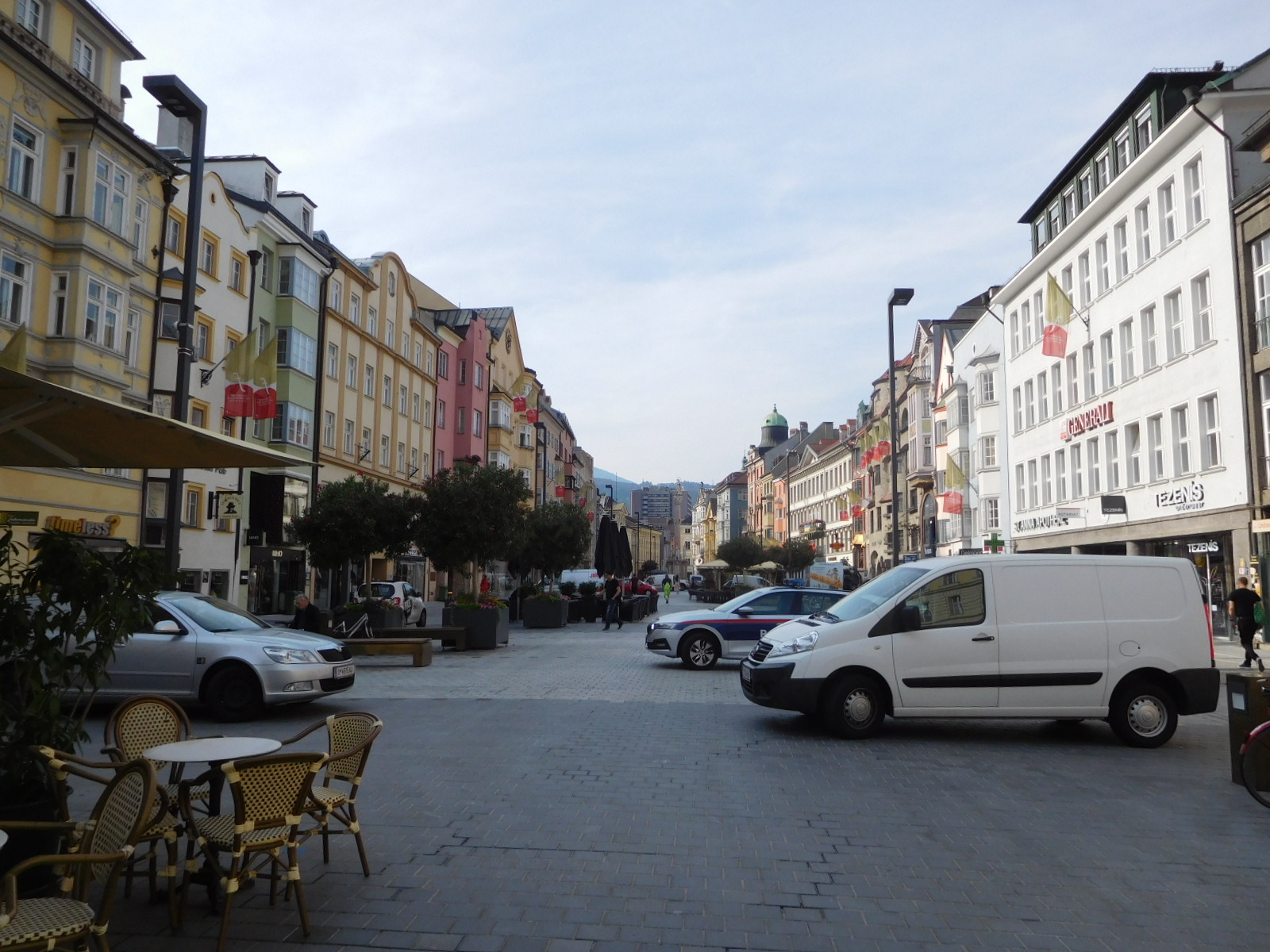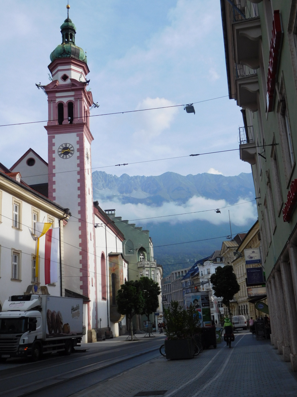 We set out to find the main downtown street, which is called Maria Theresian Strasse, and on the way had a look at the general appearance of Innsbruck buildings and streets. The buildings are large and often decorated, and it goes without saying that there are no modern skyscrapers, wide busy boulevards, overpasses, or any nonsense like that in the Altstadt. In fact, perhaps because of the holiday today, the main city streets were very quiet and quite empty. One thing that was present were delivery trucks, parked with uncanny accuracy in front of the best photo opportunities!
