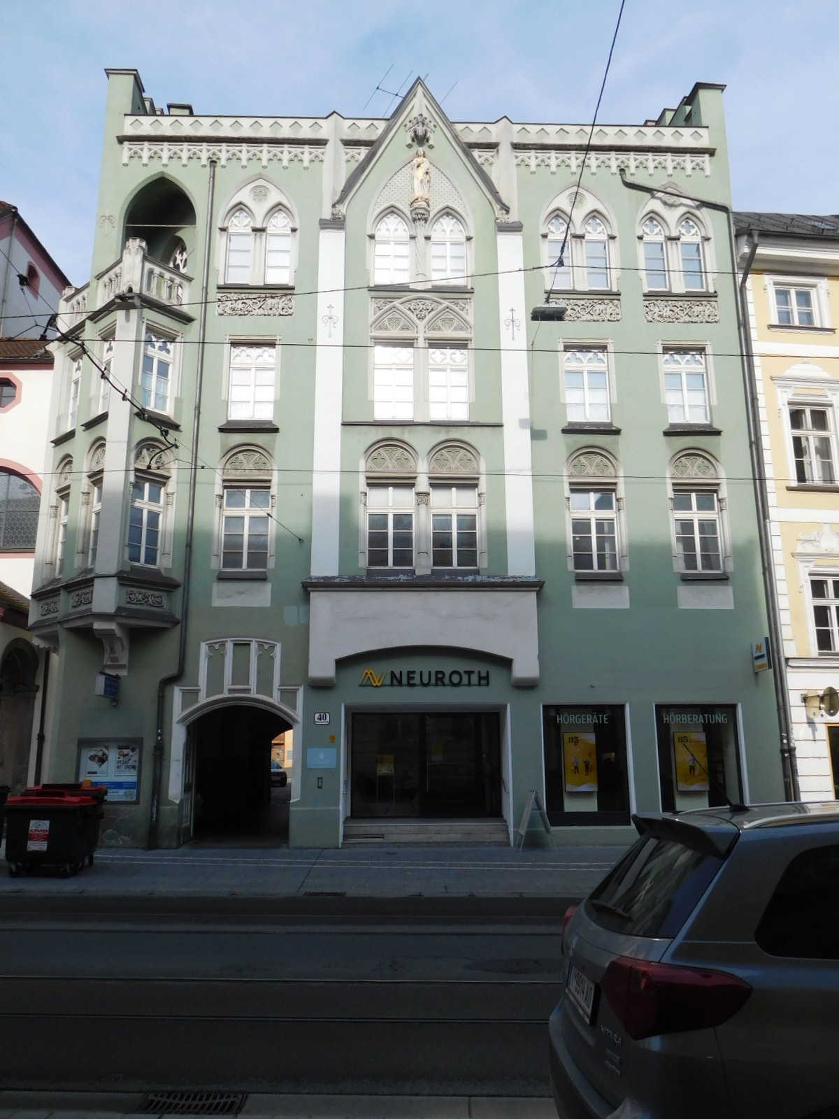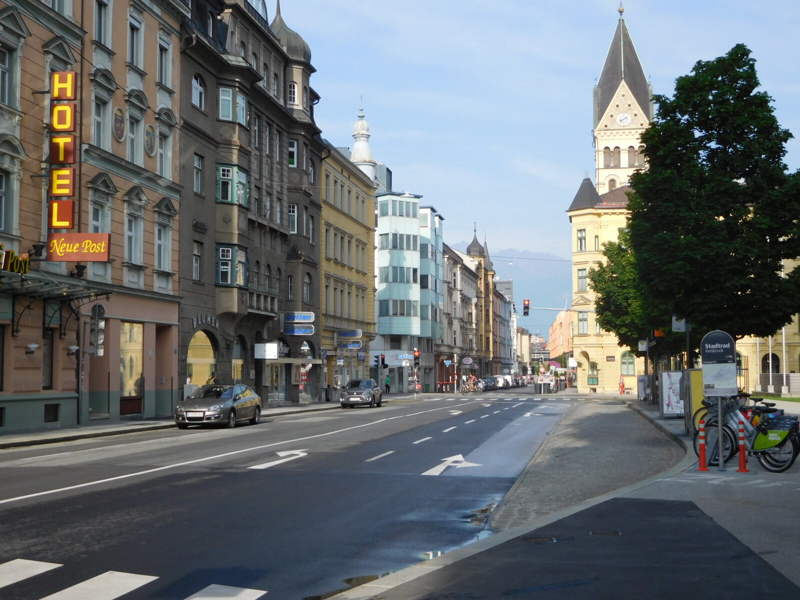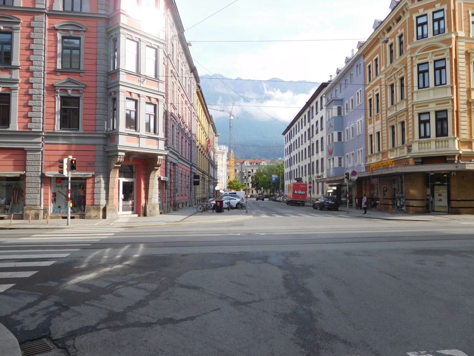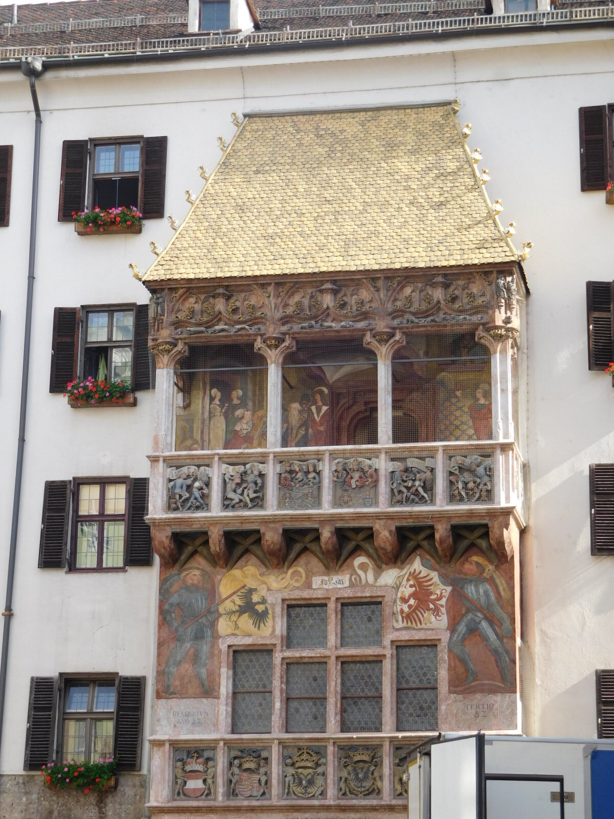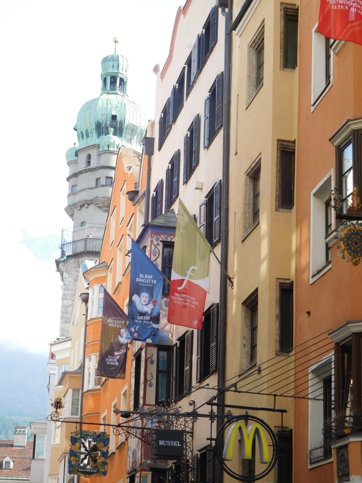 We set out to find the main downtown street, which is called Maria Theresian Strasse, and on the way had a look at the general appearance of Innsbruck buildings and streets. The buildings are large and often decorated, and it goes without saying that there are no modern skyscrapers, wide busy boulevards, overpasses, or any nonsense like that in the Altstadt. In fact, perhaps because of the holiday today, the main city streets were very quiet and quite empty. One thing that was present were delivery trucks, parked with uncanny accuracy in front of the best photo opportunities!