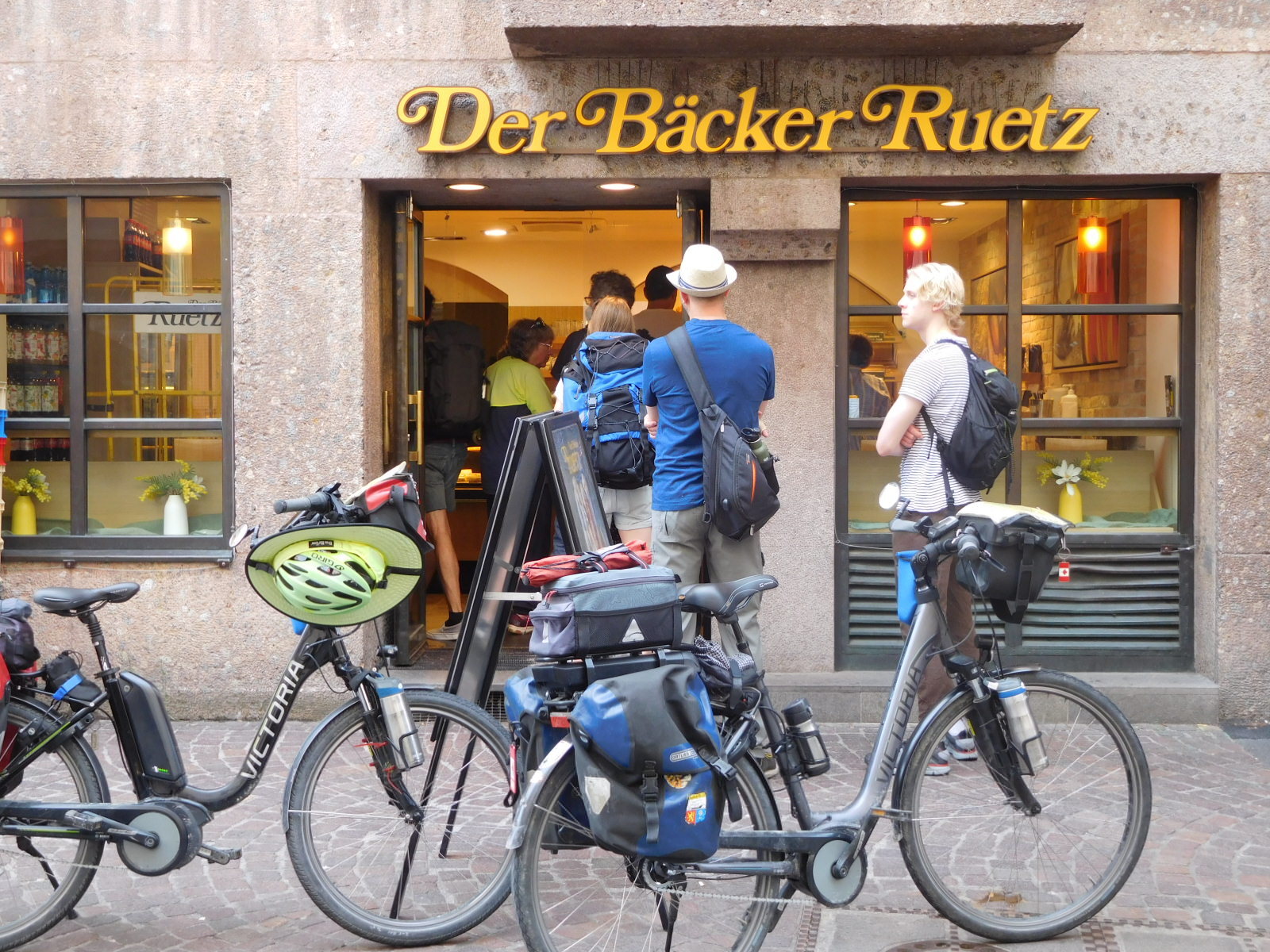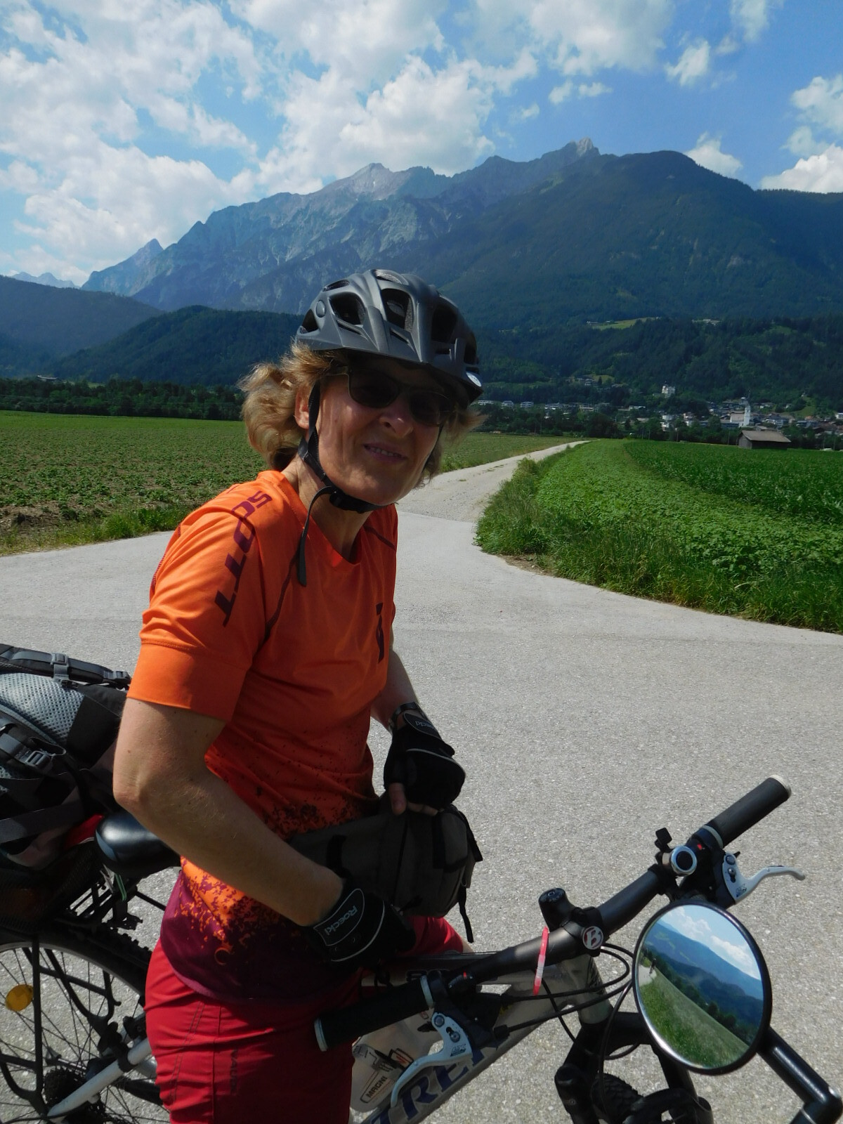 Beyond Wattens, the path remained flat and smooth, and the scenery spectacular. At some point a lady asked about our DaBrim visors, which is such a Usual Question. The lady, Elena, continued with other UQs, and showed a lot of patience riding along at our speed. I also asked some questions, finding that she was Innsbruck born and bred, and that she works as a German second language teacher. The conversation touched on many subjects. For example, I was able to learn what snow conditions are like here in Winter, in town vs in the mountains (streets in town are snow covered only for a few weeks, most likely in January and February).