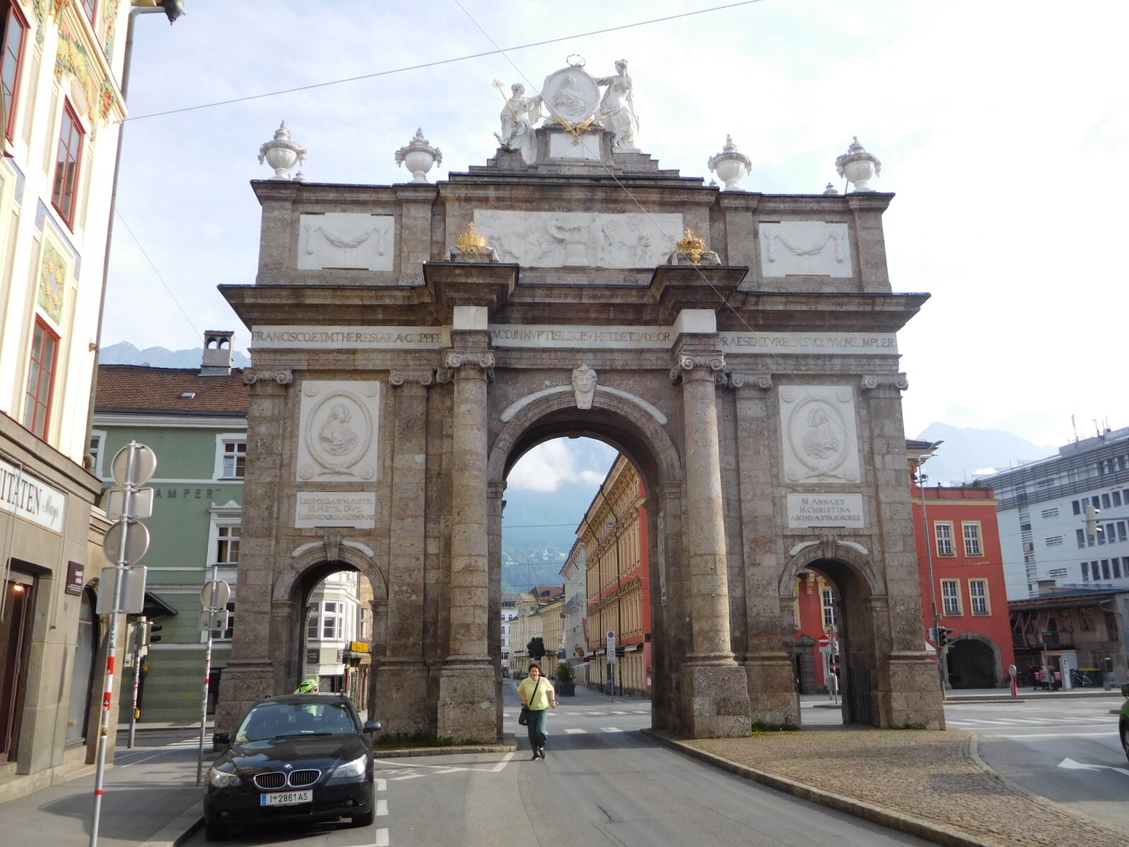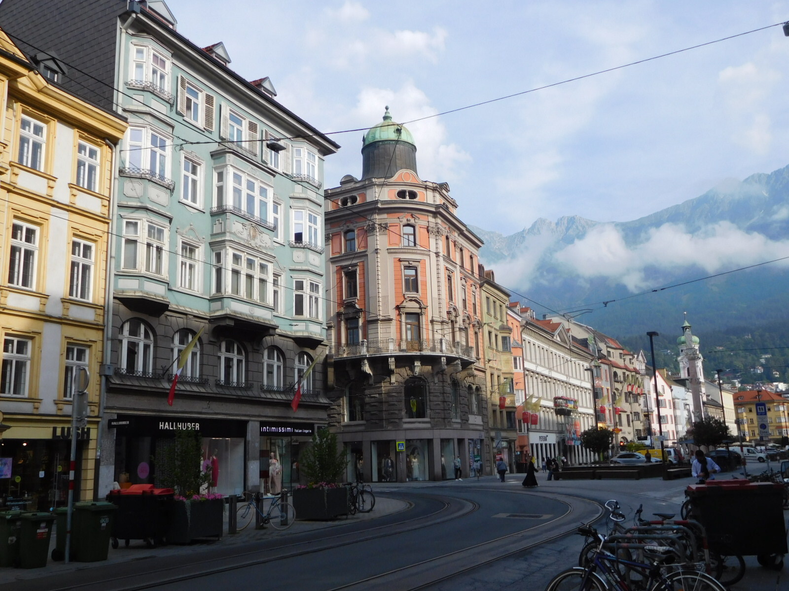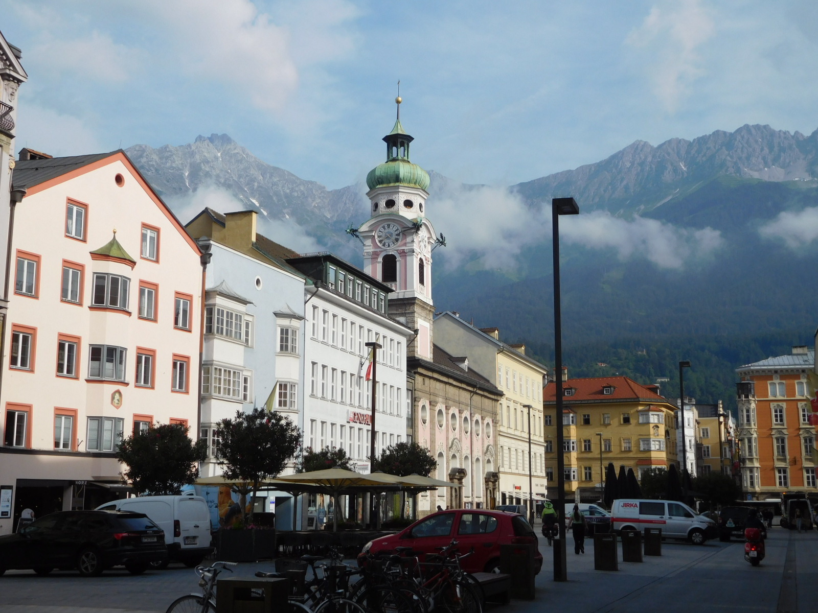 We knew we had time today, because the quirks of finding places to stay put us in Jenbach for tonight, a mere 46 km away. So we set out for a bit of a closer look at Innsbruck. The "market" is always a good starting point. Innsbruck does not have a big market square, with lots of vendors bringing in produce. But there is an indoor market, which is sort of ok. We had a quick peek at it, and I was also happy because the lady in the bakery there understood my German and did not have to make any corrections. Of course when you are sticking with mohn schnecke you can't really go wrong!