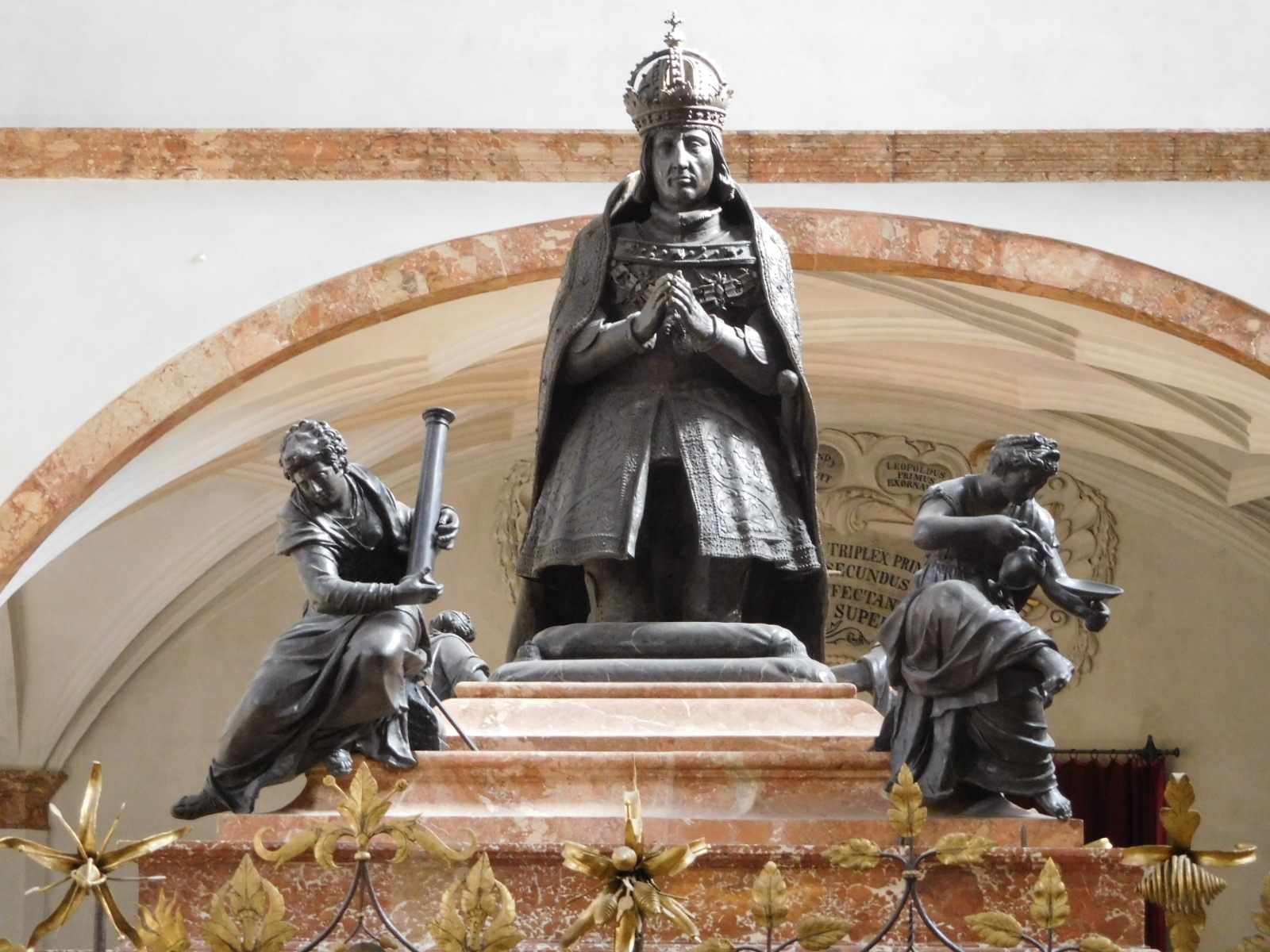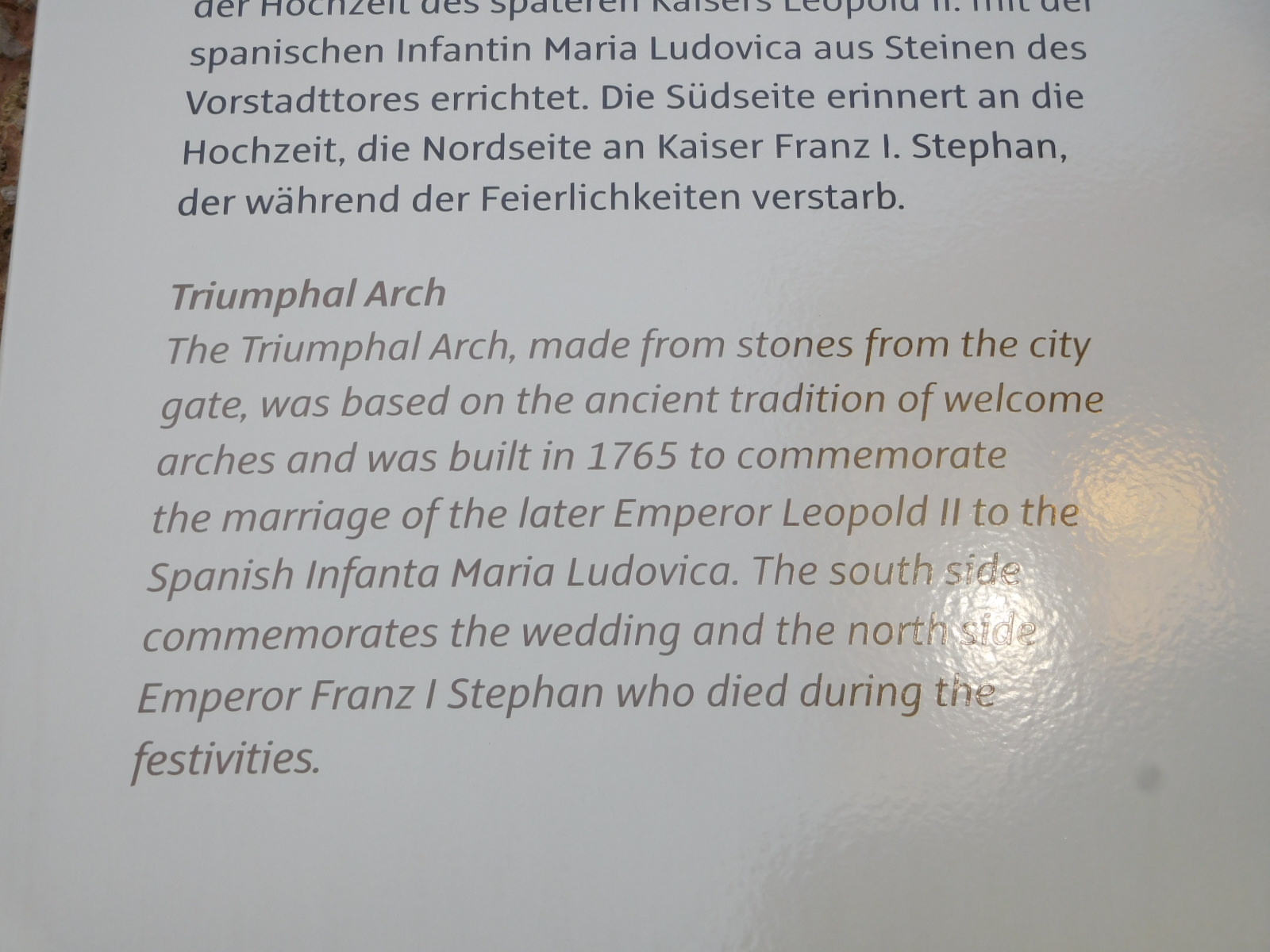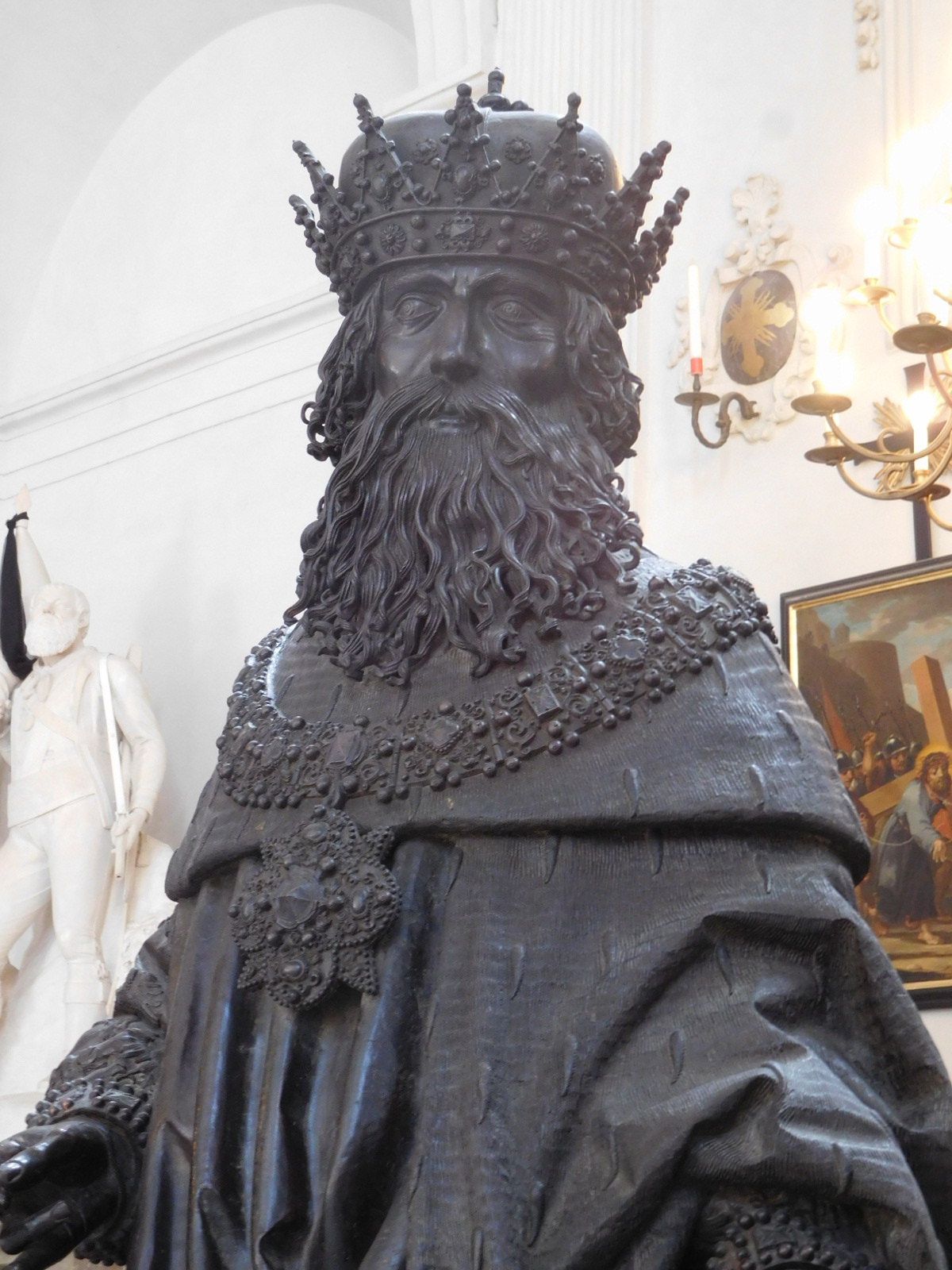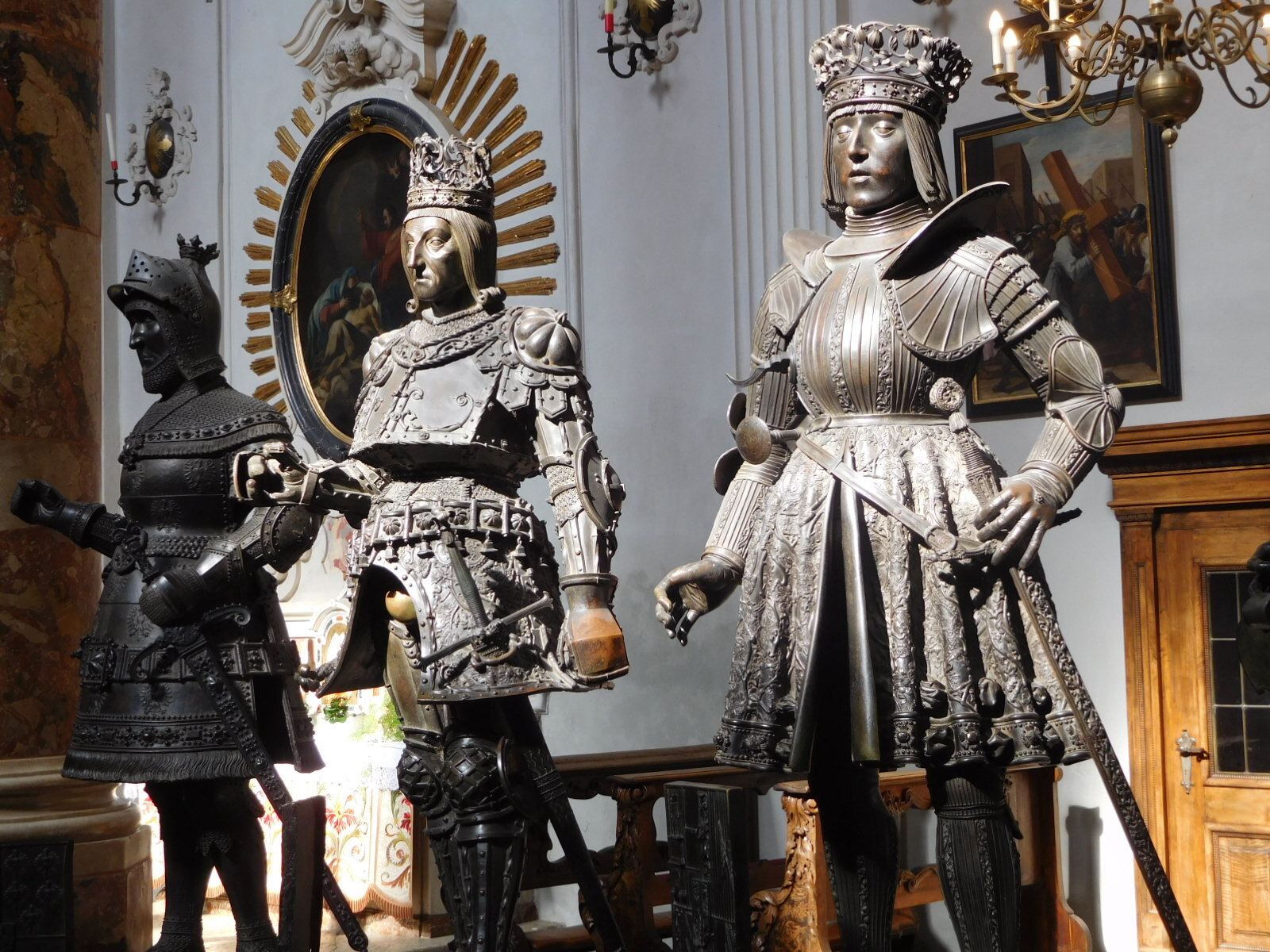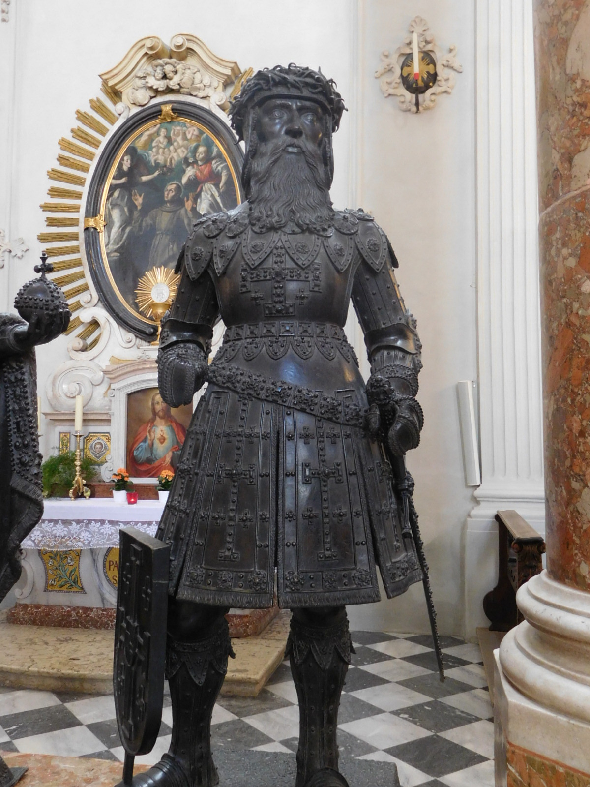 We actually did check out a couple of additional churches, but are mercifully skipping over them, and a lot of other stuff! But one over the top one has made it in here. It is the Franciscan church. This has a lot of fancy plaster work, marble, and wood carving, but distinguishes itself with long rows of slightly greater than life size statues of knights and ladies, kings and bishops, and such. In the middle on an elevated platform is the image of presumably the Emperor. The whole presentation seems focussed on court and power. Even though, for example, in Salzburg, political and religious power were one, you did not get a sense of that in the church. It would be interesting to learn more about how these figures came to be here. Actually there is an adjoining museum that includes this church. A visit there would have been illuminating, but hey, we don't quite have all day.