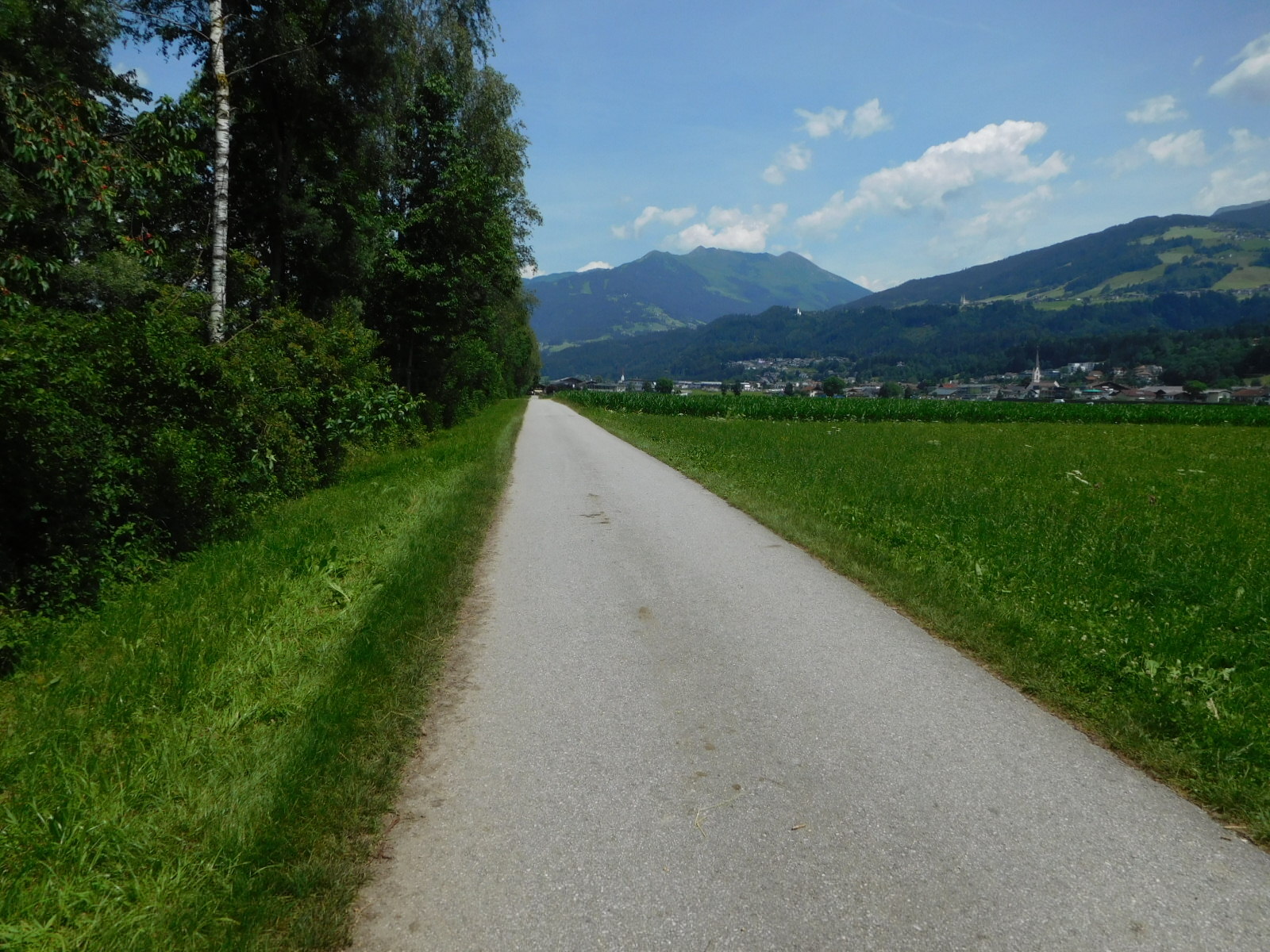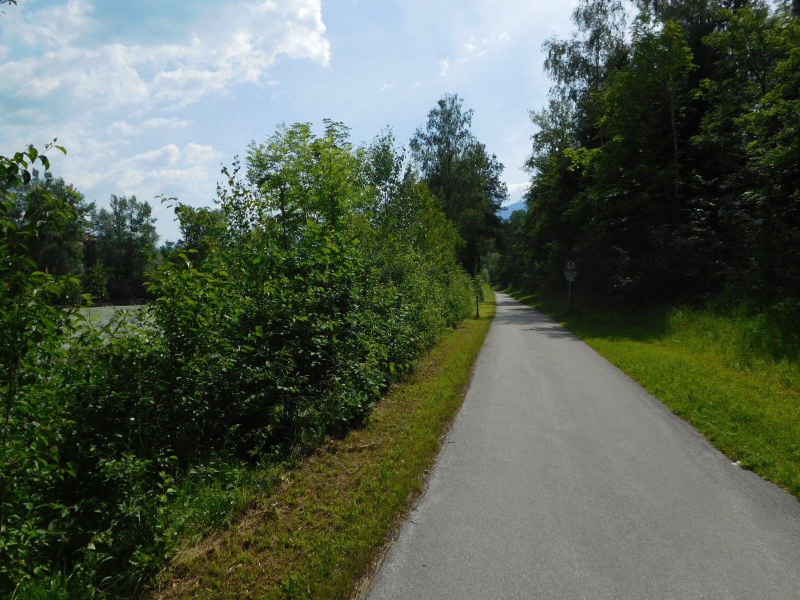 The path out of Innsbruck ran by the river for a time, or just ran through flat countryside. There was a fair amount of twiddling, following the signs this way and that, and a fair number of brief on road stretches or road crossings. Of most note was the large number of cyclists on the path, and the now familiar conflict between the whizzing Tour de France wannabees and more normal folk. "Achtung!" was a familiar shout, from those who would not want to invest the extra weight in carrying a bell!