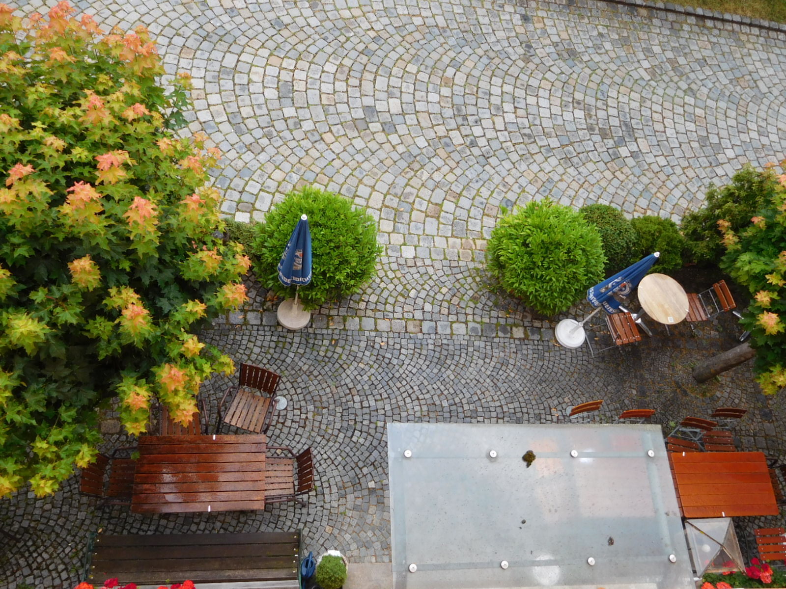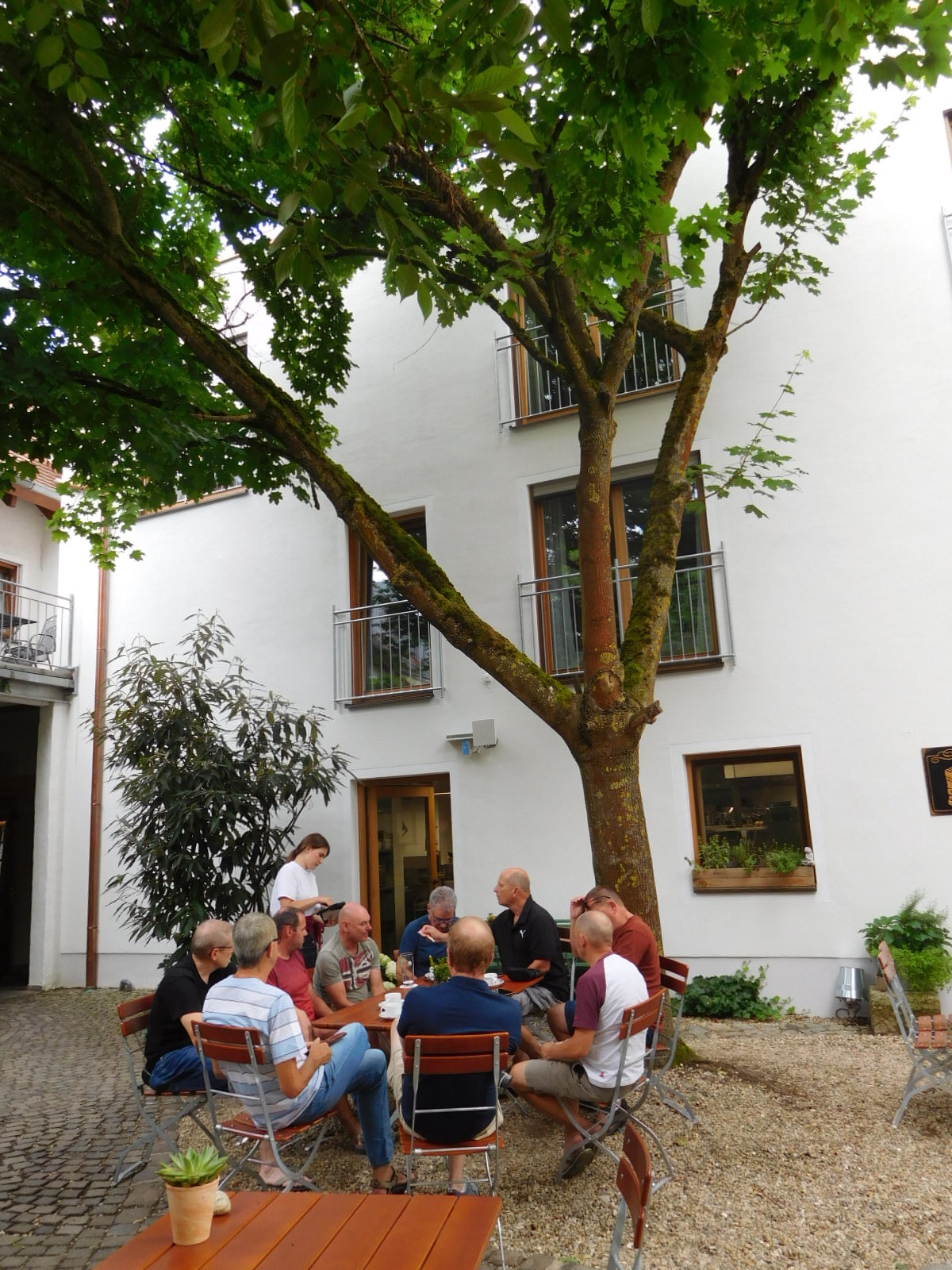 We could say it was great that the guesthouse gave us a room with such a nice view, and no doubt that is how they see it. But the room has another, sinister side. The window you are looking from is the only one in the small room, and if you want any air at all, the window has to be open. Now if you look out the window and down, you see that the room is above the restaurant/beer garden. This not only means a lot of animated talking, but also smoking.