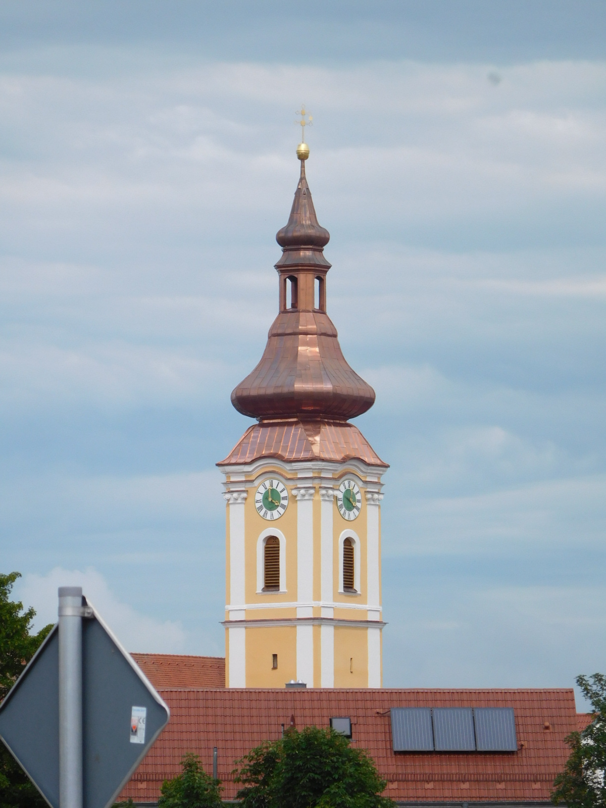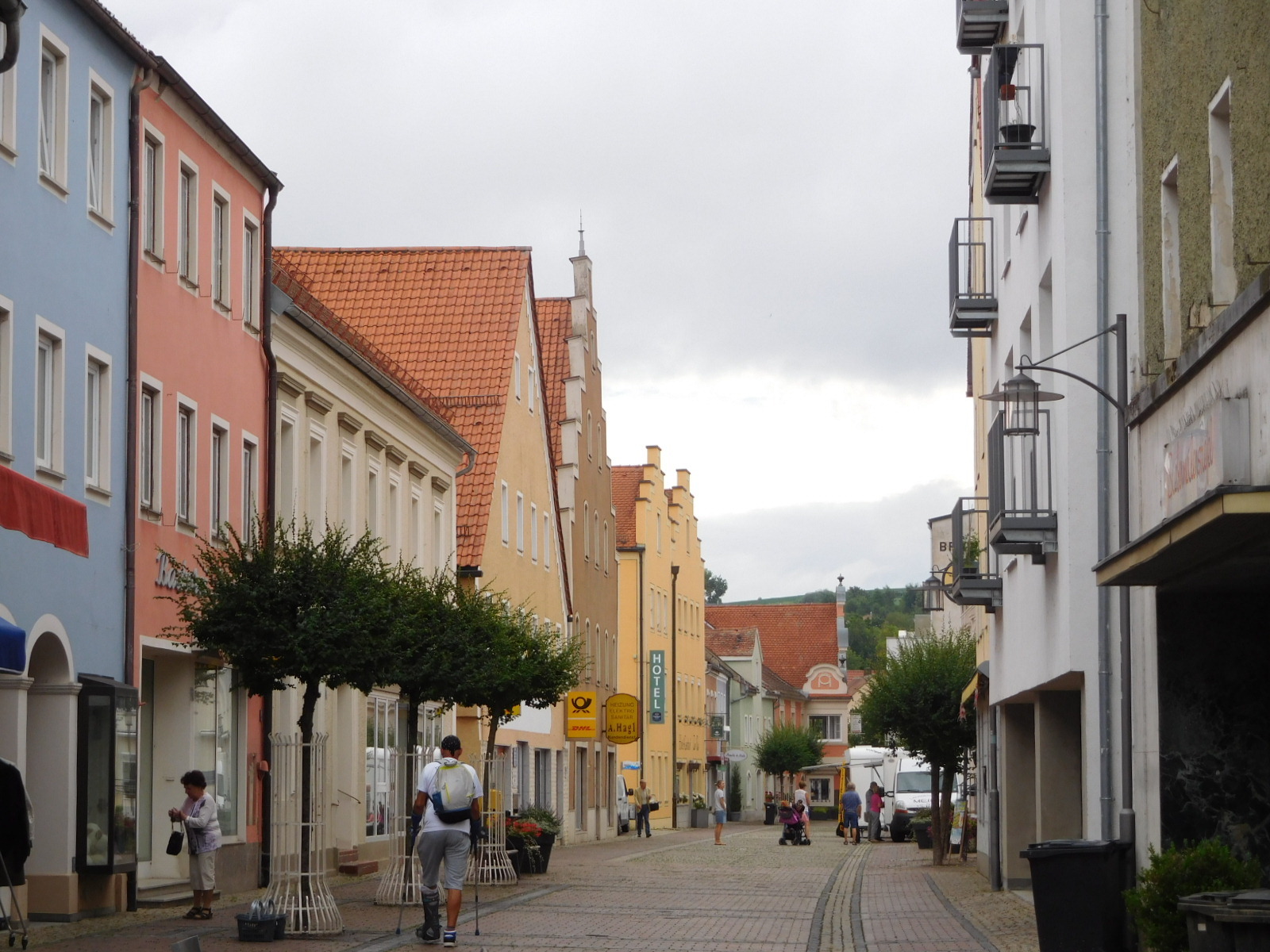 We entered the walking street of Bad Abbach, and found it to be pleasant, but relatively plain. It did have a bakery, though. Although we now did not particularly need any additional food, we reflexively went in. Actually as is customary, we sent Dodie in. But soon I decided to follow, just for a photo of the possible many goodies. But Dodie was already on her way out, saying not to bother because the selection was weak. Even so, our bags did get weighed down by some "emergency" schnitten.