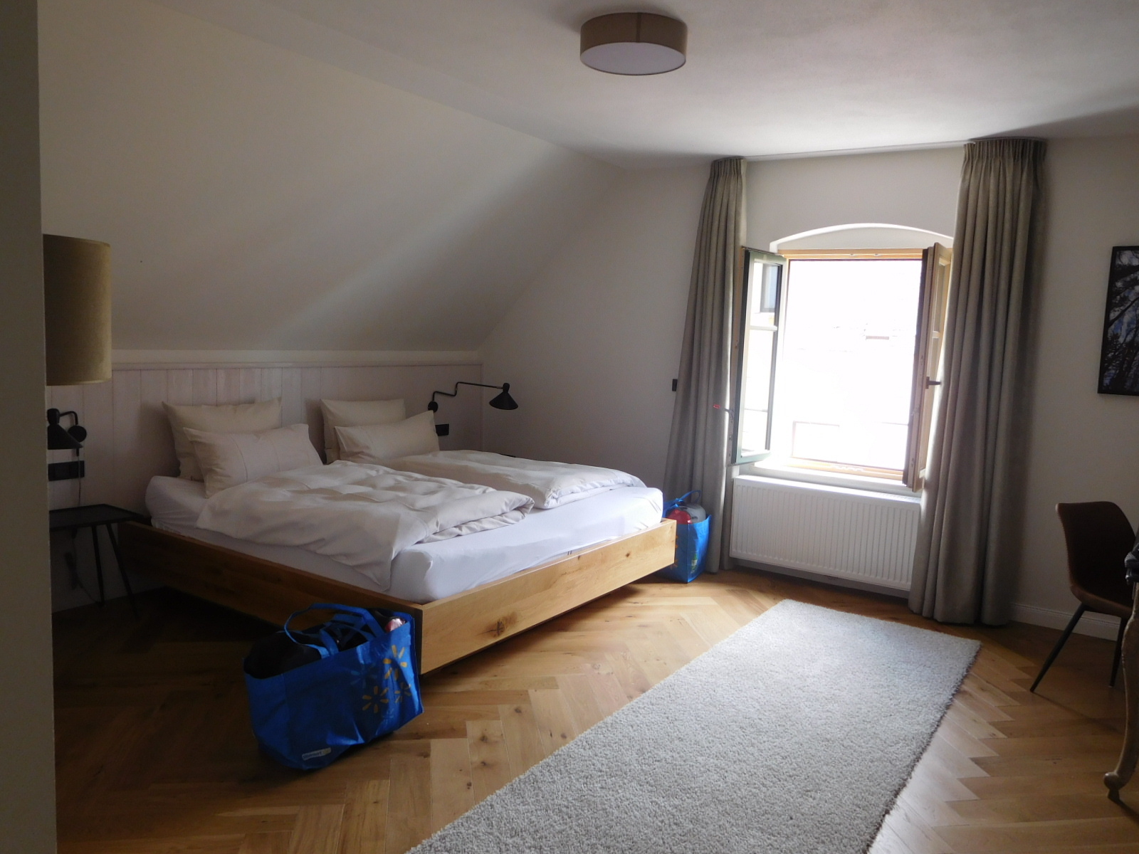 This time I was determined to see if we could avoid the smokers and talkers, especially since this lodging was part of a brewery. I asked the woman at checkin about a quiet room away from the action, and she said here is the key, go check it out. It turned out to be a huge and airy room, not looking out on the restaurant or beer garden. Great!