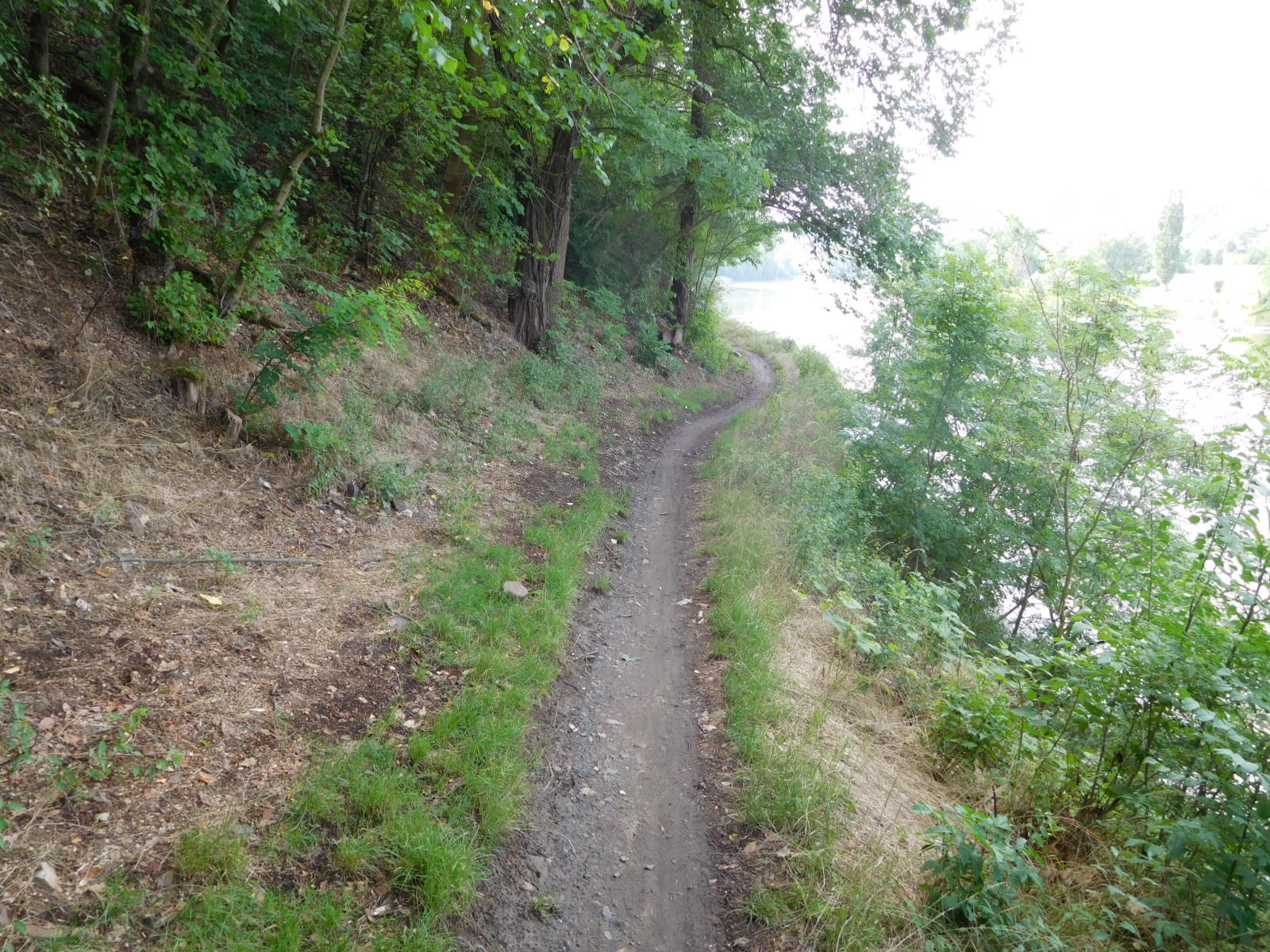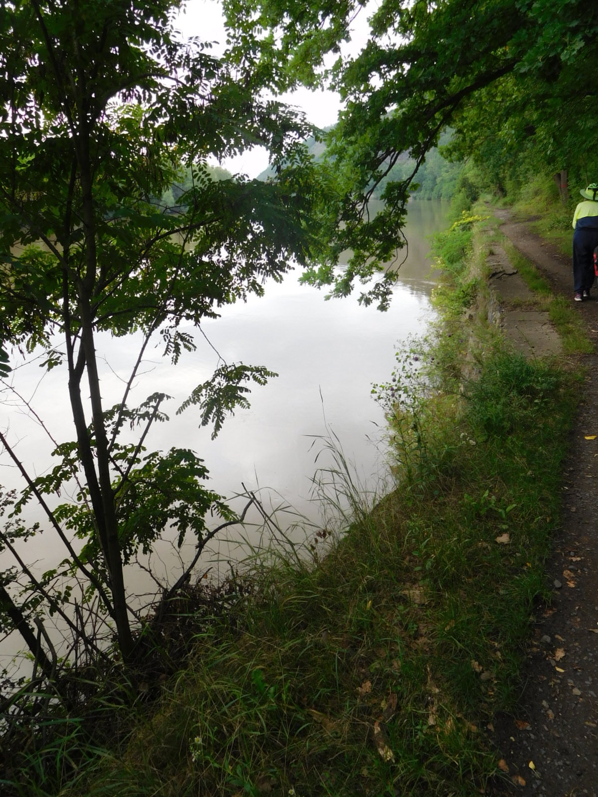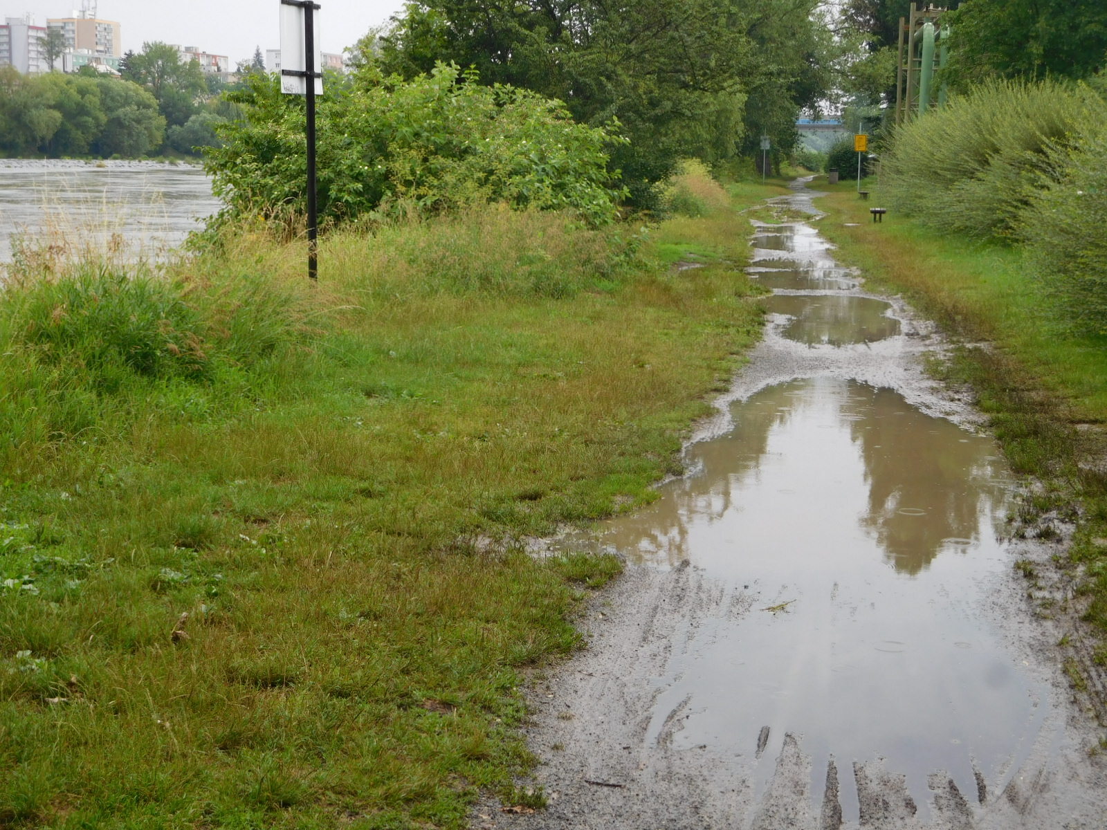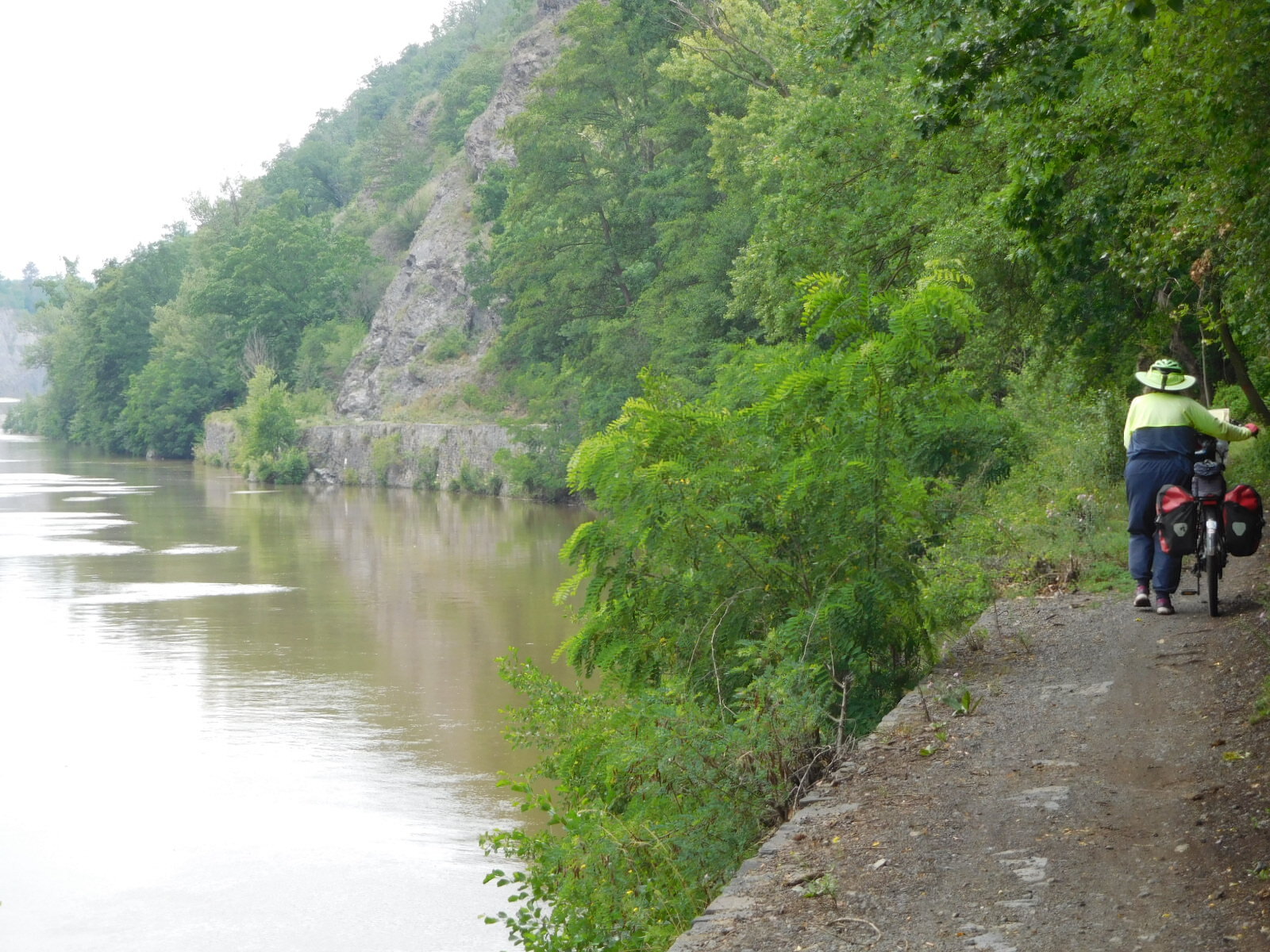 The footpath finally rejoined the official way, coming down from the hills, and the official way now proposed to follow the river. So we thought, we are getting with the program and the trail will be rideable now. Not! We walked further 5 km to a bridge, where the route crossed to the other side, at Kralupy. At this point the heavens decided to open, and a real deluge of rain came down. Despite our rain gear, we hid in an underpass with a bunch of other people for a good while.